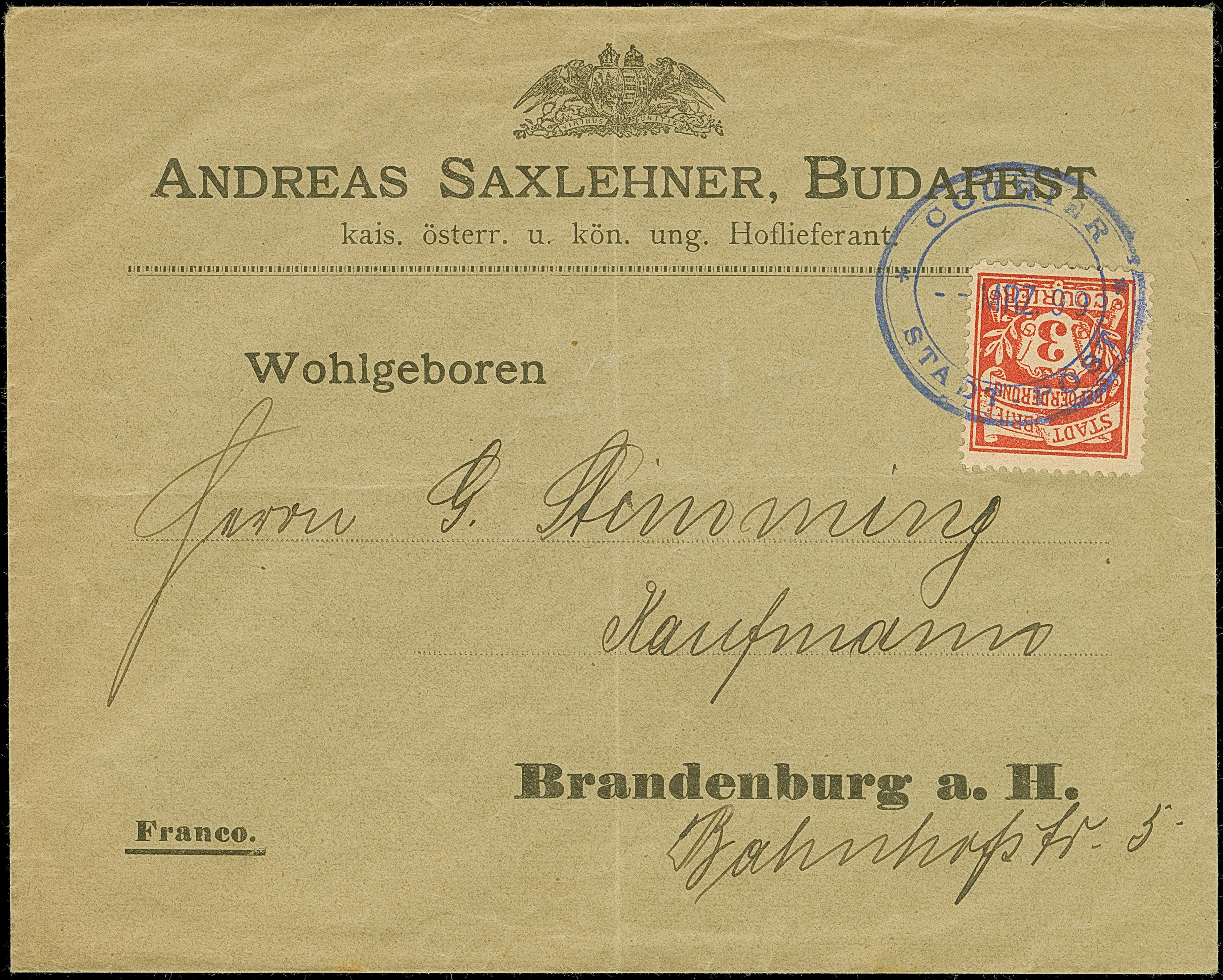 Auswärtiger Verkehr Courier-Stadtpost Spandau: 1899, 3 Pfg. rot mit blauem DKr. “COURIER STADT-POST MRZ.99” auf Vordruckbrief “Andreas Saxlehner, Budapest” nach Brandenburg. Der Umschlag mit waagerechter und senkrechter Faltung, ansonsten in einwandfreier Erhaltung. In dieser Verwendung äußerst selten