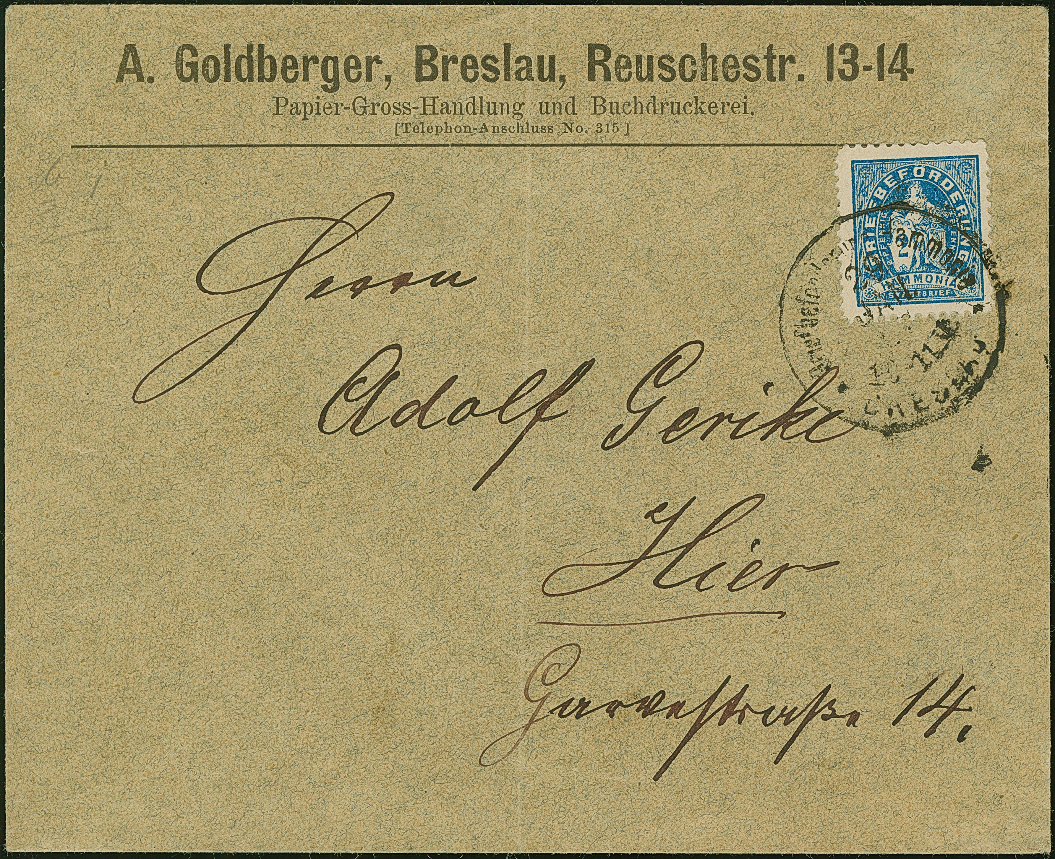 Breslau-Hammonia: 1886, Hamburg 2 Pfg. blau gez. 11½ mit Stempel “Briefbeförderung Hammonia BRESLAU 29.JAN…” auf Vordruckbrief “A. Goldberger, Breslau” im Ortsverkehr. Der Umschlag mit senkrechter Faltung, ansonsten in guter Erhaltung, selten