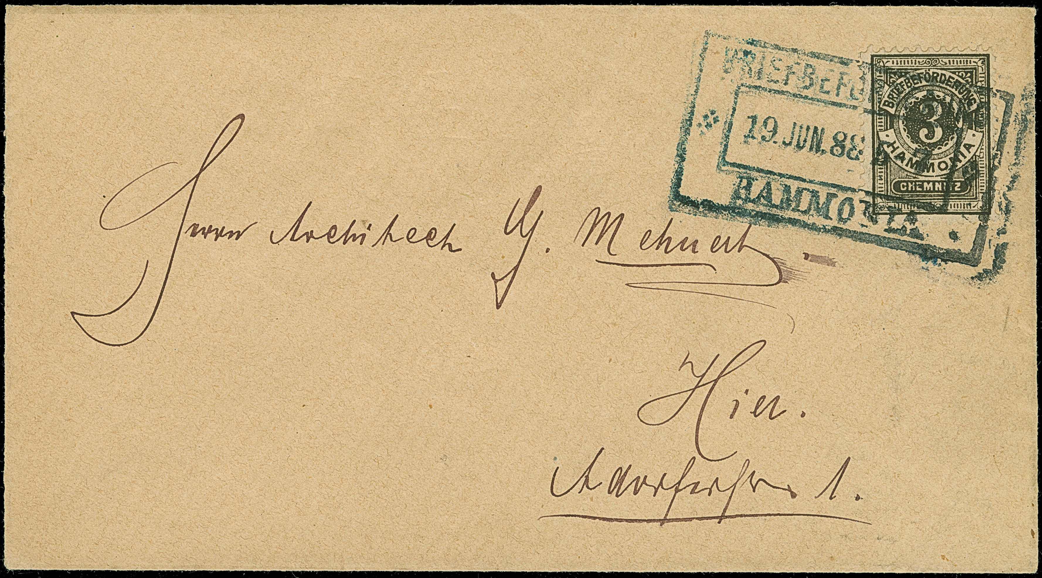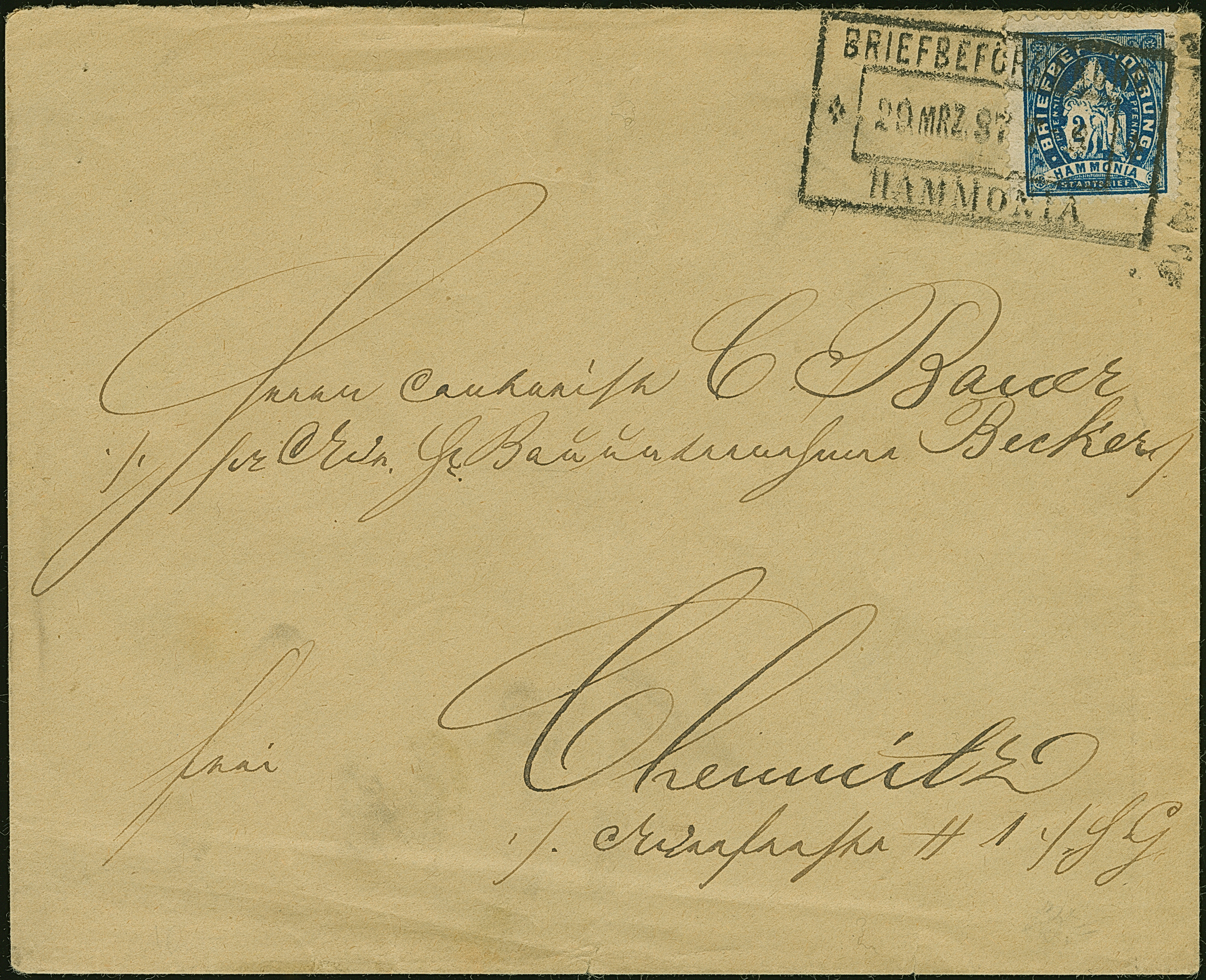Chemnitz-Hammonia: 1887, Hammonia Hamburg 2 Pfg. blau mit Inschrift “Stadtbrief” gez. L 11½ mit Stempel “BRIEFBEFÖRDERUNG HAMMONIA 20.MRZ.87” auf Ortsbrief. Der Umschlag mit senkrechter Faltung und Beförderungsspuren im Rand und die Marke hat einen leichten senkrechten Bug. Trotz der Einschränkungen eine seltene Verwendung in Chemnitz