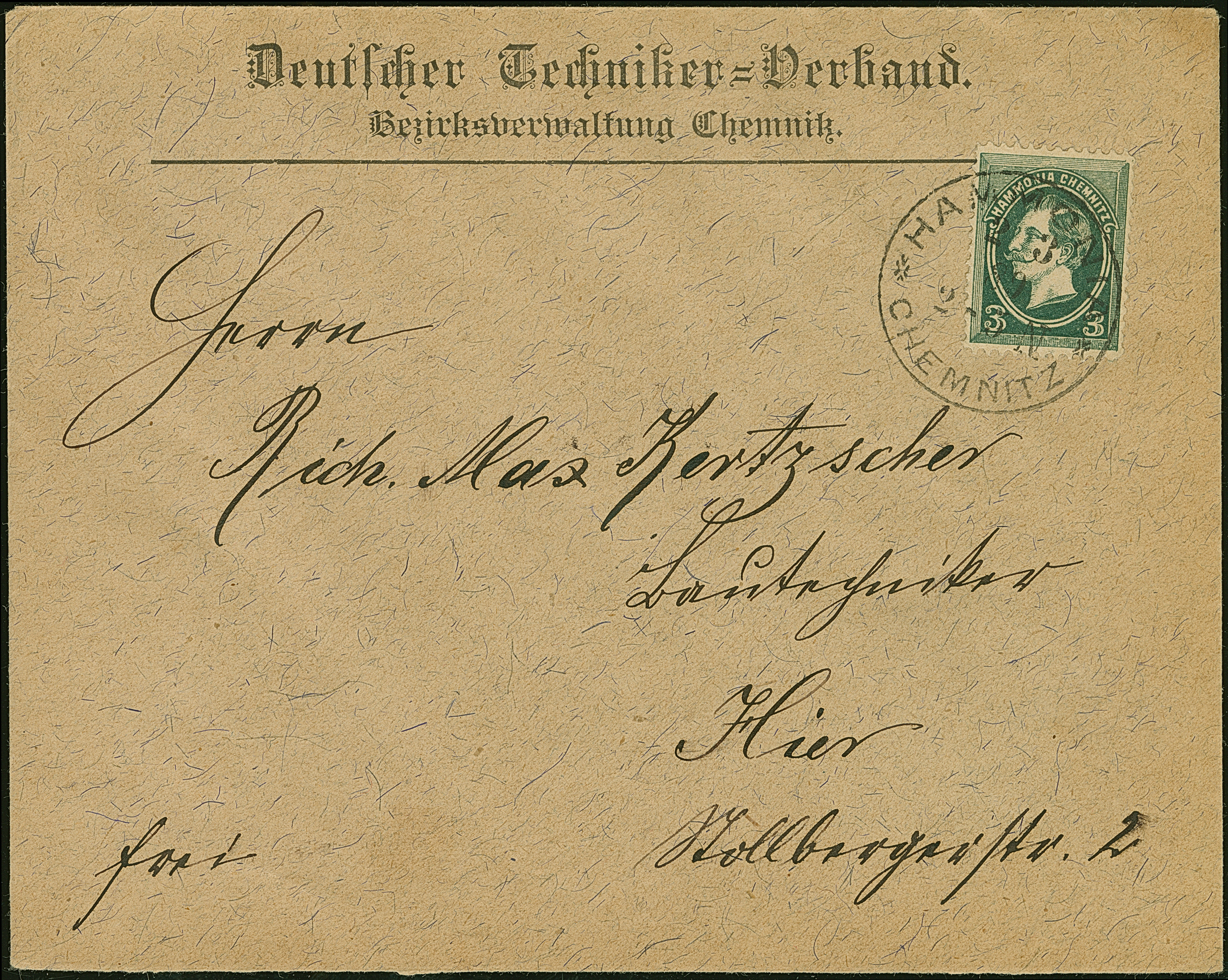 Chemnitz-Hammonia: 1889, Kaiser Wilhelm II. 3 Pfg. schwarzgrün mit Stempel “HAMMONIA CHEMNITZ 2.3.89” auf Vordruckbrief "Deutscher Techniker-Verband Bezirksverwaltung Chemnitz, in einwandfreier Erhaltung