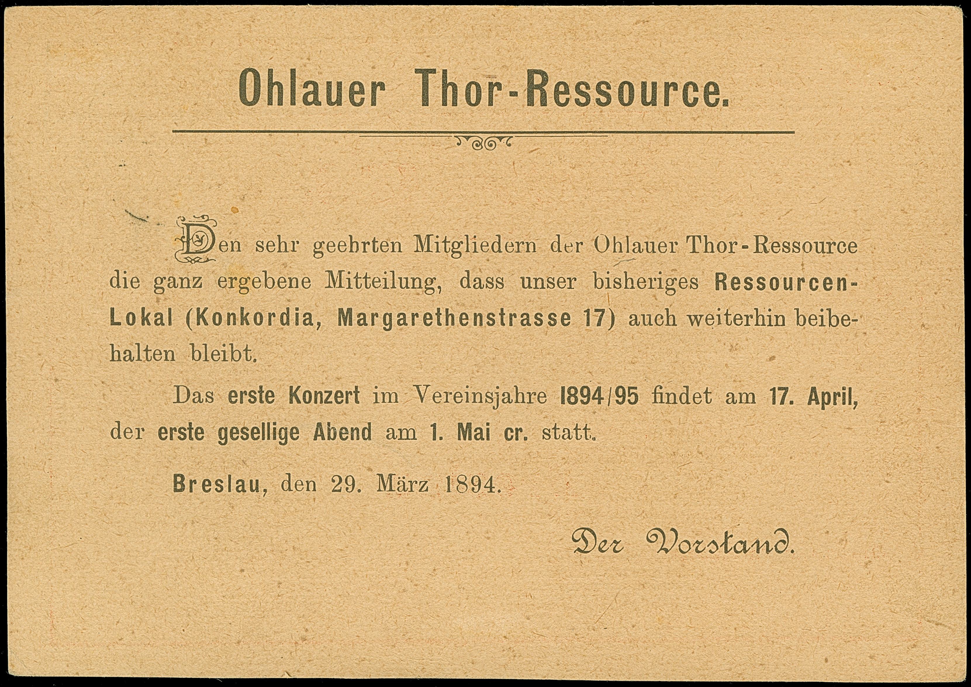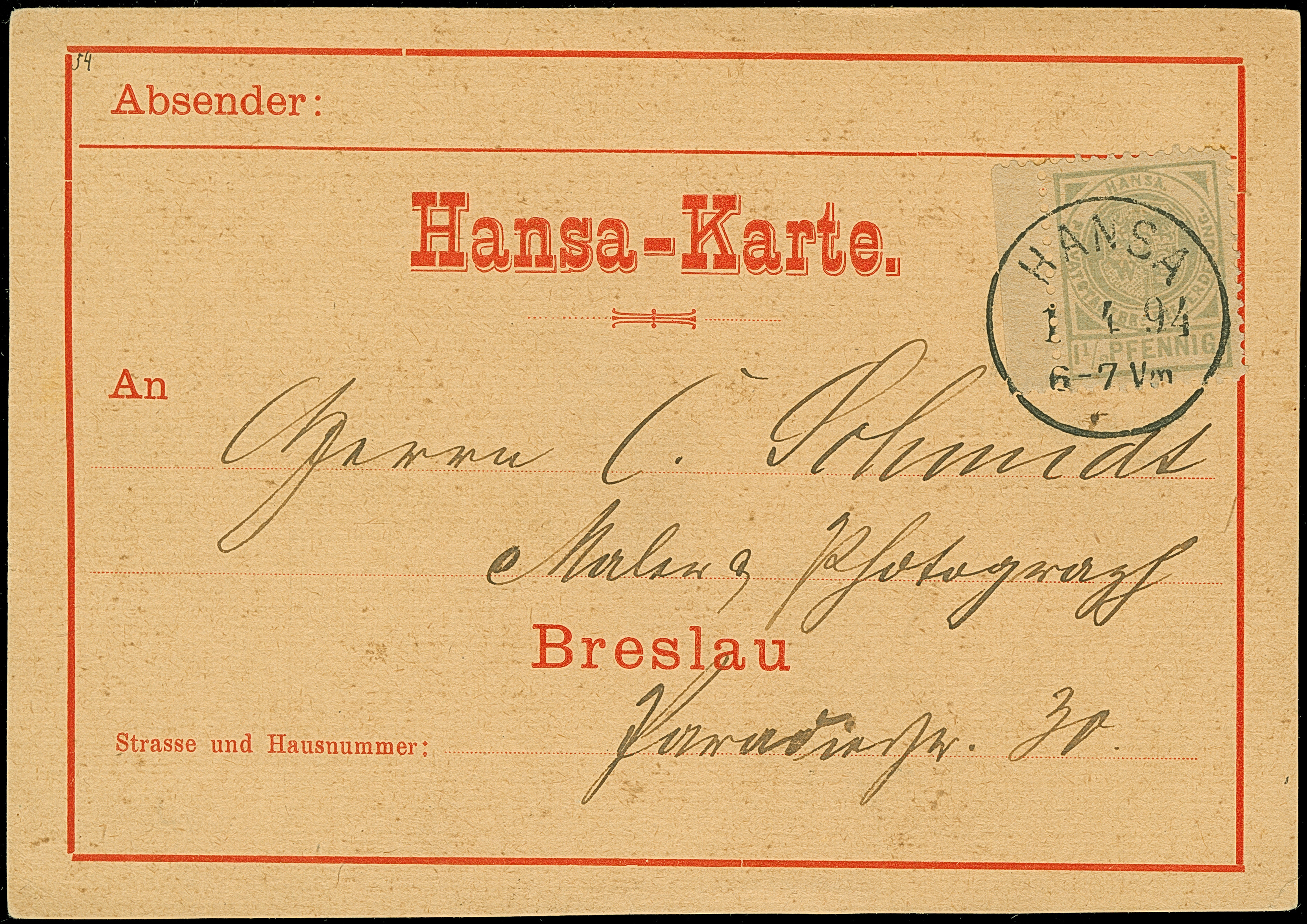 Hansa: 1893/94, Randstück 1½ olivgrau mit Stempel “HANSA 1.4.94” auf Hansa-Vordruckpostkarte mit roter Inschrift und rückseitigem Zudruck “Ohlauer Thor- Ressource” im Ortsverkehr, in einwandfreier Erhaltung