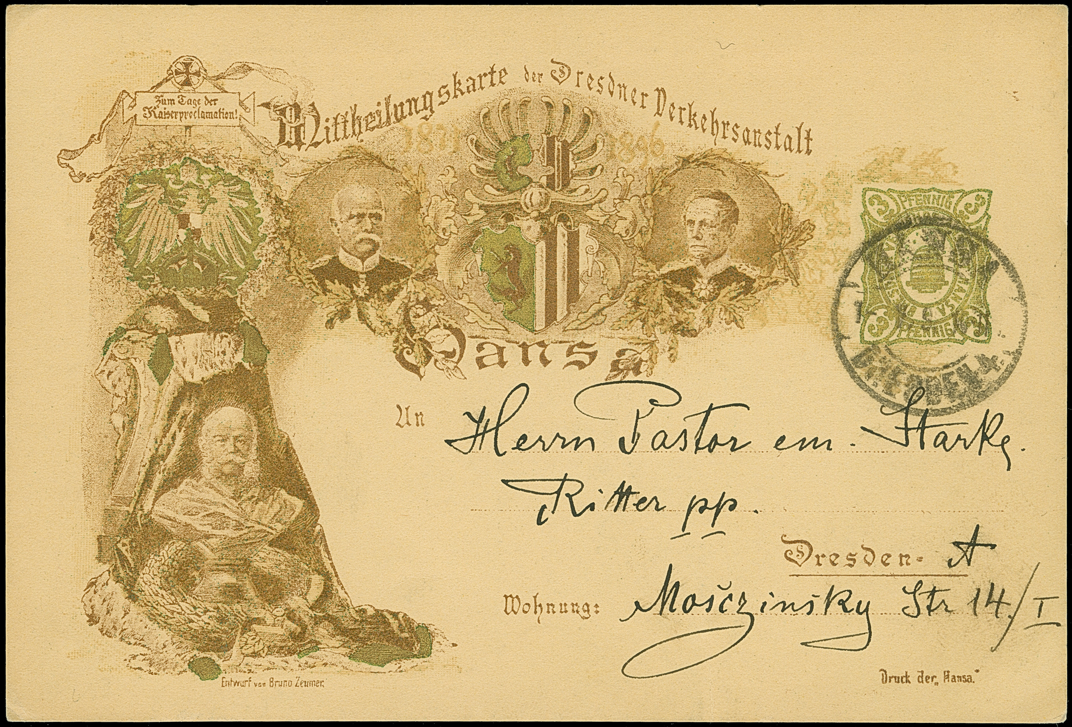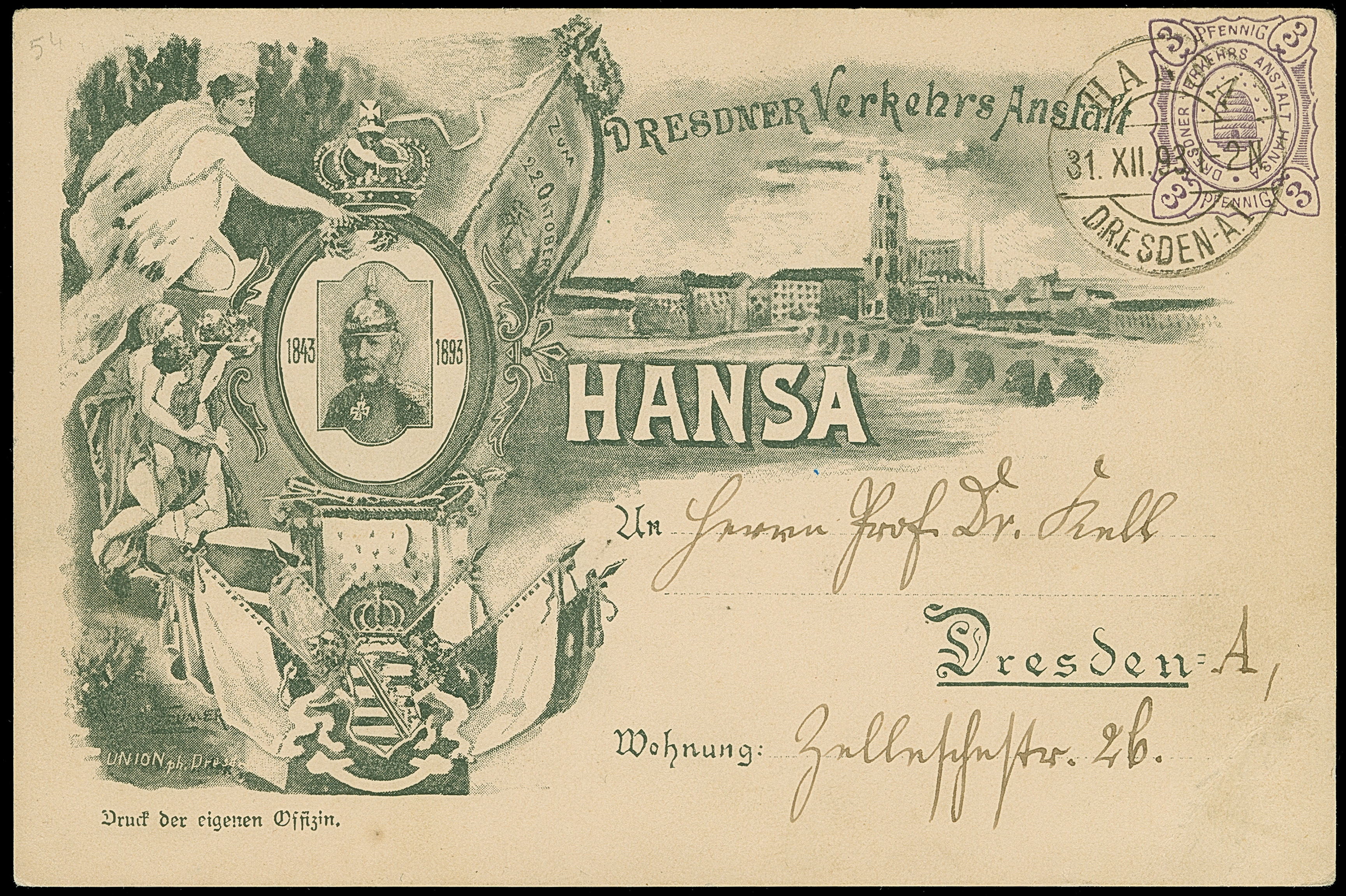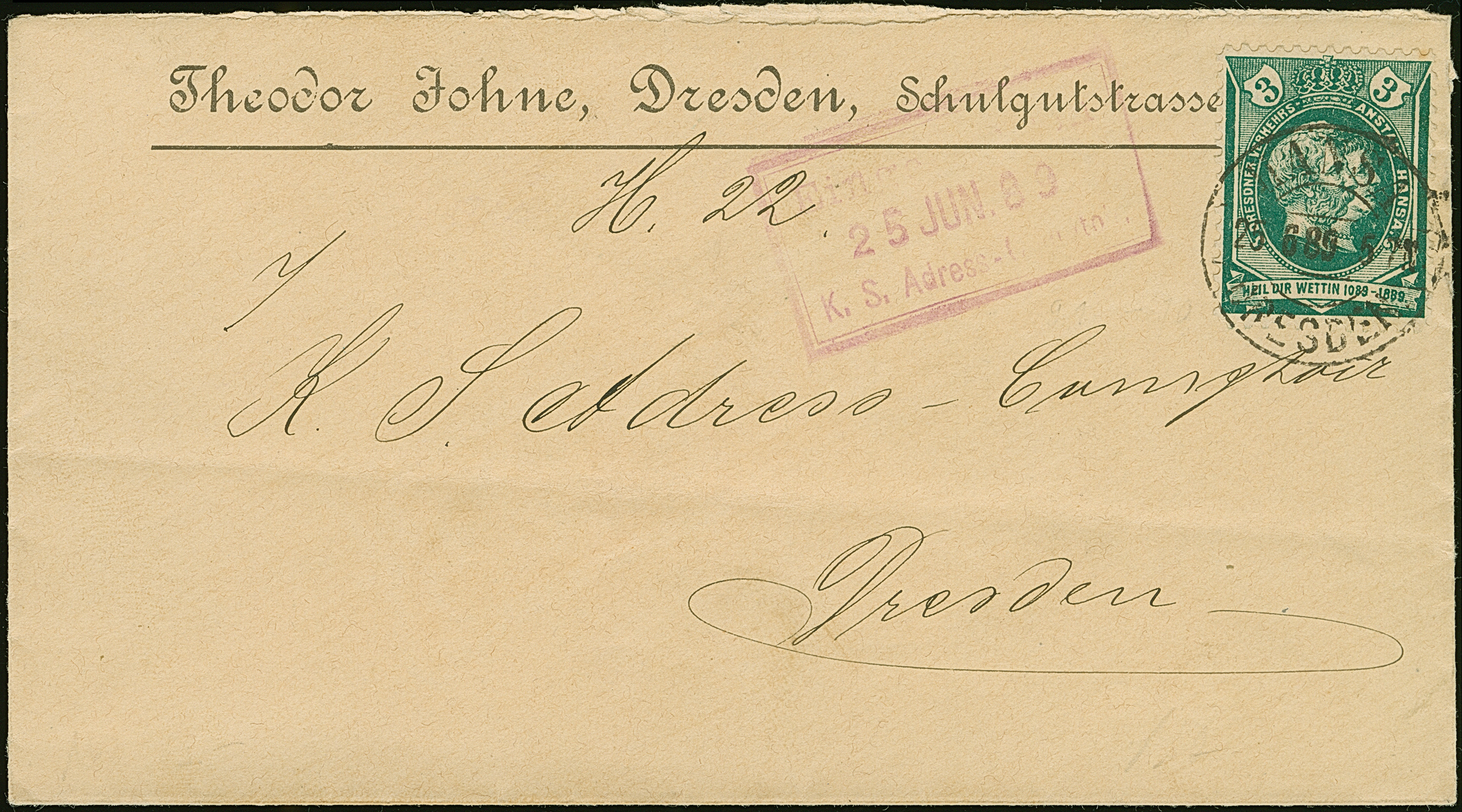 Hansa: 1889, König Albert und Königin Carola 3 Pfg. dunkelgrün mit Stempel “HANSA DRESDEN 25.6.89” auf Vordruckbrief “Theodor Johne, Dresden” im Ortsverkehr mit Firmeneingangsstempel. Der Umschlag mit waagerechter Faltung unterhalb der Marke, ansonsten in einwandfreier Erhaltung