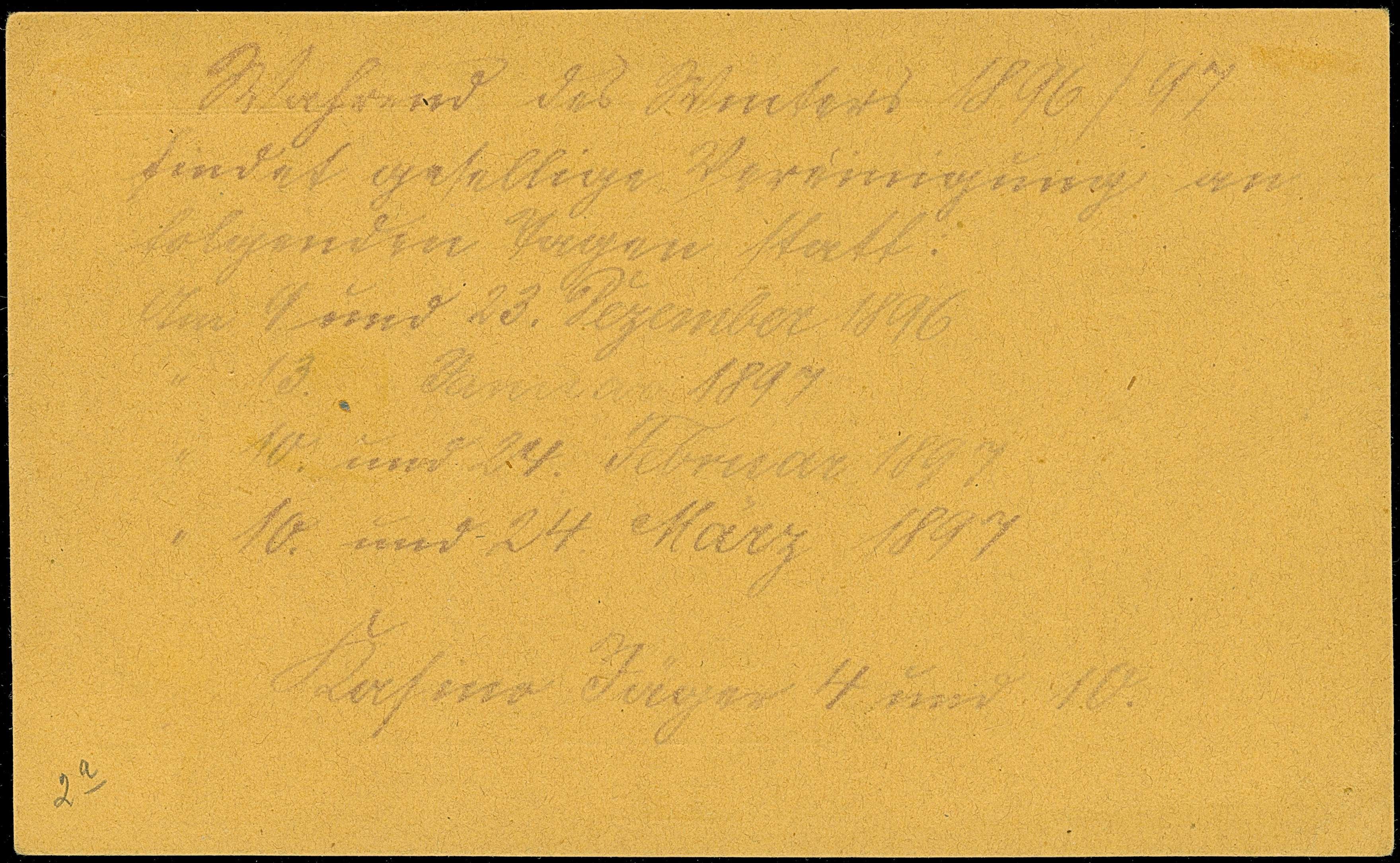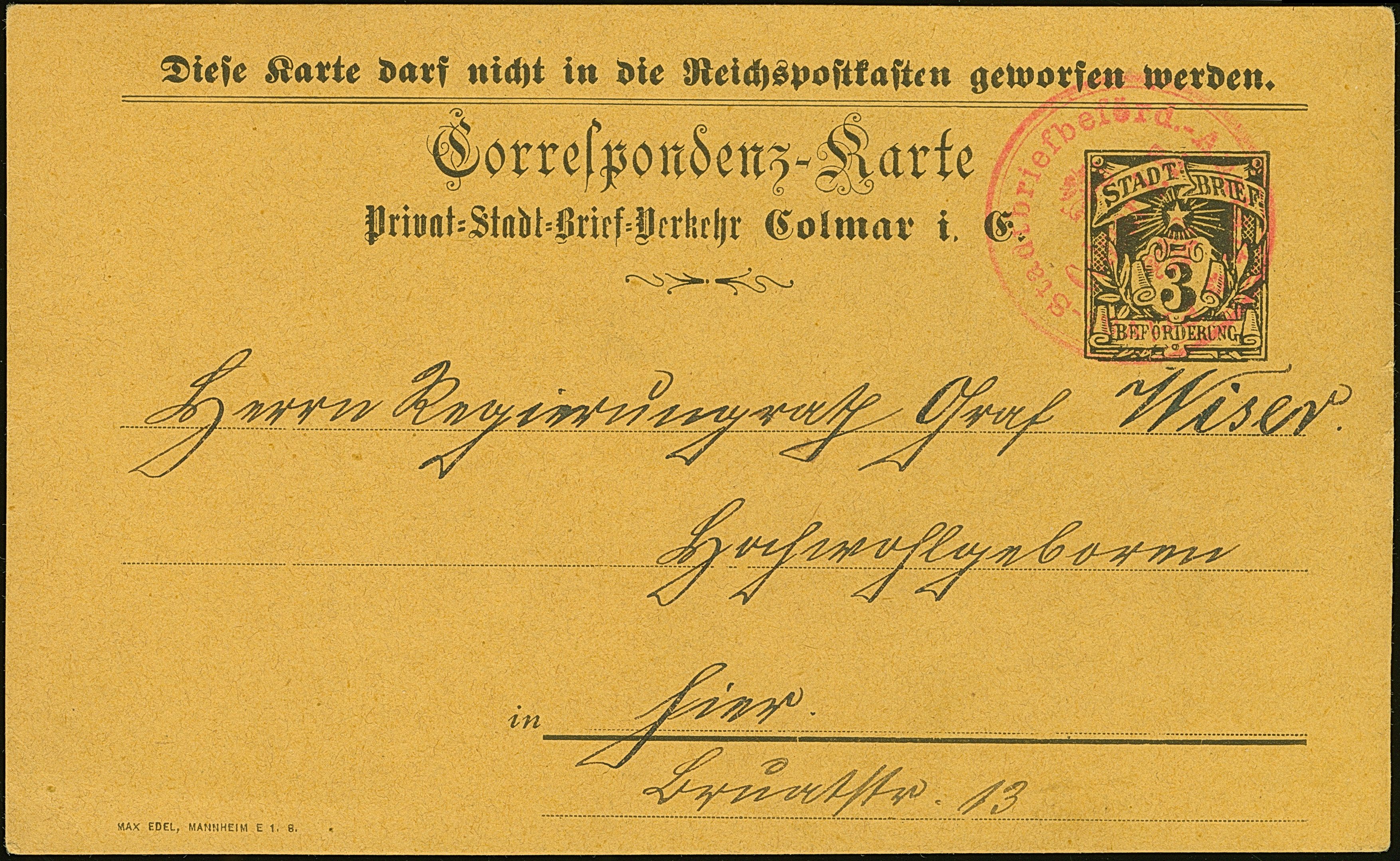 Stadt-Brief-Beförderung: 1896, Ganzsachenkarte 3 Pfg. auf gelbem Karton mit rotem Stempel “Stadtbriefbeförd.-Anstalt Colmar i. E.” und rückseitig mit hektografiertem Text, in einwandfreier Erhaltung