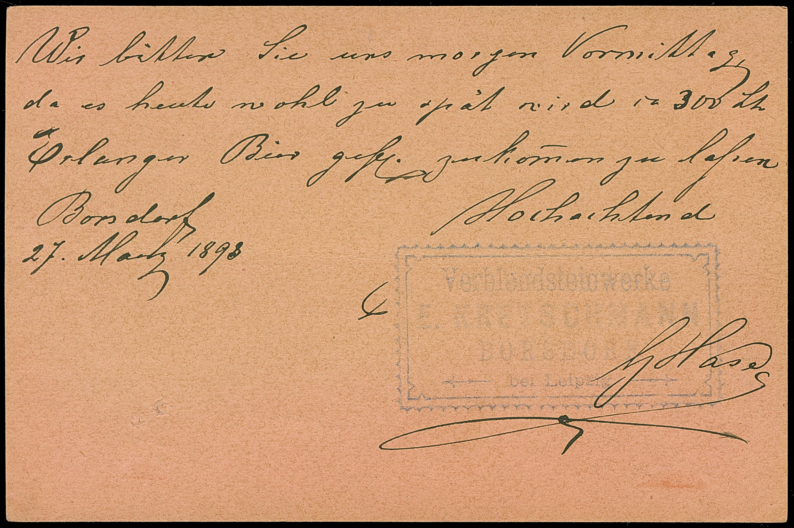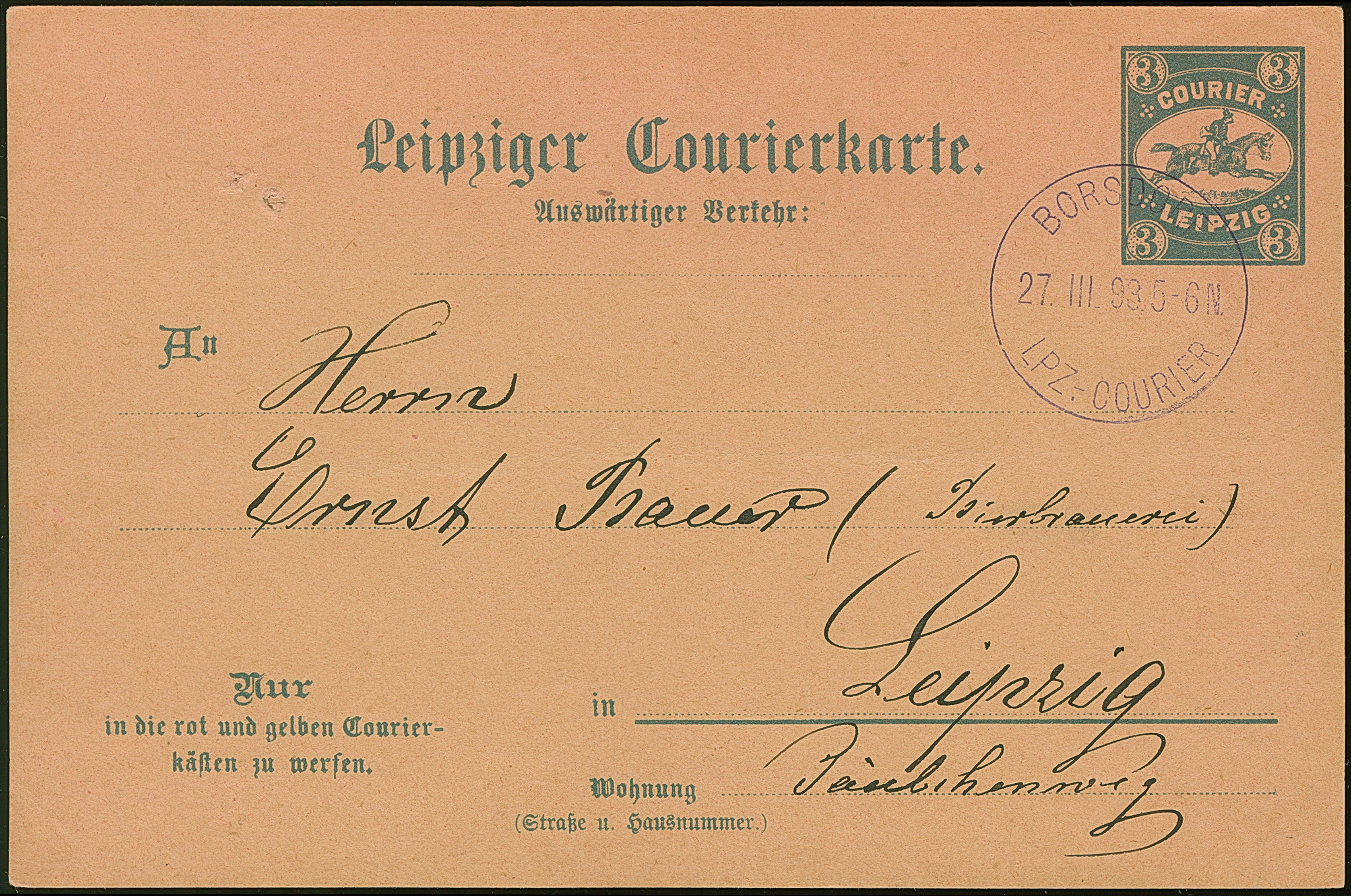 Courier: 1893, Ganzsachenkarte 3 Pfg. mit violettem Stempel “BORSDORF LPZ.-COURIER 27.III.93” und Text mit Firmenstempel “Verblendsteinwerke E. Kreuzschmann” nach Leipzig in einwandfreier Erhaltung. Eine sehr seltene Verwendung aus Borsdorf