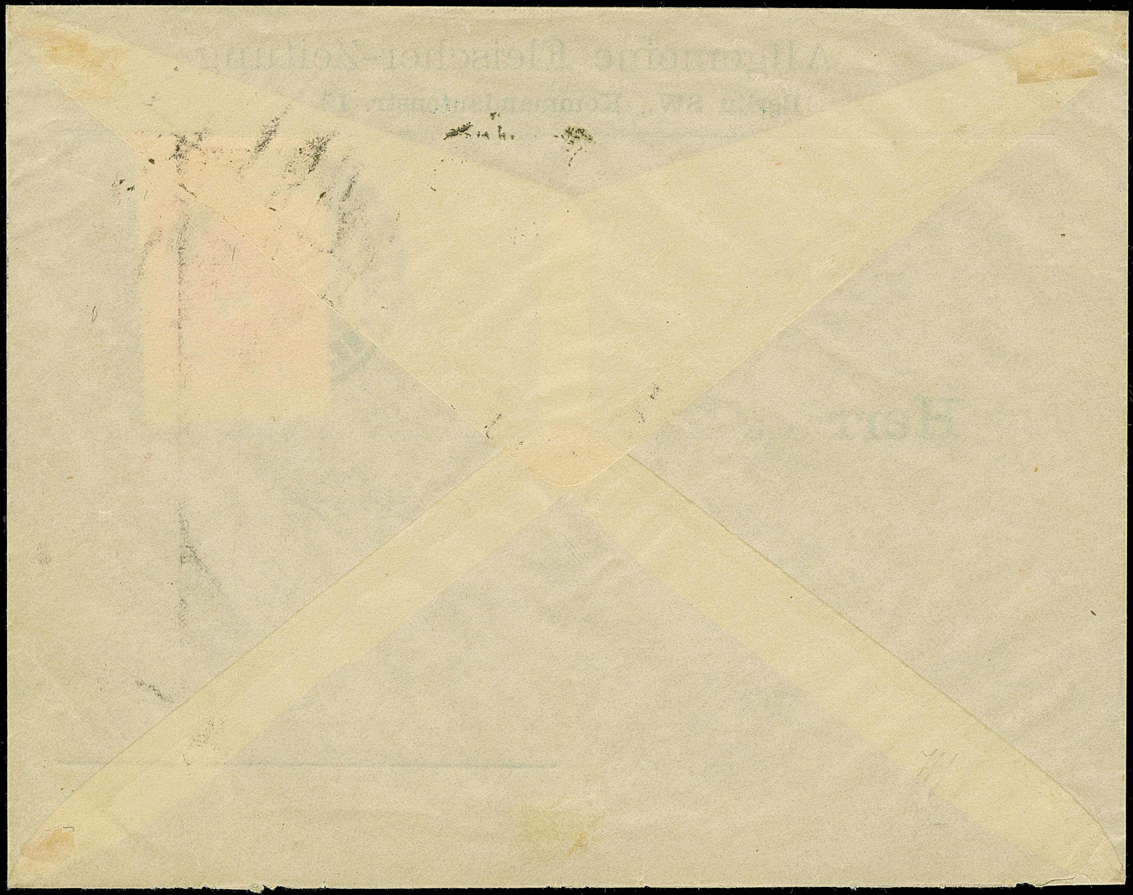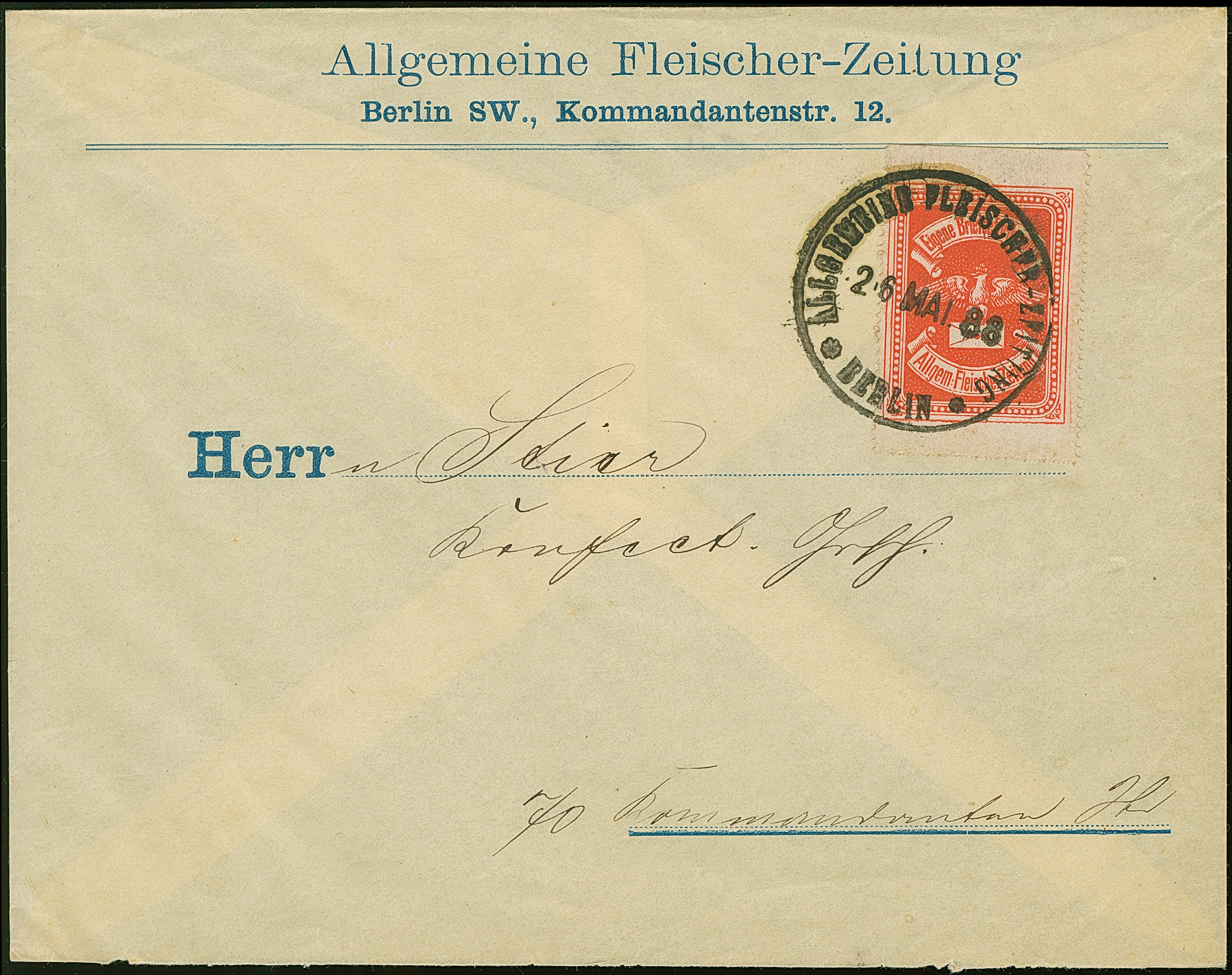 Eigene Briefbeförderung der Allgemeinen Fleischerzeitung: 1887, Fliegender Adler mit Briefumschlag rot gezähnt mit schwarzem Stempel “ALLGEMEINE FLEISCHER-ZEITUNG BERLIN 26.MAI.88” auf entsprechendem Vordruckbrief in einwandfreier Erhaltung. In dieser Kombination hat ProFi keinen weiteren Brief registriert