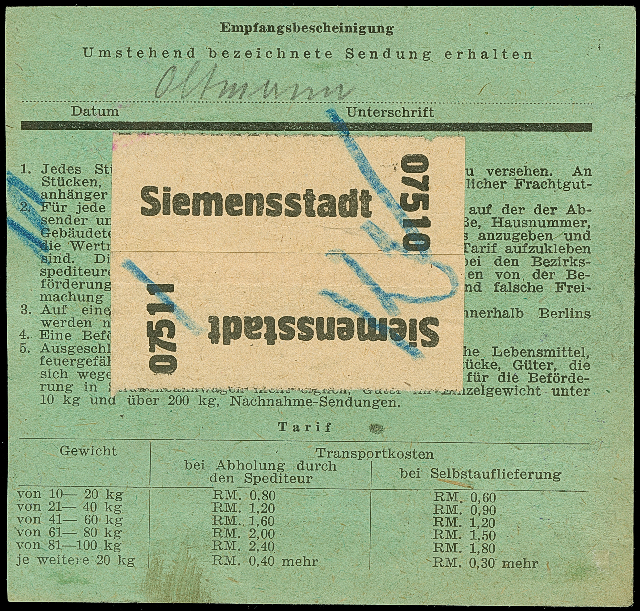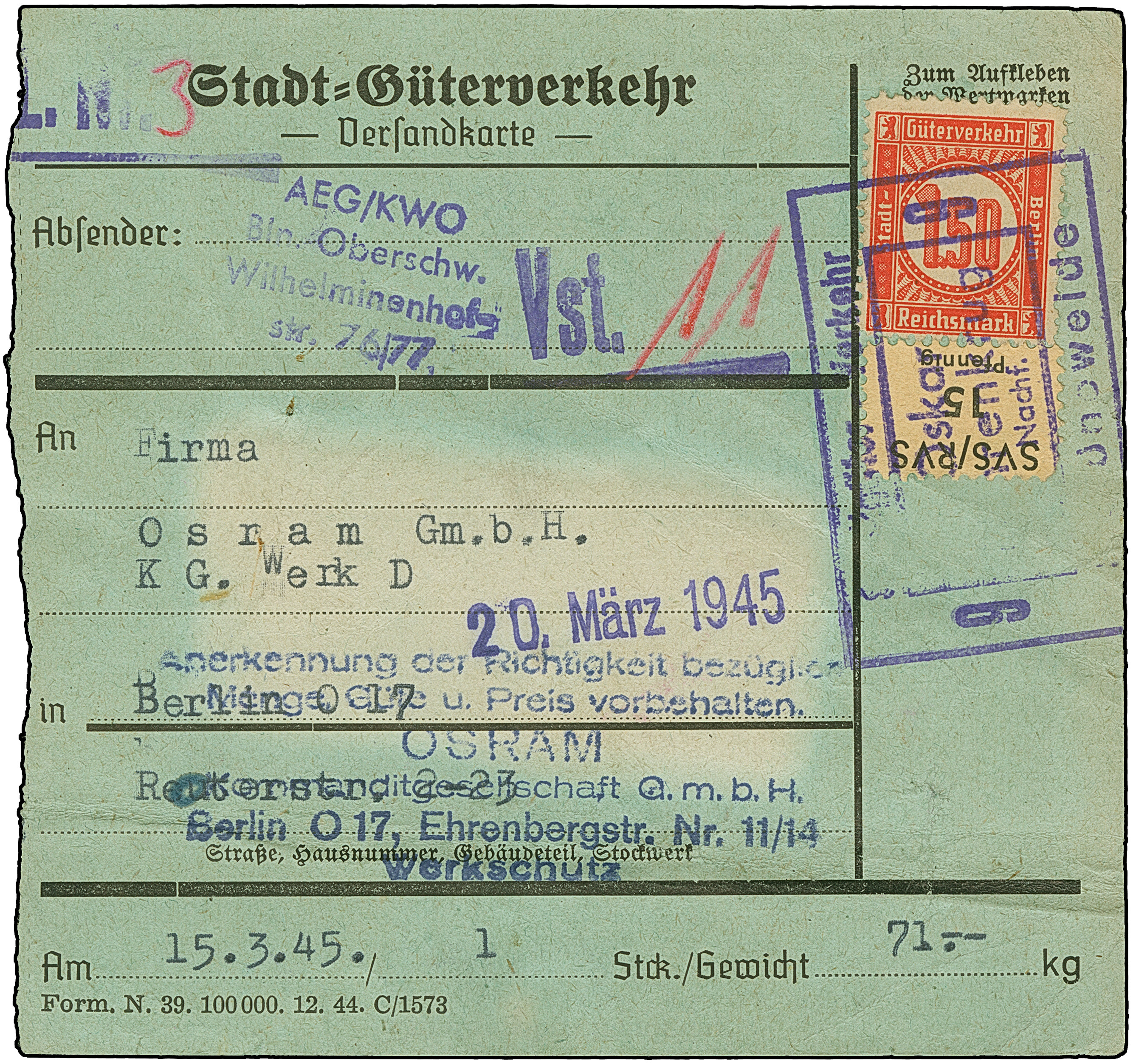 Stadt-Güter-Verkehr Berlin: 1944, 2 M. graugrün, 40 Pfg. hellblau und 30 Pfg. grün sowie Versicherungsmarke 15 Pfg. mit violettem Rahmenstempel “Stadt-Güterverkehr Annahme und Verteilung Siemensstadt” auf Paketkarte für 2 Pakete nach Berlin-Lichtenberg mit Datums-L1 “7.April.1945” von der Zustellung. Die Marken und das Formular sind in einwandfreier Erhaltung