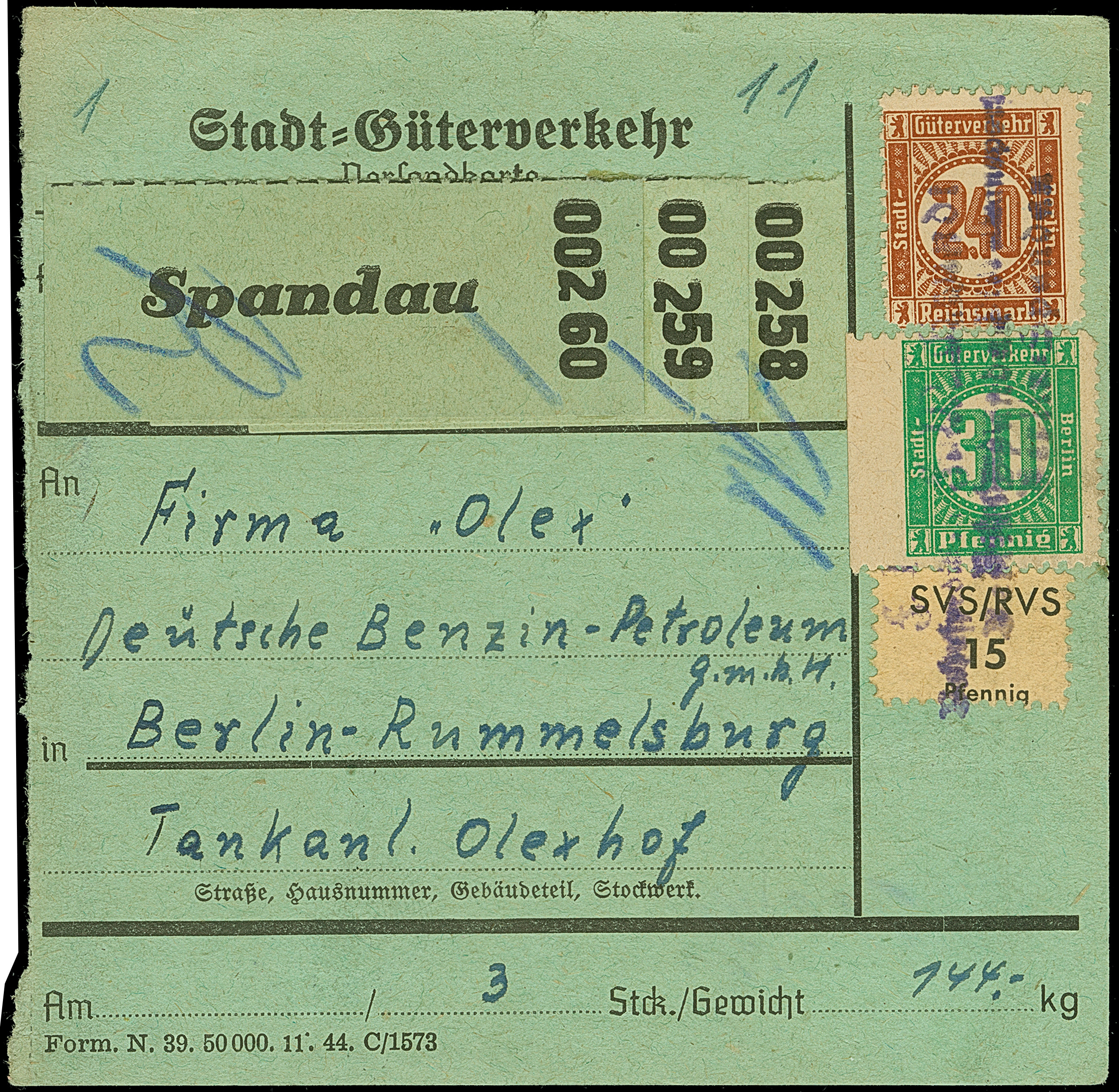 Stadt-Güter-Verkehr Berlin: 1944, 2,40 M. braun und 30 Pfg. grün sowie Versicherungsmarke 15 Pfg. mit undeutlichichem violettem L3 "…..Spandau” auf Paketkarte für 3 Pakete nach Berlin-Rummelsburg mit rückseitigem Datums-L1 “20.März.1945” von der Zustellung. Die Marken und das Formular sind in einwandfreier Erhaltung