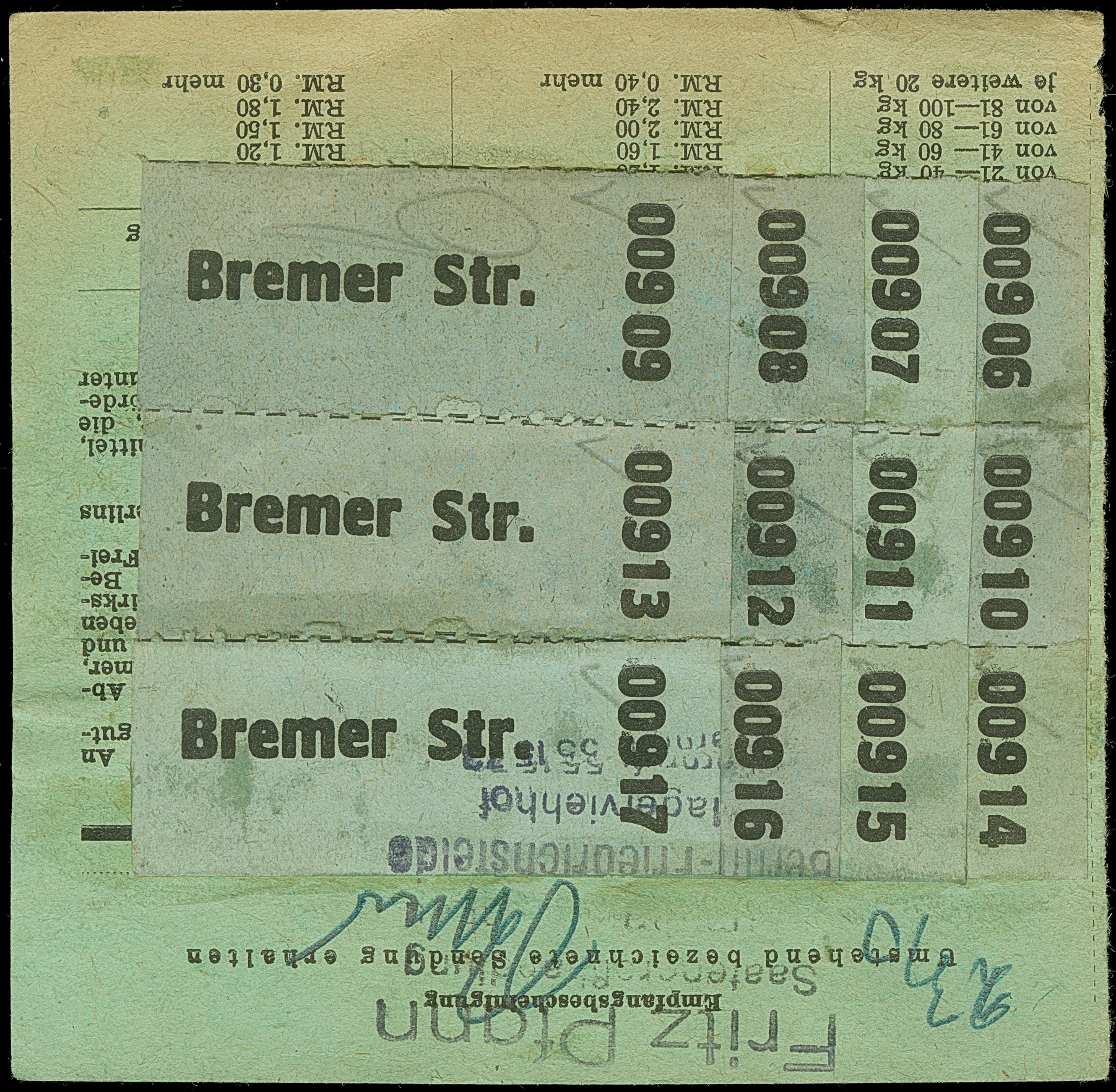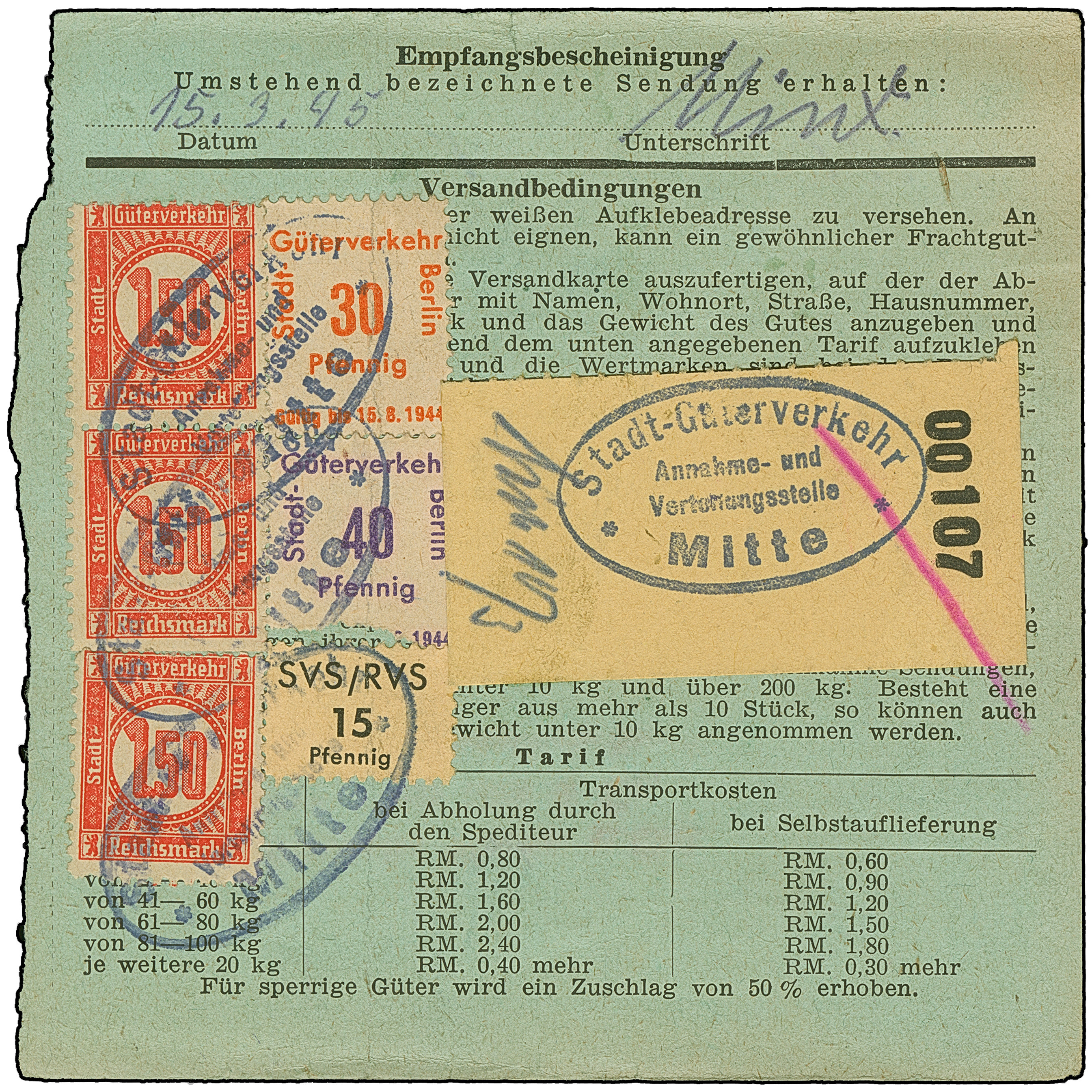 Stadt-Güter-Verkehr Berlin: 1944, 1,50 M. orangerot im senkrechten Paar und Einzelmarke, 1. Ausgabe 30 und 40 Pfg. sowie Versicherungsmarke 15 Pfg. mit violettem Ovalstempel “Stadt-Güterverkehr Annahme und Verteilungsstelle Mitte” rückseitig auf Paketkarte für ein Paket nach Berlin-Rummelsburg mit Eingangsdatierung vom 15.3.1945. Die rechten Marken wie das Formular mit leichter senkrechter Faltung, die anderen Marken sind in einwandfreier Erhaltung. Eine dekorative und nicht häufige Frankatur mit drei Werten der 1,50 M.-Wertstufe