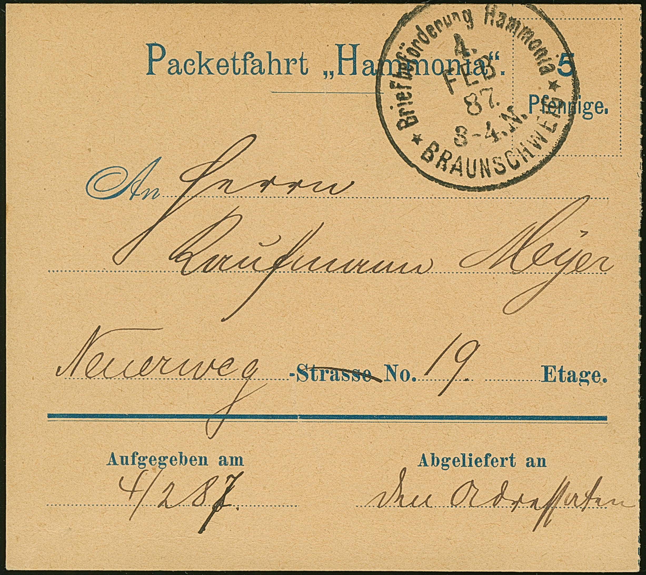 Brief-Beförderung HAMMONIA: 1887, Paketbegleit-Formular 5 Pfennige gebraucht mit stempel “Briefbeförderung Hammonia BRAUNSCHWEIG 4.FEB.87” in guter Erhaltung, selten