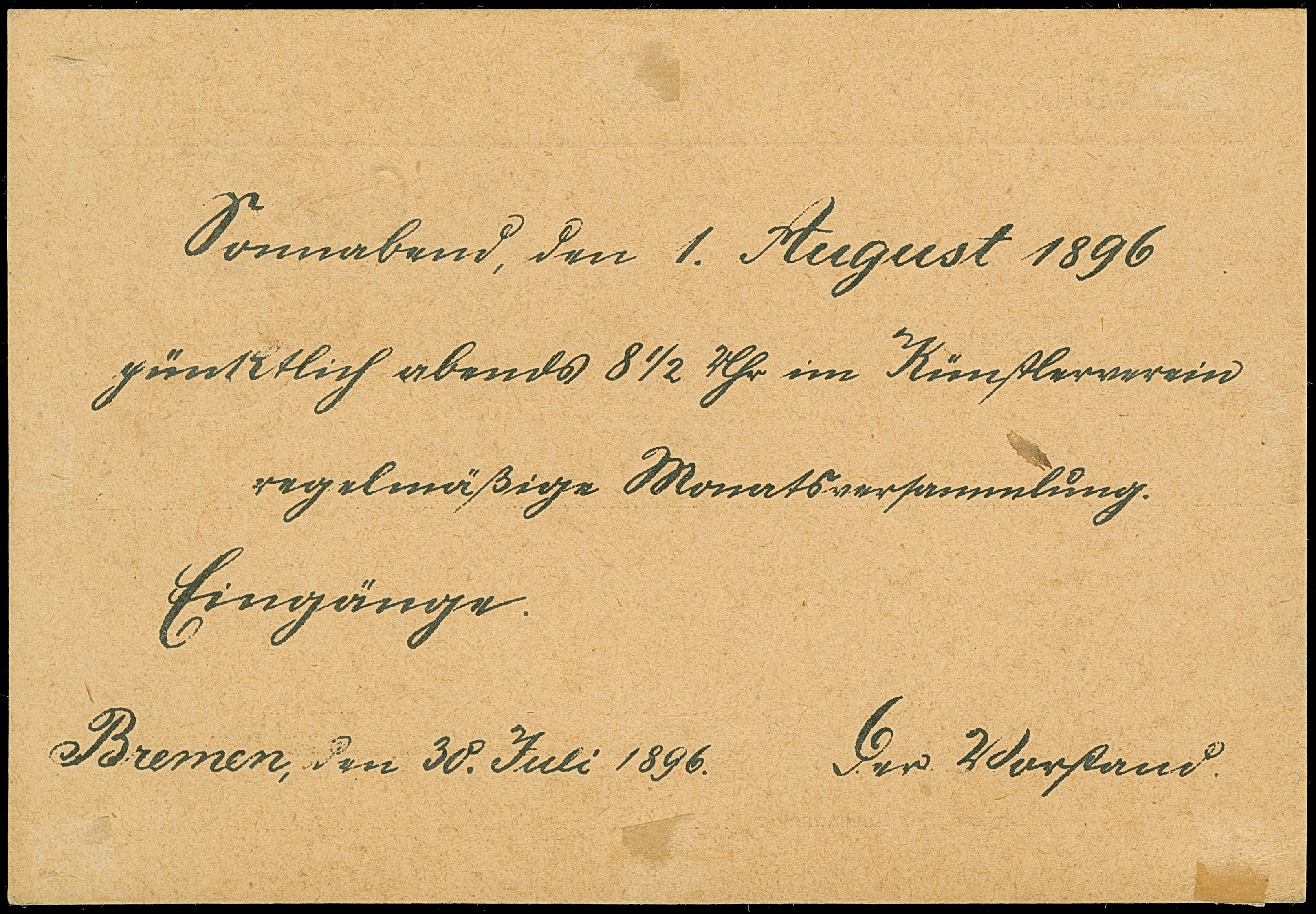 Privat-Beförderungs-Amstalt: 1896, “BREMEN PRIVAT BRIEFBEFÖRDERUNGS ANSTALT Porto bezahlt 30.JUL.1896 IV” in Schwarz sehr klar auf Vordruckkarte “Architekten- un. Ingenieur-Verein Bremen” mit gedrucktem Text im Ortsverkehr, in guter Erhaltung, eine nicht häufige Barfreimachung