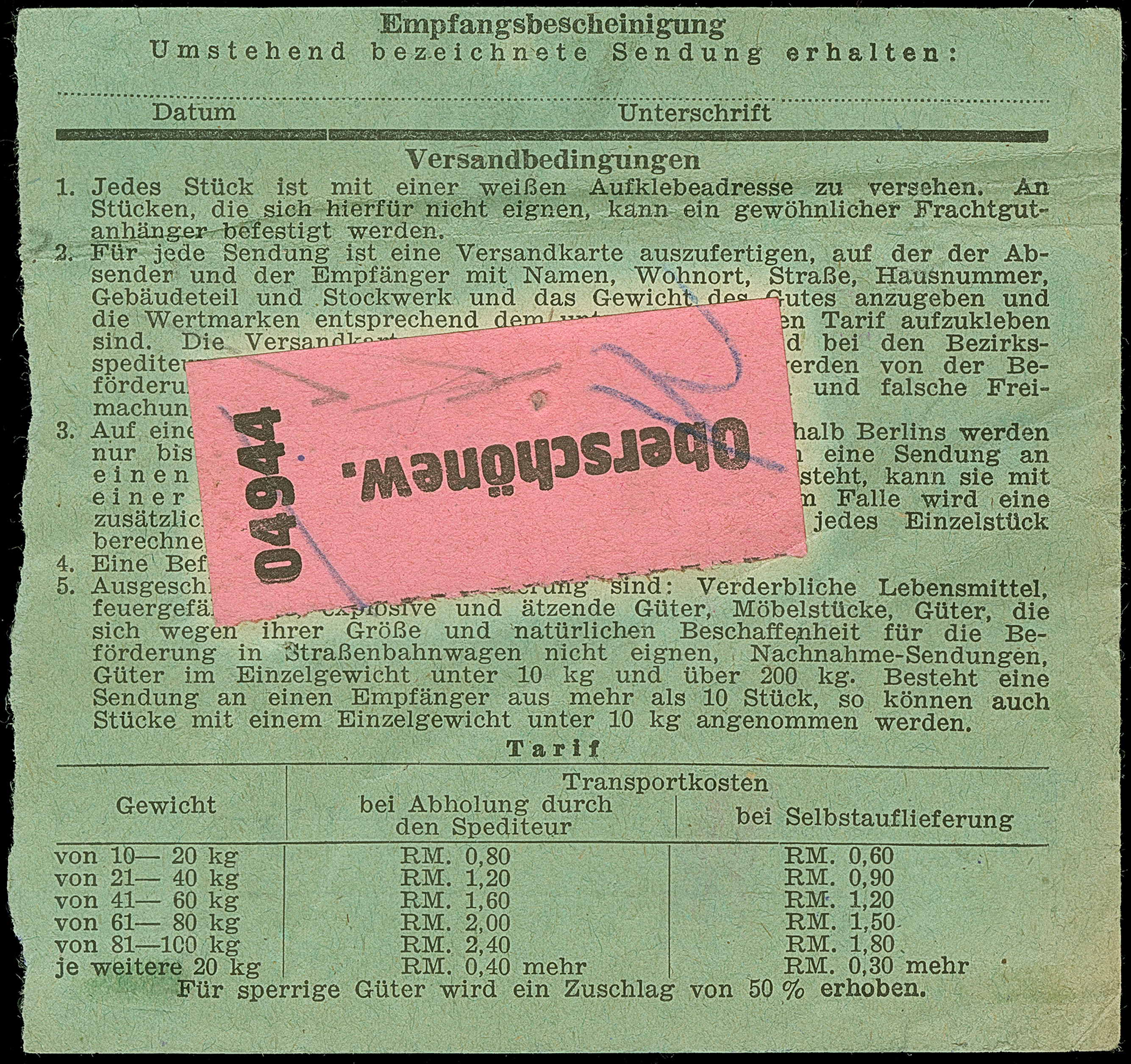 Stadt-Güter-Verkehr Berlin: 1944, 1,50 M. orangerot und Versicherungsmarke 15 Pfg. mit violettem Rahmenstempel “Stadt-Güterverkehr Schönewalde…” auf Paketkarte für ein Paket aus Oberschönewalde nach Berlin O17 mit Datums-L1 “20.März.1945” von der Zustellung. Die Marken sind in einwandfreier Erhaltung, das Formular mit Falt- und Beförderungsspuren. Eine seltene Verwendung der 1,50 M.-Wertstufe