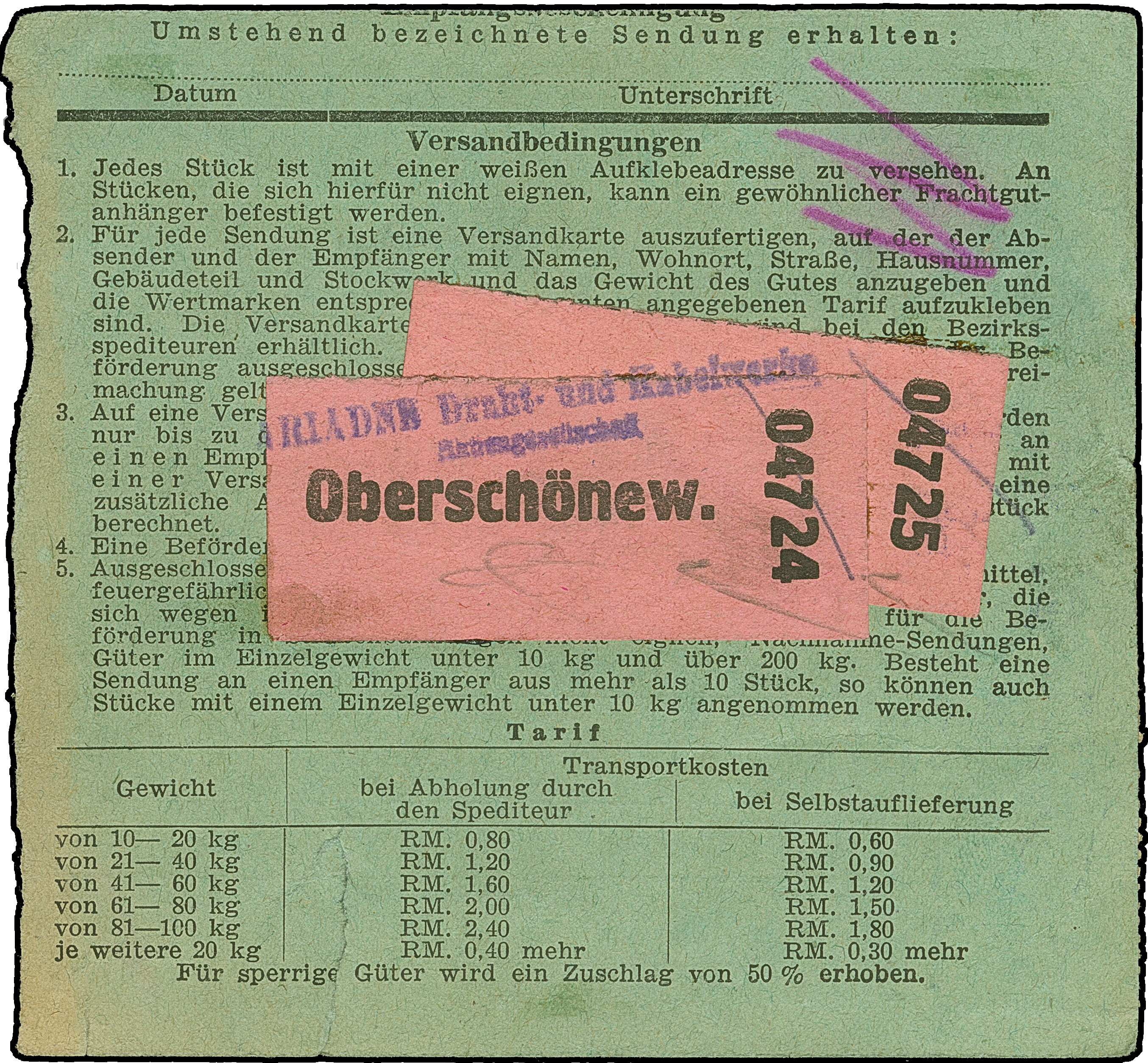 Stadt-Güter-Verkehr Berlin: 1944, 1,80 M. graublau, 1,60 rotviolett, 10 Pfg. orange und 1. Ausgabe 40 Pfg. violett sowie Versicherungsmarke 15 Pfg. jeweils mit violettem Rahmenstempel “Stadt-Güterverkehr Schönewalde….” auf Paketkarte für 2 Pakete von Oberschönewalde nach Berlin O112 mit Datums-L1 “20.MÄRZ.1945” von der Zustellung. Zwei Marken rechts mit kleinen Zahnfehlern durch Randklebung und Formular oben links mit Einriss, ansonsten in guter Erhaltung. Eine dekorative und seltene Verwendung der 1,80 M.-Wertstufe