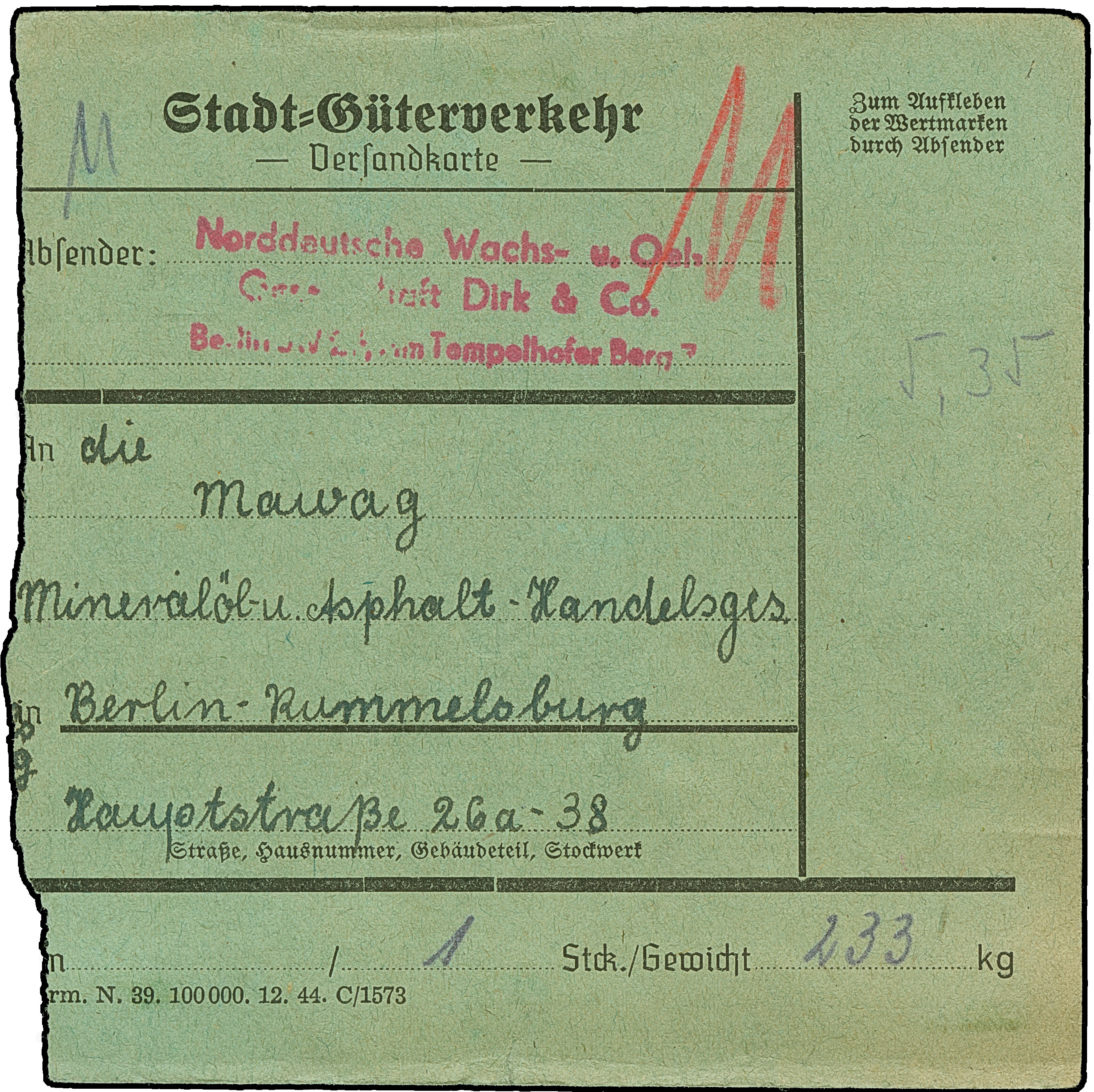 Stadt-Güter-Verkehr Berlin: 1944, 10 M. olivgrau und senkrechtes Paar 10 Pfg. orange sowie Versicherungsmarke 15 Pfg. mit rotem L3 “Stadt-Güterverkehr Annahme und Verteilungsstelle Moabit Bremer-Str.” auf Paketkarte für12 Pakete nach Berlin-Ost mit Datums-L1 “23.April.1945” von der Zustellung. Die untere Marke mit Druckstelle bzw. leichten Beförderungsspuren, ansonsten in guter Erhaltung. Eine außergewöhnlich seltene Verwendung der 10 M.-Wertstufe, ProFi hat nur zwei weitere Paketkarten registriert