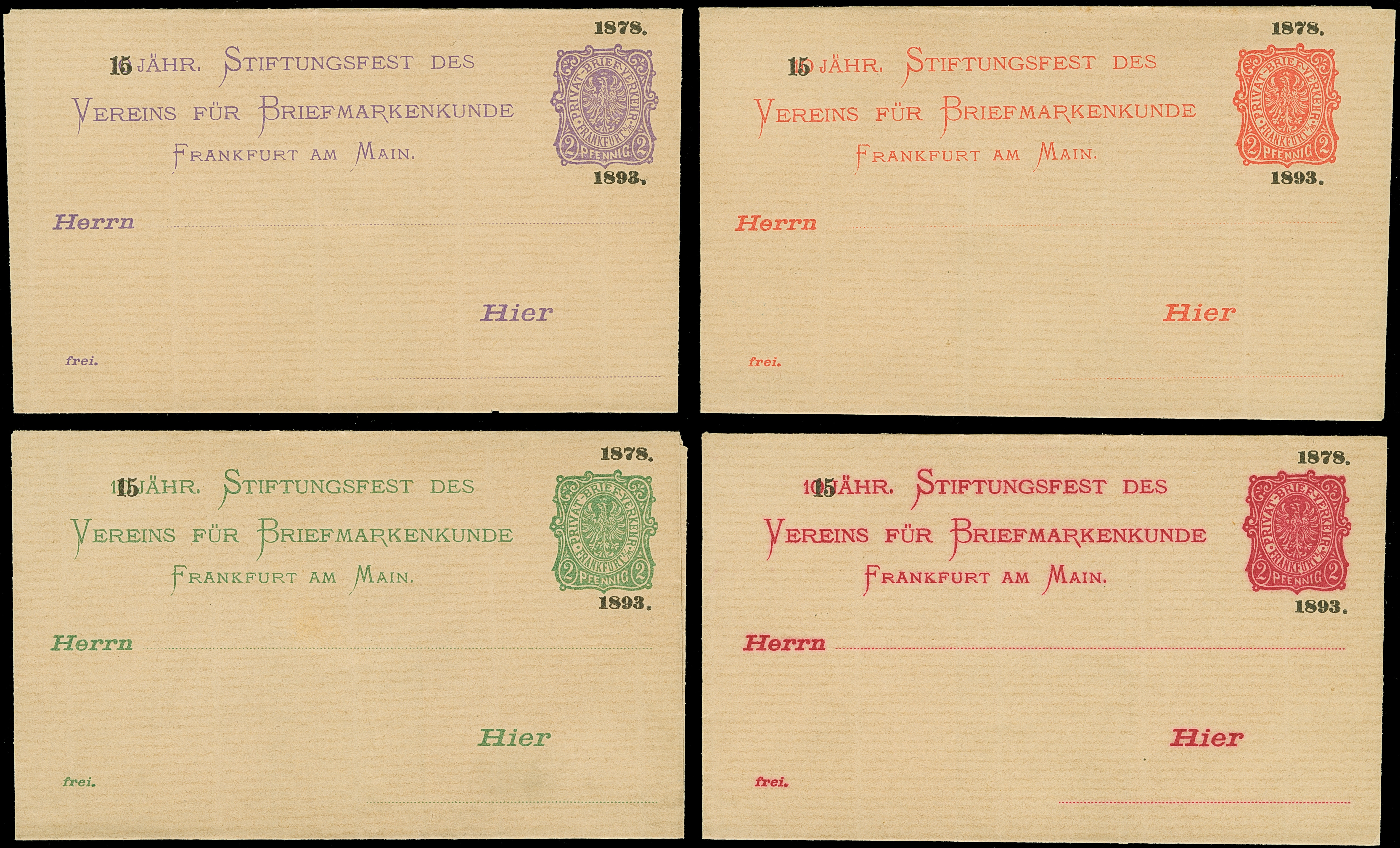 Privat-Brief-Verkehr: 1893, Ganzsachen-Faltbrief 2 Pfg, im Format 125x75 mm auf gestreiftem Papier mit Zudruck “15” über 10 und “1878 +1893” über und unter dem Wertstempel in den Farben orange, rot, lila und grün, ungebraucht in einwandfreier Erhaltung. Im Müller-Katalog ist bisher nur ein Stück in ultramarin registriert