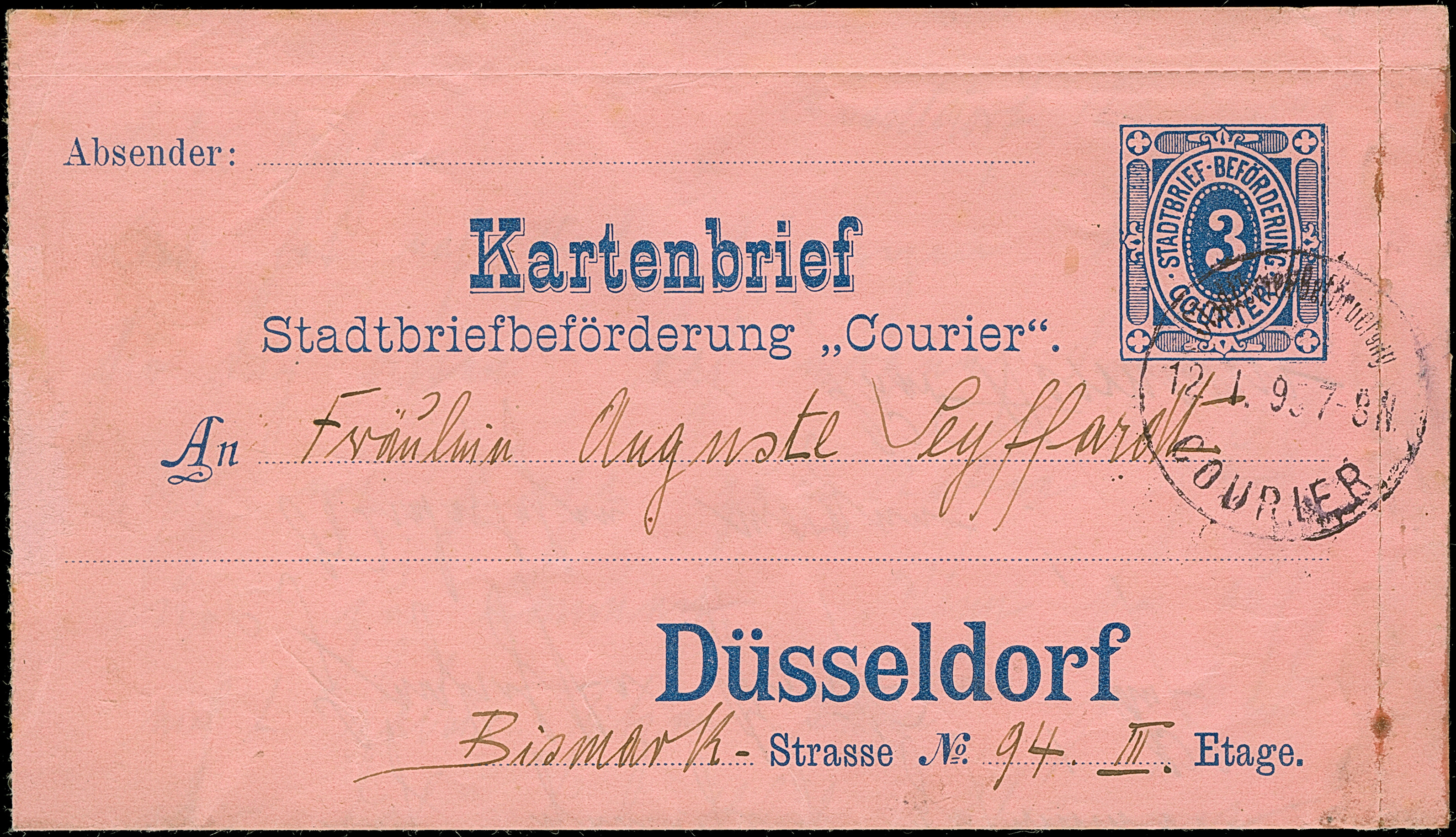 Courier: 1894, Ganzsachen-Kartenbrief 3 Pfg. mit Stempel “Stadtbrief-Beförderung COURIER 12.1895” und Text. Der Umschlag links ohne Rand und leichte Beförderungsspuren, ansonsten in guter Erhaltung