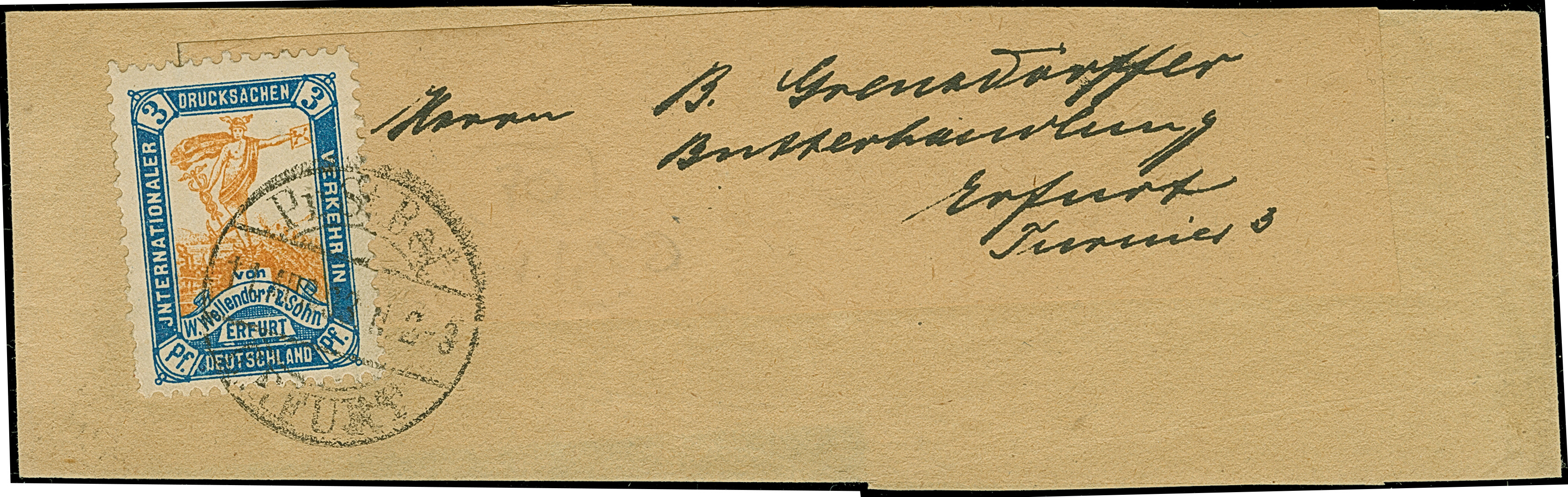 Privat-Stadtbrief-Beförderung: 1891, Merkur auf der Weltkugel 3 Pfg. mit Stempel “Pr.St.Bef. ERFURT 11.ASUG.93” auf Drucksachen-Streifband in einwandfreier Erhaltung