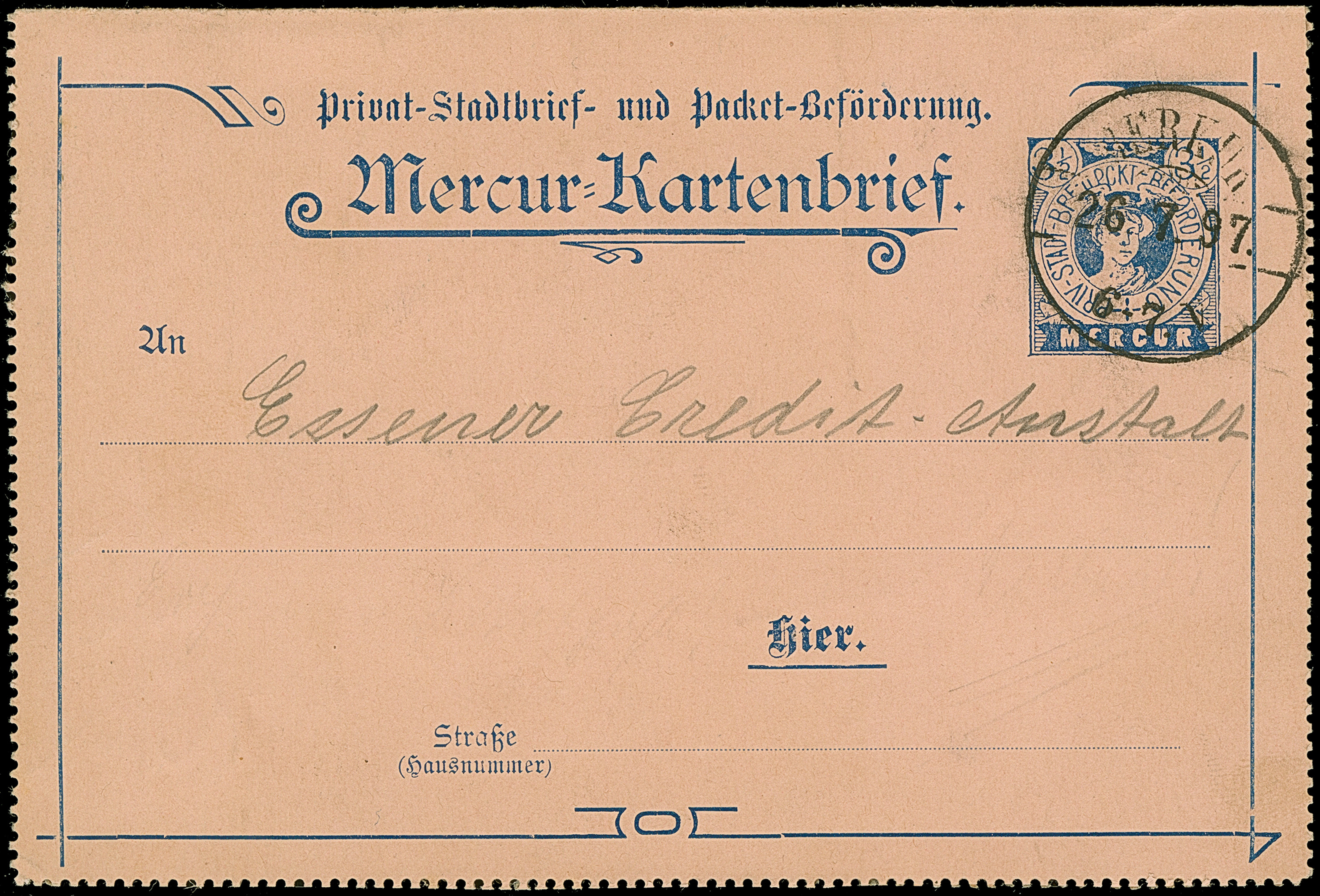 Merkur: 1897, Ganzsachen-Kartenbrief 3½ Pfg. mit Stempel “MERKUR 26.7.97” und Text im Ortsverkehr befördert. Der Kartenbrief ist ohne Ränder, ansonsten in guter Erhaltung