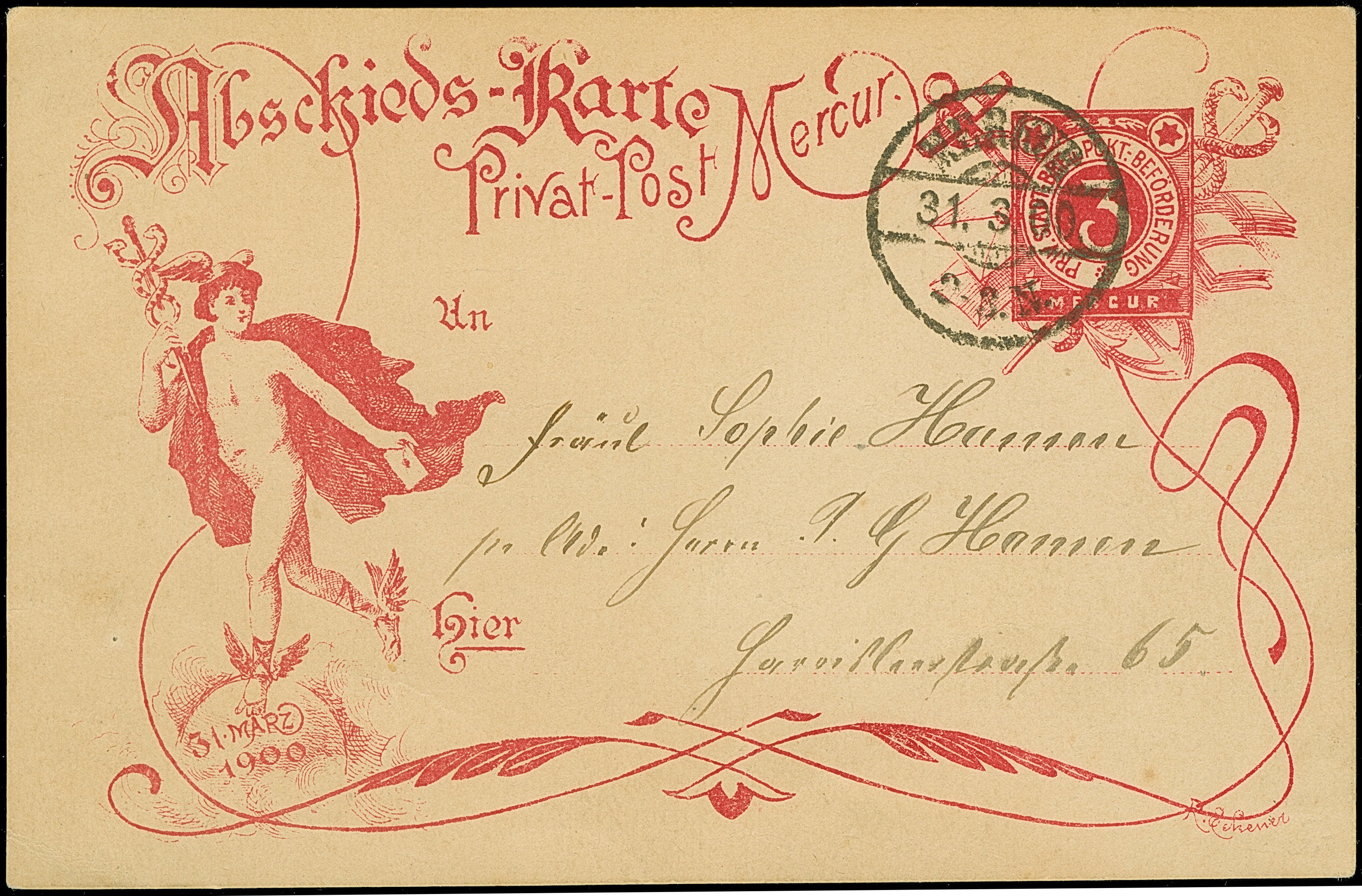 Merkur: 1900, Ganzsachenkarte Abschied 3 Pfg. karminrot mit Stempel “MERKUR. 31.3.00” mit viel Text im Ortsverkehr befördert, in guter Erhaltung