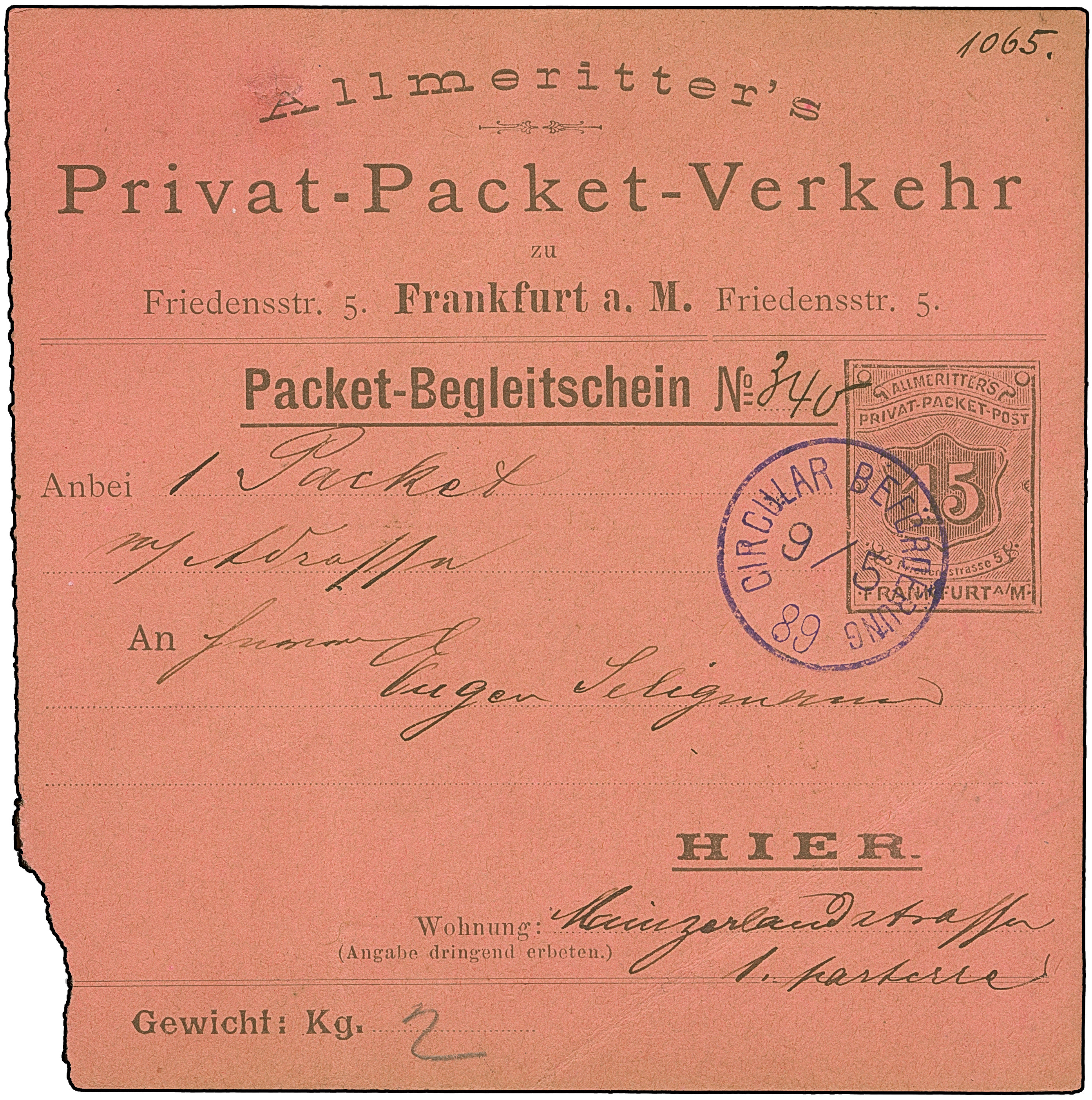 Drucksachen & Circular-Beförderung: 1889, Ganzsachen-Packet-Belgeitschein 15 Pfg. auf graurotem Karton gebraucht mit violettem Stempel “CIRCULAR BEFÖRDERUNG 9.5.89”. Das Formular mit senkrechter Faltung und Schürfstelle oben, in guter Gesamterhaltung