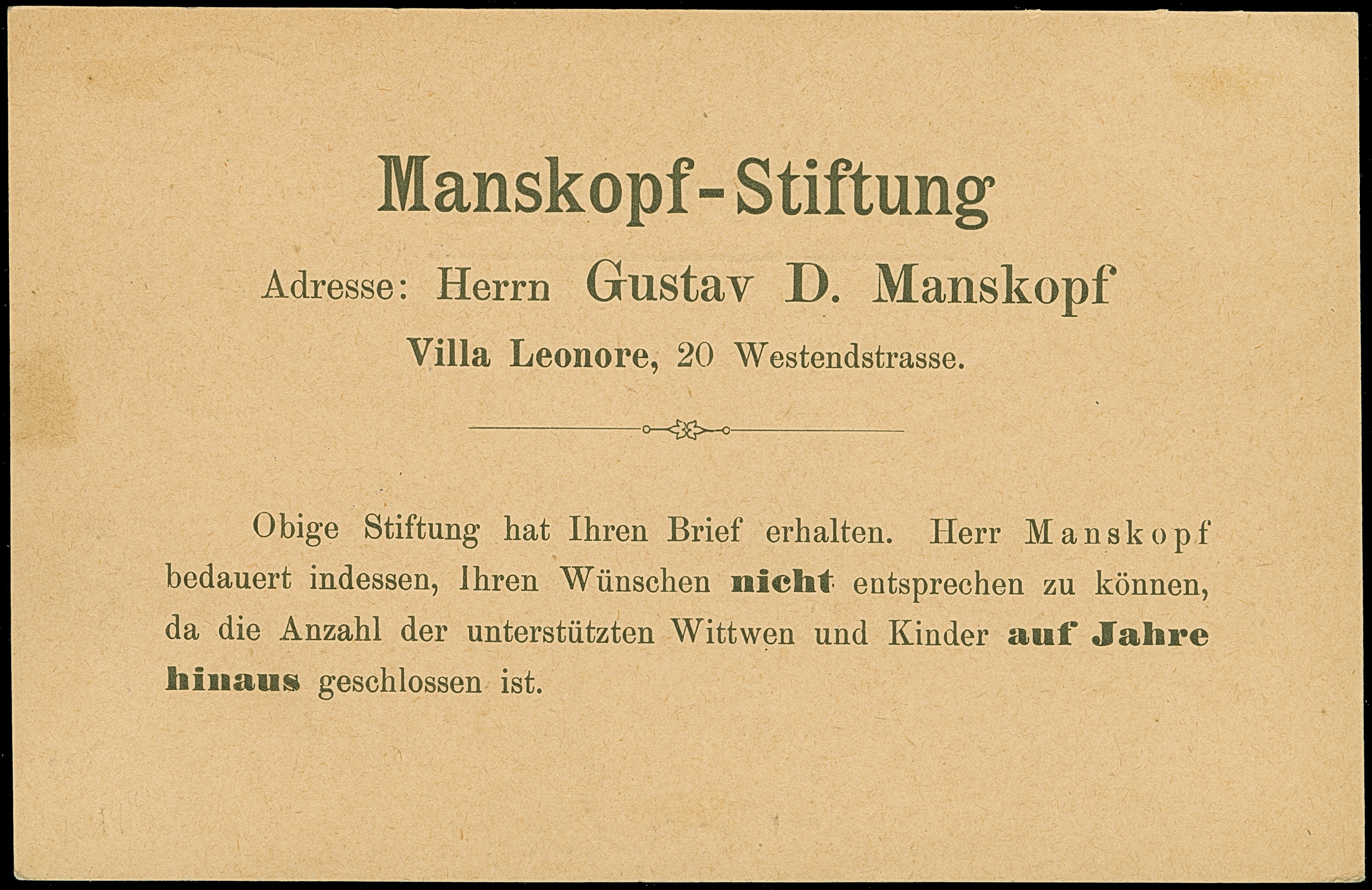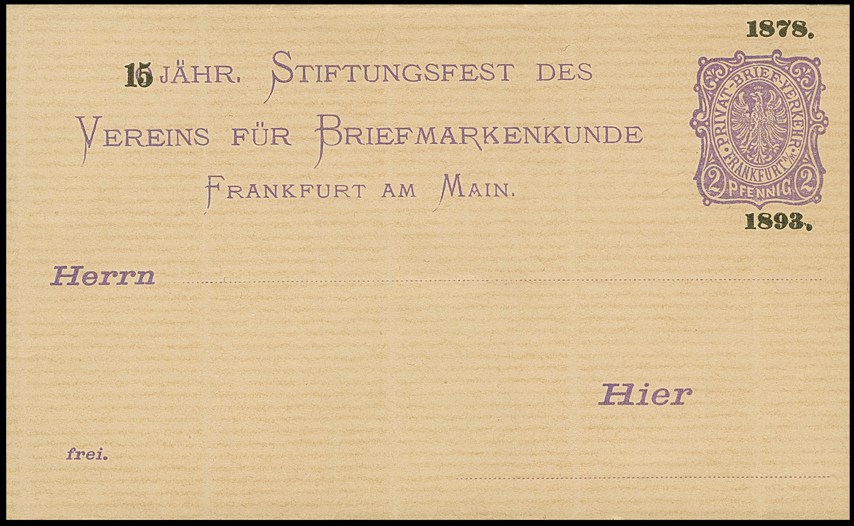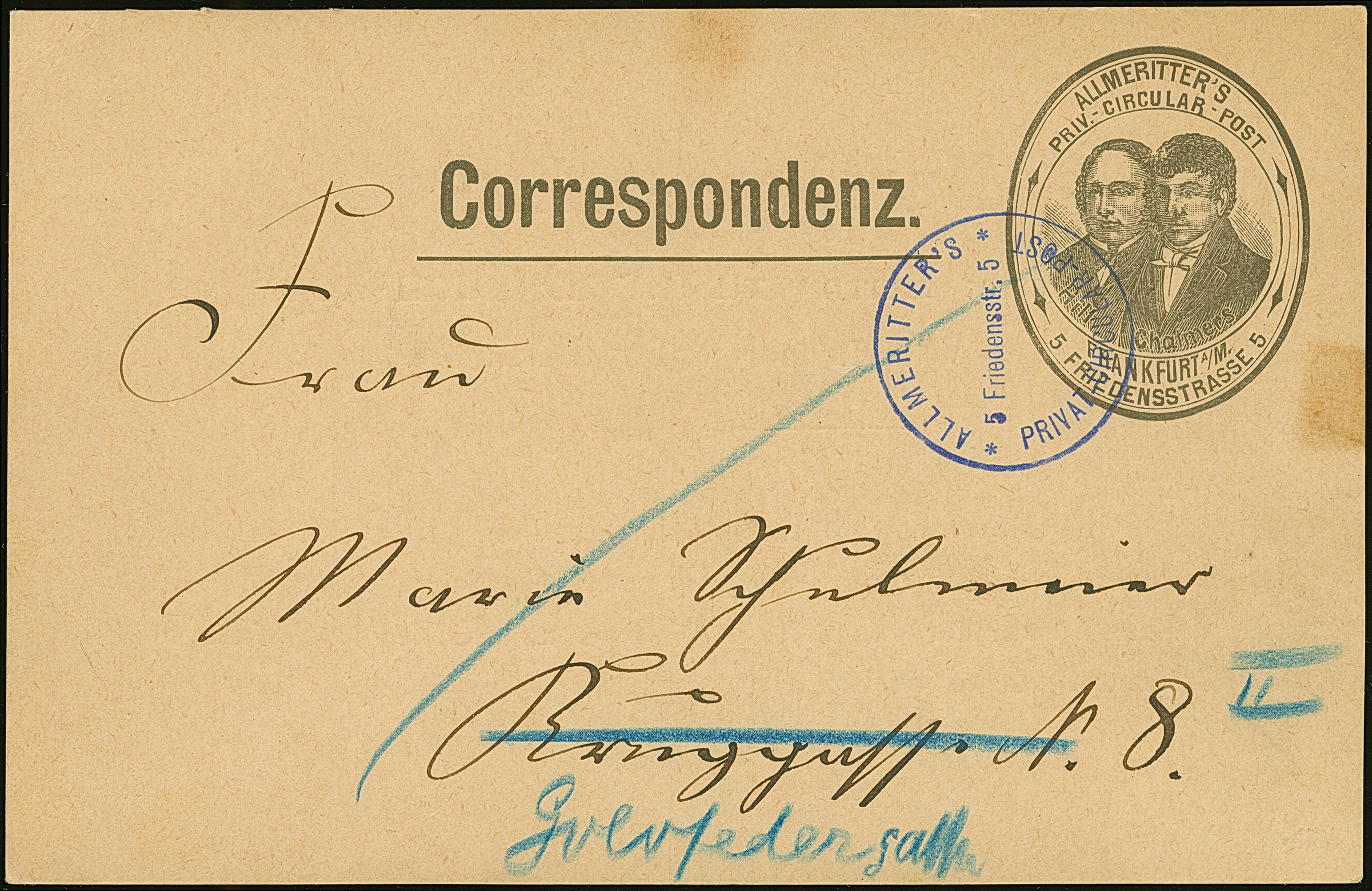 Drucksachen & Circular-Beförderung: 1889, Ganzsachen-Karte auf Privatbestellung Hill und Chalmers 2 Pfg. schwarz mit rückseitigem Zudruck “Manskopf-Stiftung” gebraucht mit violettem Stempel “ALLMERITTER'S PRIVAT-CIRCULAR-POST Friedenstr. 5”. Die Karte mit zwei kleinen Flecken, ansonsten in guter Erhaltung