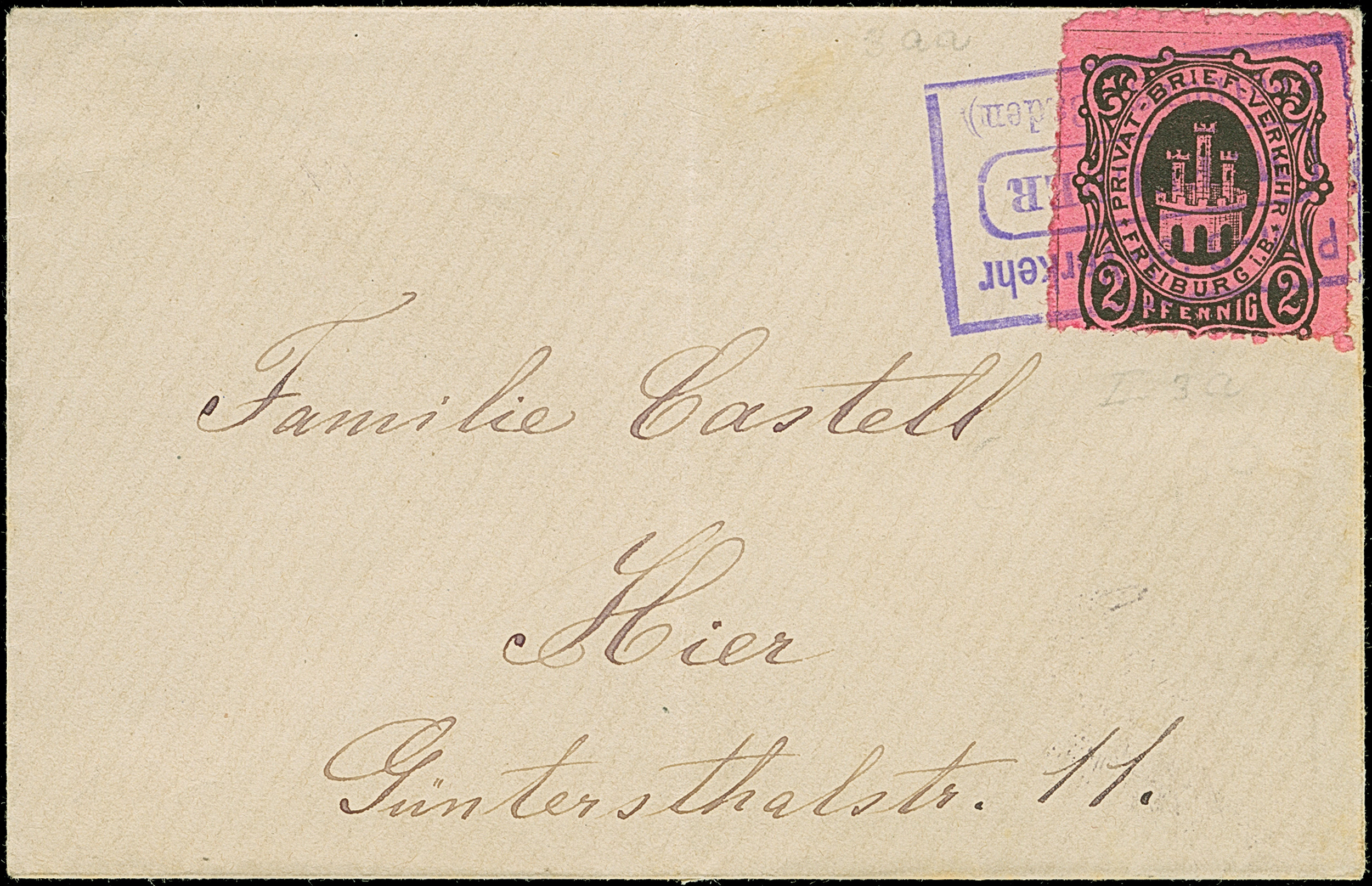 1887, 2 Pfg. schwarz auf rosa gezähnt mit violettem Rahmenstempel “Priv.Brief-Verkehr Freiburg (Baden) W. Felder” auf kleinformatigem Briefkuvert, im Ortsverkehr befördert. Der Umschlag mit senkrechter Faltung, ansonsten in guter Erhaltung, selten