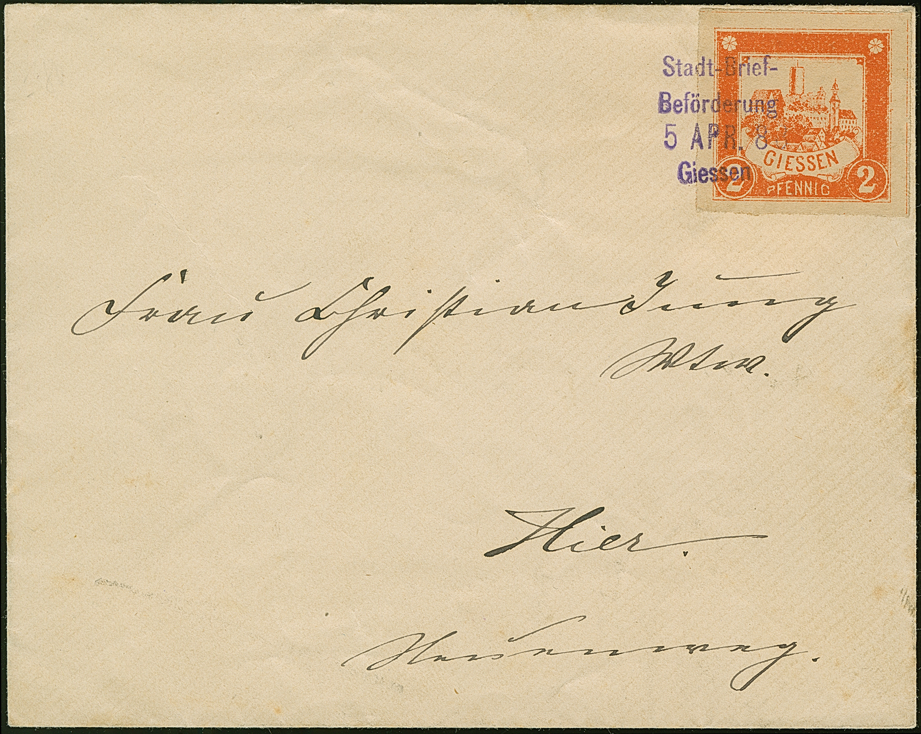 Privat-Stadt-Post: 1888, Burgzeichnung ohne Randinschriften 2 Pfg. geschnitten mit violettem L4 “Stadt-Brief-Beförderung 5.APR.88 Giessen” auf Briefkuvert im Ortsverkehr befördert. Der Umschlag mit leichten Beförderungsspuren, ansonsten in guter Erhaltung, selten
