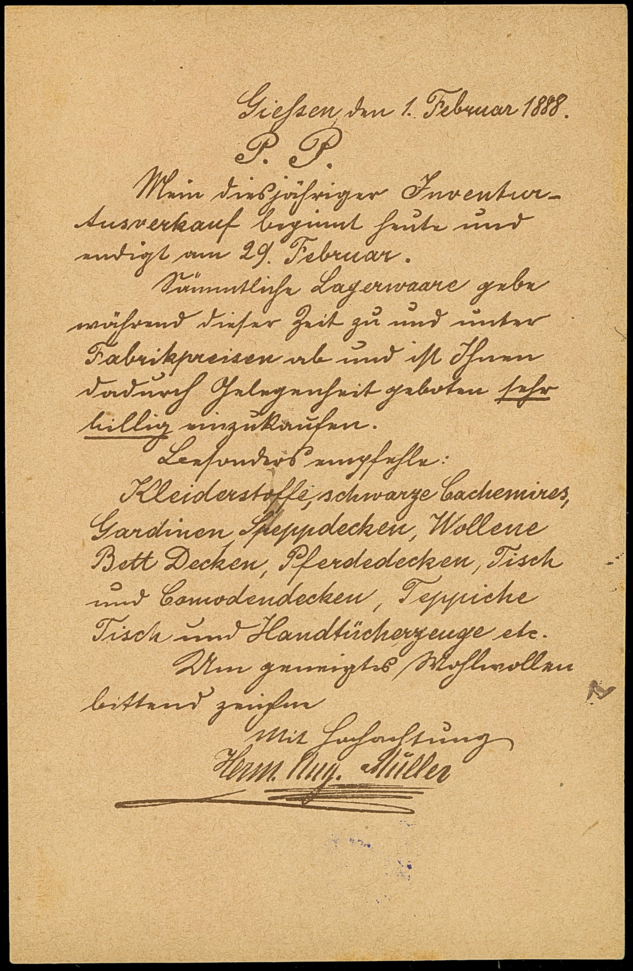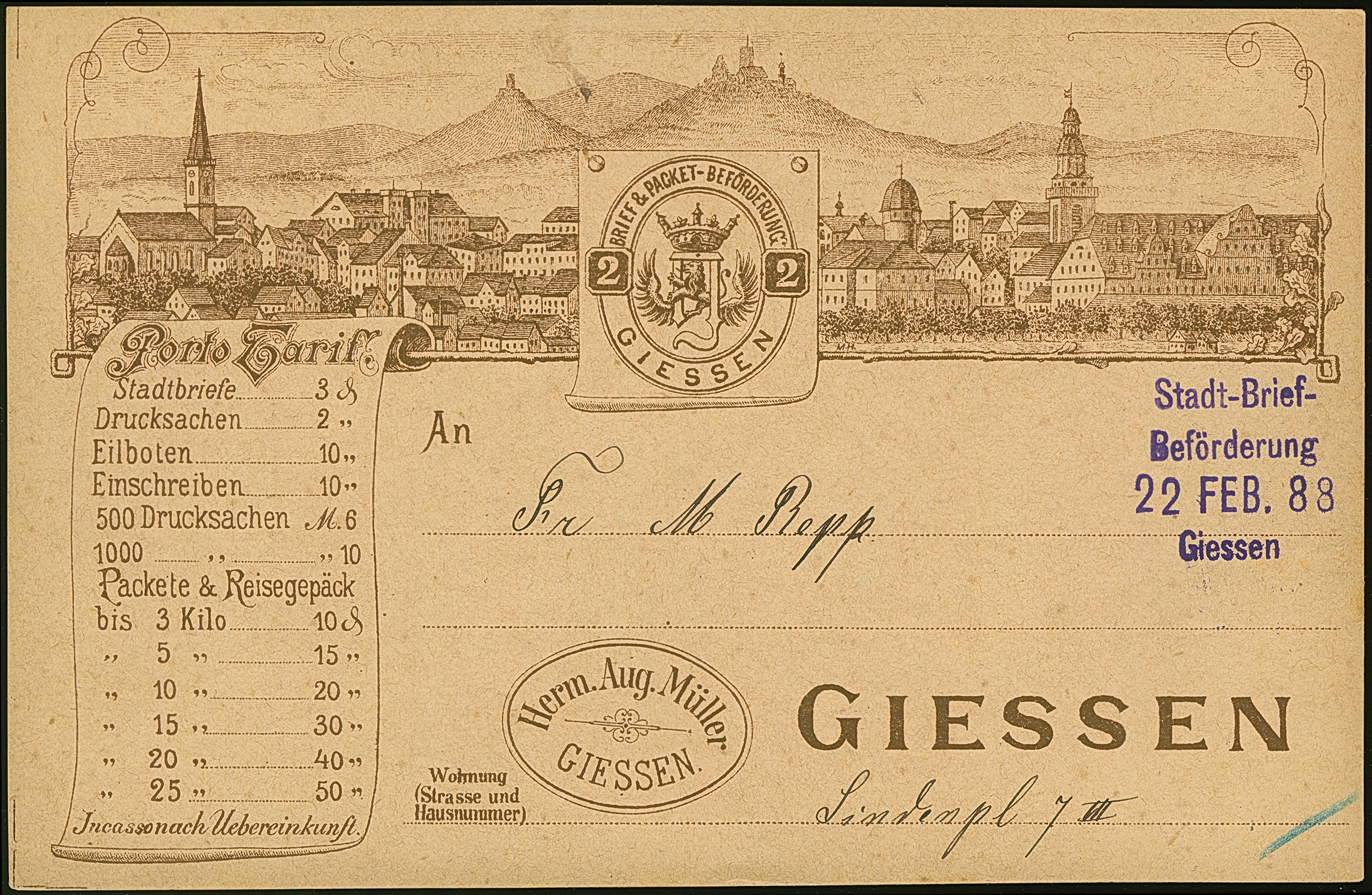 1888, Ganzsachenkarte auf Privat-Bestellung 2 Pfg. mit Zudruck der Firma “Herm.Aug.Müller GIESSEN” gebraucht mit violettem L4 “Stadt-Brief-Beförderung 22.FEB.88 Giessen”, im Ortsverkehr befördert. Die nicht häufige Karte ist in einwandfreier Erhaltung