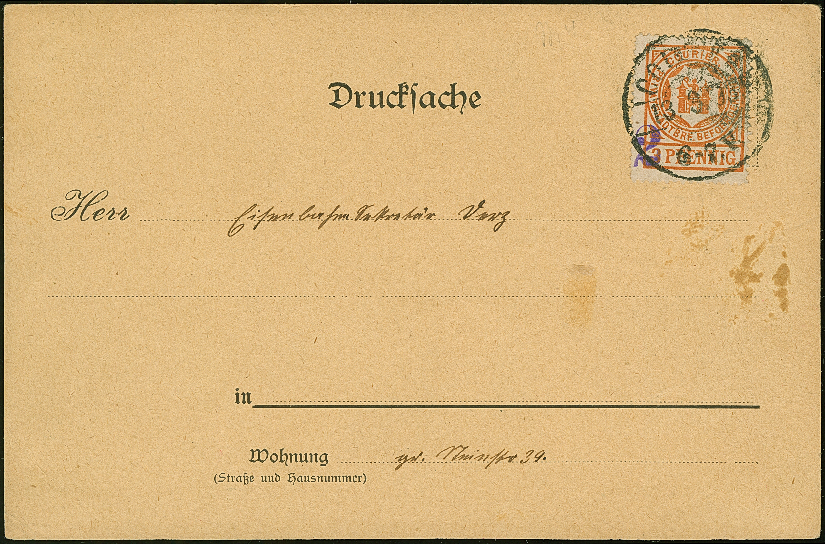 Courier: 1893, Leipzig 3 Pfg. graublau mit violettem Briefträgerstempel “G. Kroot” auf Briefkuvert. Die Marke links fehlerhaft, ansonsten in guter Erhaltung