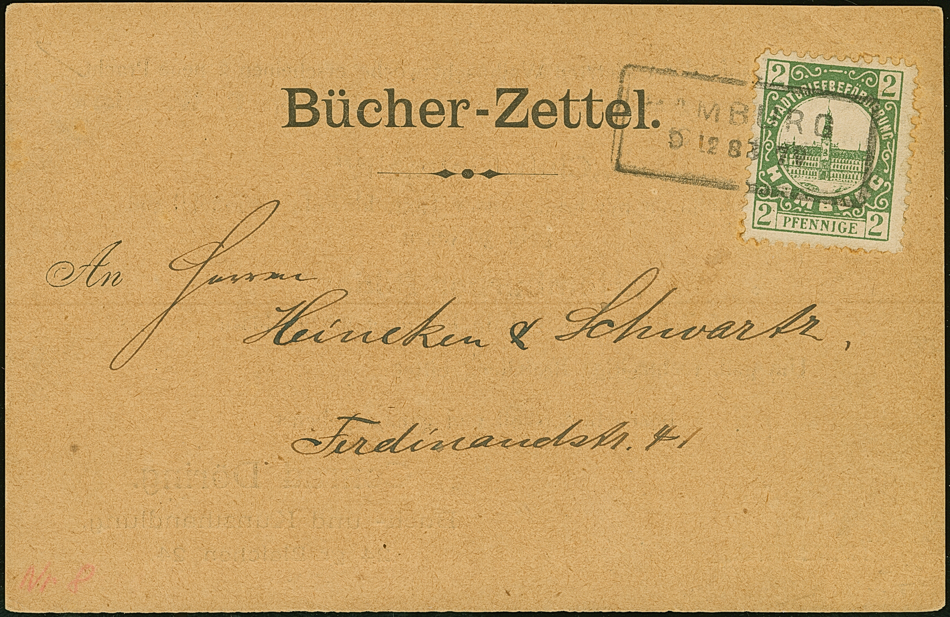 Hammonia: 1888, Hamburger Rathaus 2 Pfg. grün mit Rahmenstempel “HAMBURG 6.12.88” auf Postkarte “Bücher-Zettel” mit rückseitiger Werbung der Buch- und Kunsthandlung Conrad Döring, in einwandfreier Erhaltung