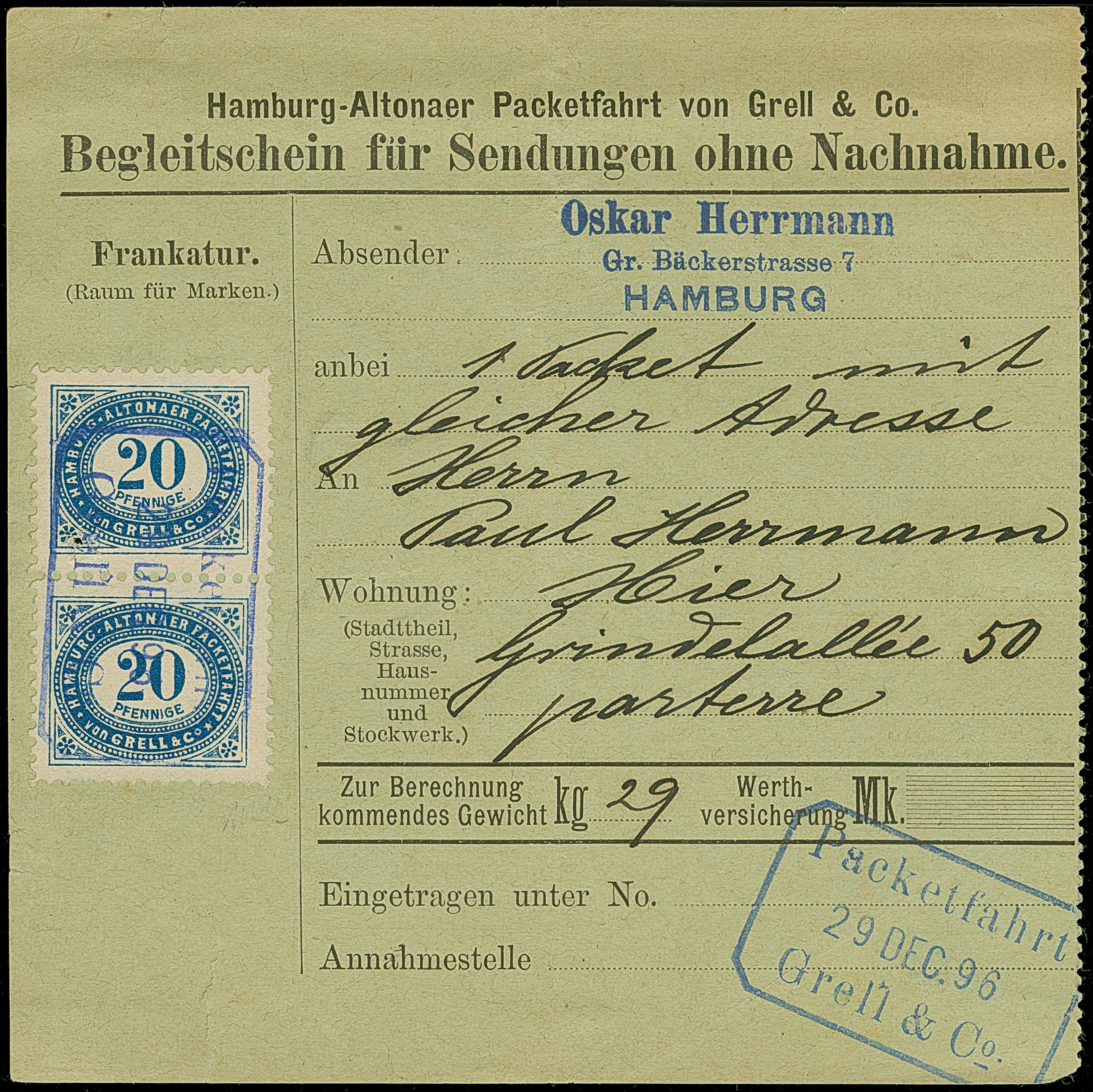 Hamburg-Altoner Packetfahrt: 1896, 20 Pfg. blau im senkrechten Paar mit violettem Rahmstempel “Packetfahrt Crell & Co. 29.DEC.96” auf Begleitschein für Sendungen ohne Nachnahme. Das Formular mit senkrechter Faltung und unten mit kleinem Einriss, die obere Marke mit Nagelloch, ansonsten in einwandfreier Erhaltung. Eine äußerst seltene Mehrfachfrankatur