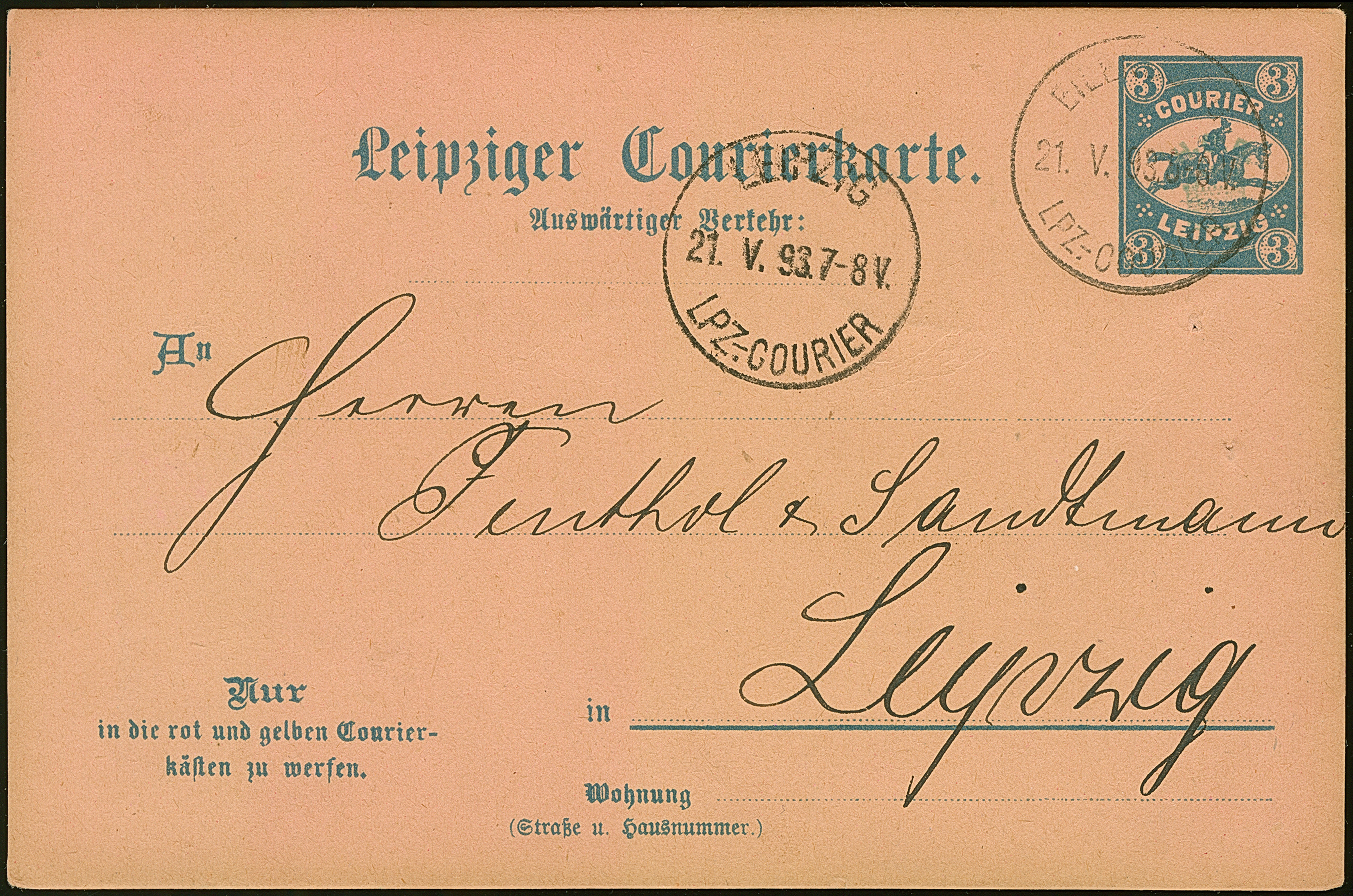 Courier: 1893, Ganzsachenkarte 3 Pfg. mit Stempel “EILENBURG LPZ.-COURIER 21.V.93” und viel Text nach Leipzig mit vorderseitigem Ankunftsstempel, in einwandfreier Erhaltung