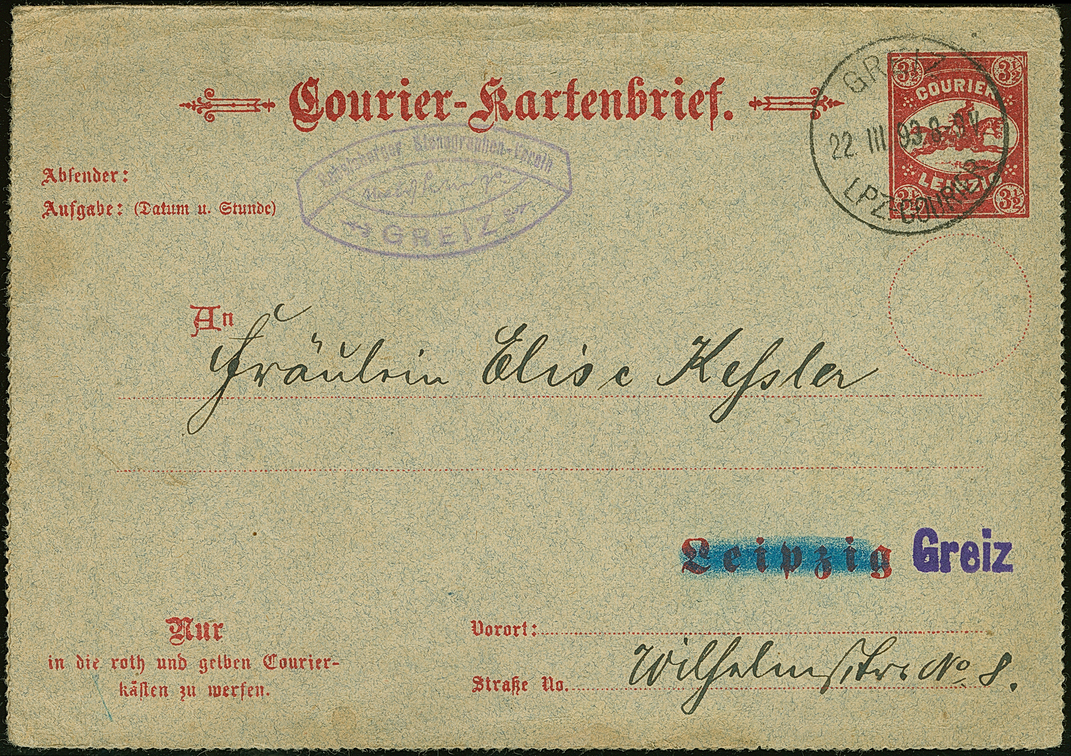 Courier: 1893, Ganzsachen-Kartenbrief 3½ Pfg. mit Stempel “GREIZ LPZ.-COURIER 22.III.93” und Text, im Ortsverkehr befördert mit violettem L1 “Greiz” in der Anschrift. Der Kartenbrief ist ohne Ränder und hat Beförderungsspuren im Rand, eine seltene Verwendung dieser Ganzsache in Greiz