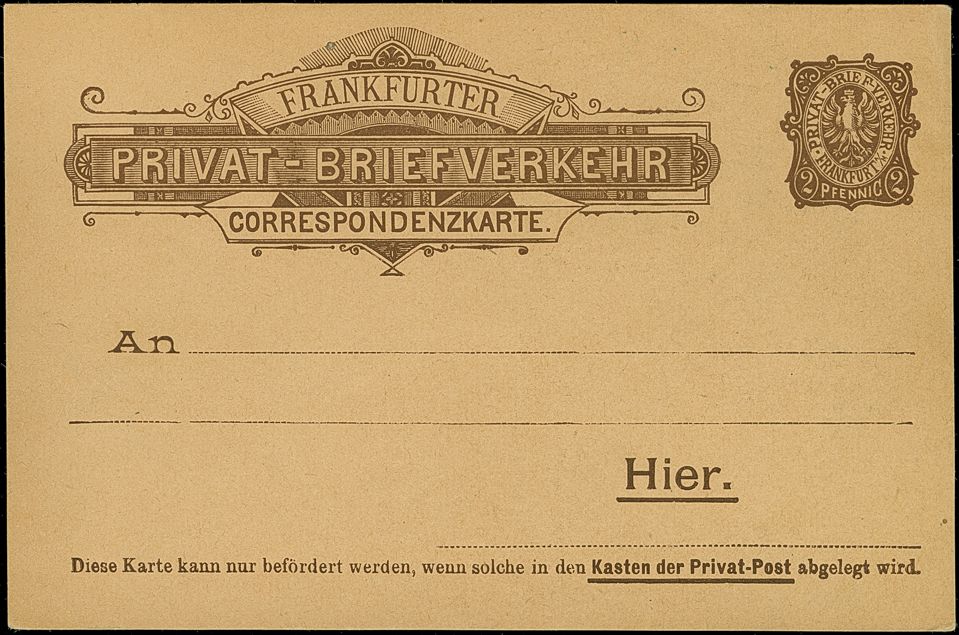 Privat-Briefbeförderung: 1893, 2 Pfg. orangebraun mit violettem DKr. “HANAUER PRIVAT-BRIEF-VERKEHR 6-DEC.1894” auf Vordruckbrief “Conrad Deines Jr., Hanau” im Ortsverkehr. Der Umschlag oben mit stärkeren Öffnungsmängeln, die Marke ist in einwandfreier Erhaltung, selten