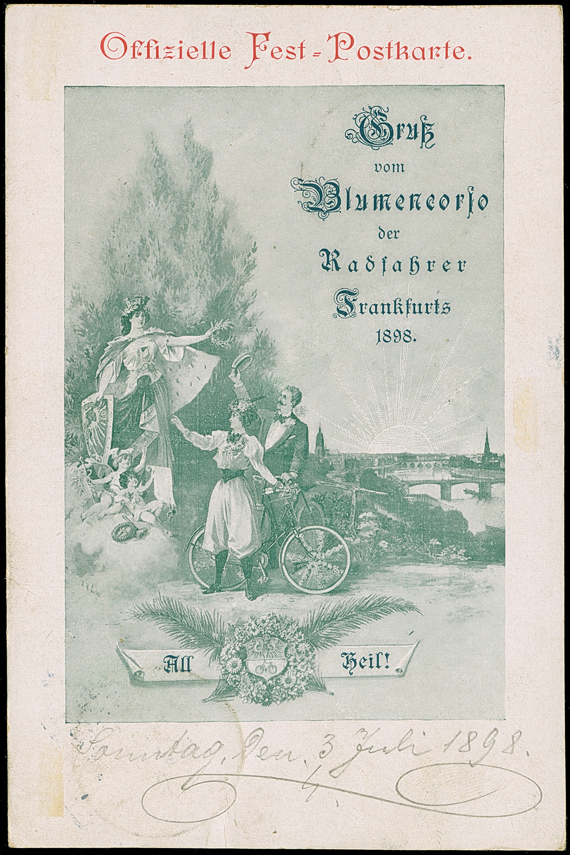Privat-Brief-Verkehr: 1897, Rosen- und Pflanzenausstellung 2 Pfg. orange und Deutsches Reich Krone/Adler 5 Pfg. mit übergehendem Sonderstempel “FRANKFURT ROSEN-AUSSTELLUNG 4.7.98” auf amtlicher Ansichtskarte “Gruß vom Blumencorso der Radfahrer Frankfurts 1898”, in guter Erhaltung