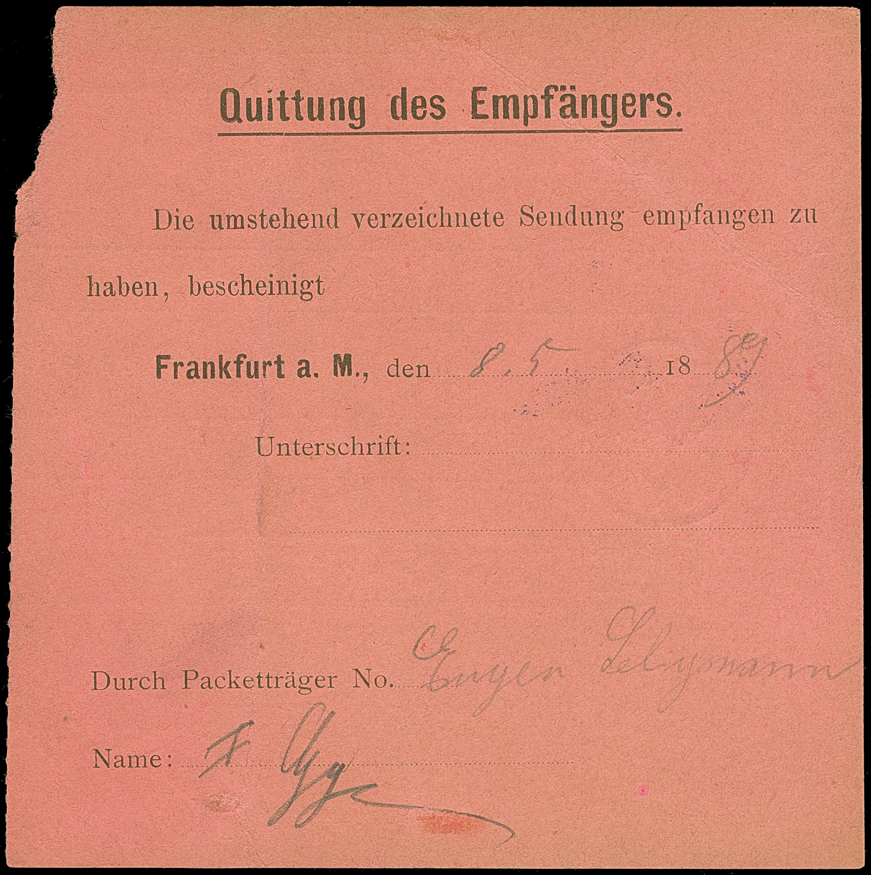 Erfurt-Privat-Stadtbrief-Beförderung: 1888, Wappenzeichnung 15 Pfg. hellblau mit violettem Stempel “ERFURT 15.Aug.88” auf Paket-Begleitschein im Ortsverkehr. Das Formular oben mit Randfehlern und Tesafleck sowie wie die Marke mit Altersspuren. Trotz der Einschränkungen eine außerordentlich seltene Verwendung