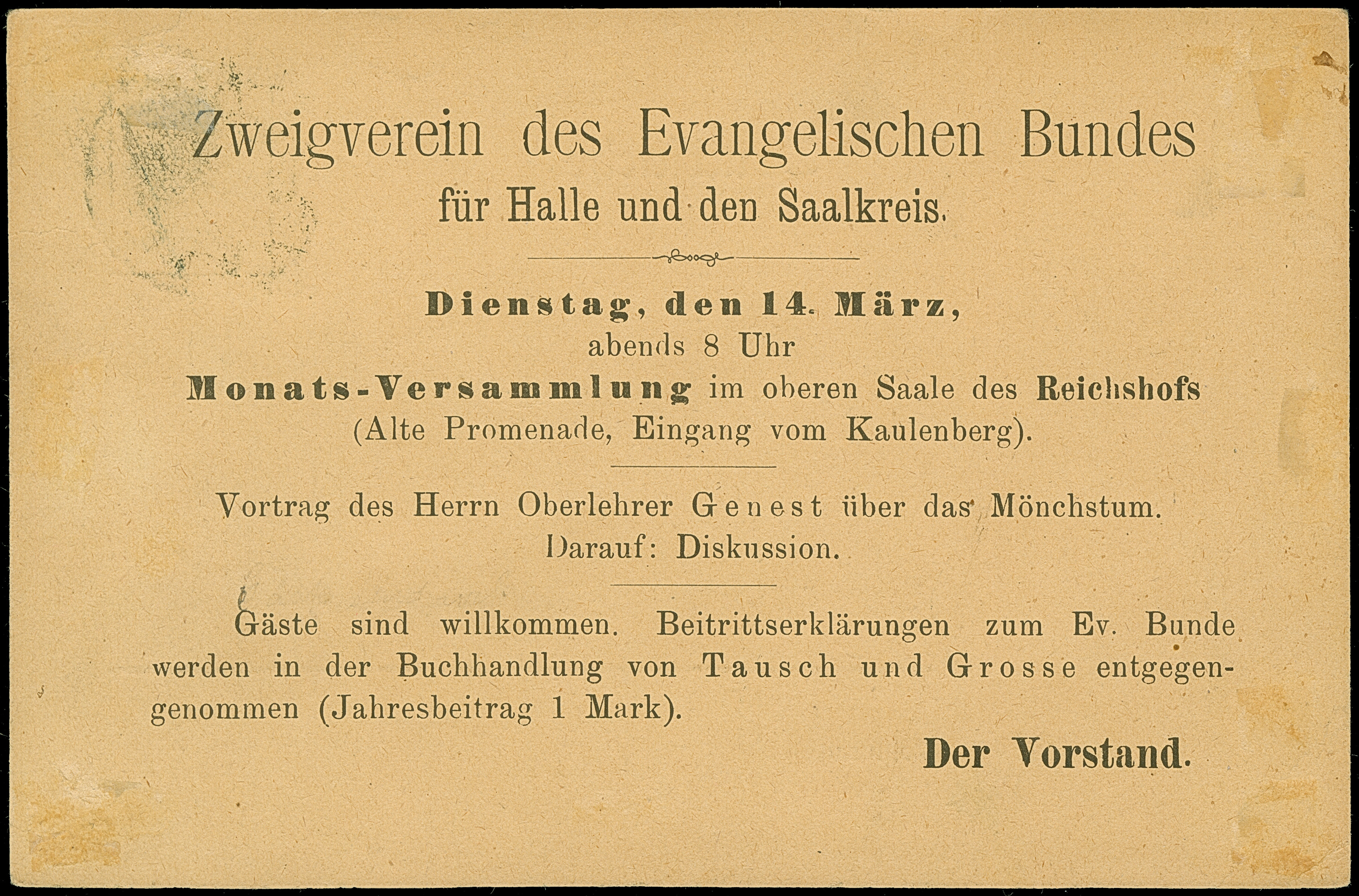 Halle/Saale-Courier: 1893, 2 auf 3 Pfg. gelbbraun mit violettem Aufdruck in Type I, mit klarem Stempel “COURIER 4.8.93” auf Ortsbriefkuvert. Die Marke mit leichten Altersflecken, ansonsten in guter Erhaltung