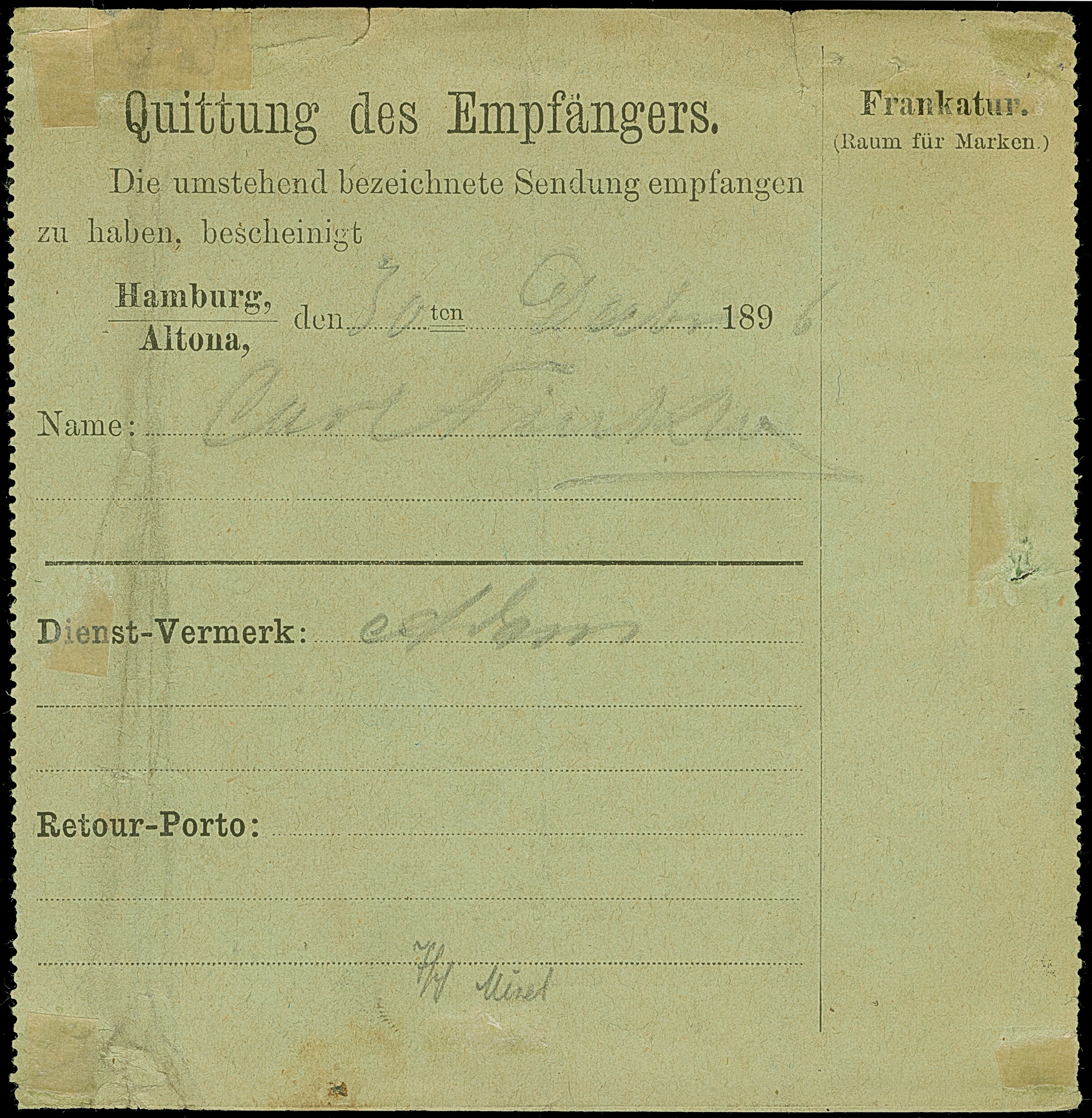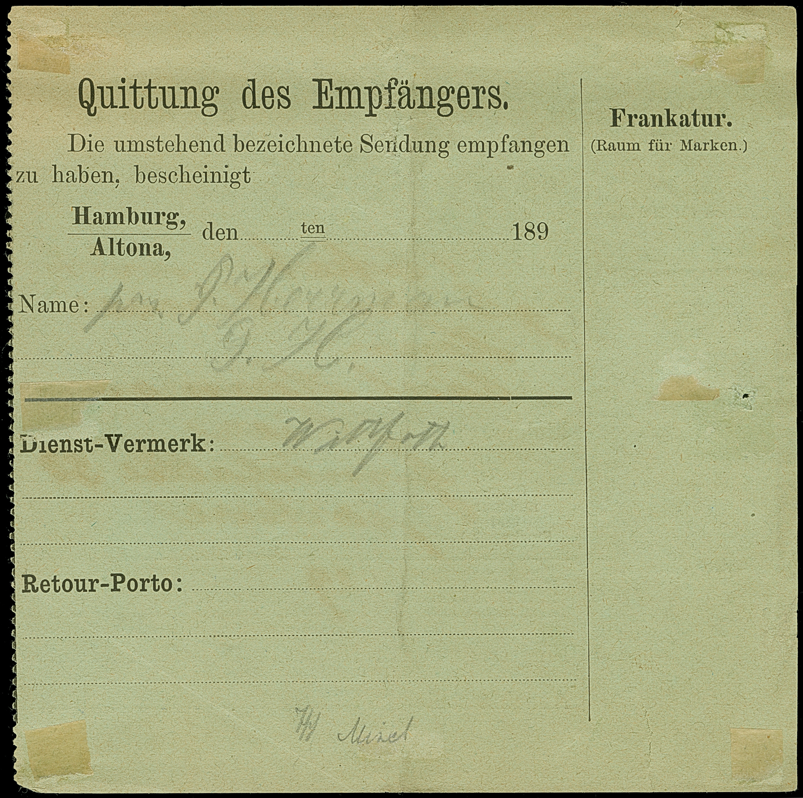 Hamburg-Altoner Packetfahrt: 1896, 15 Pfg. graulila im senkrechten Paar mit violettem Rahmstempel “Packetfahrt Crell & Co. 31.DEC.96” auf Begleitschein für Sendungen ohne Nachnahme. Das Formular mit senkrechter Faltung und kleinen Randfehlern oben sowie links mit Einriss, dadurch ist die obere Marke fehlerhaft. Trotz der Einschränkungen eine außerordentlich seltene Verwendung