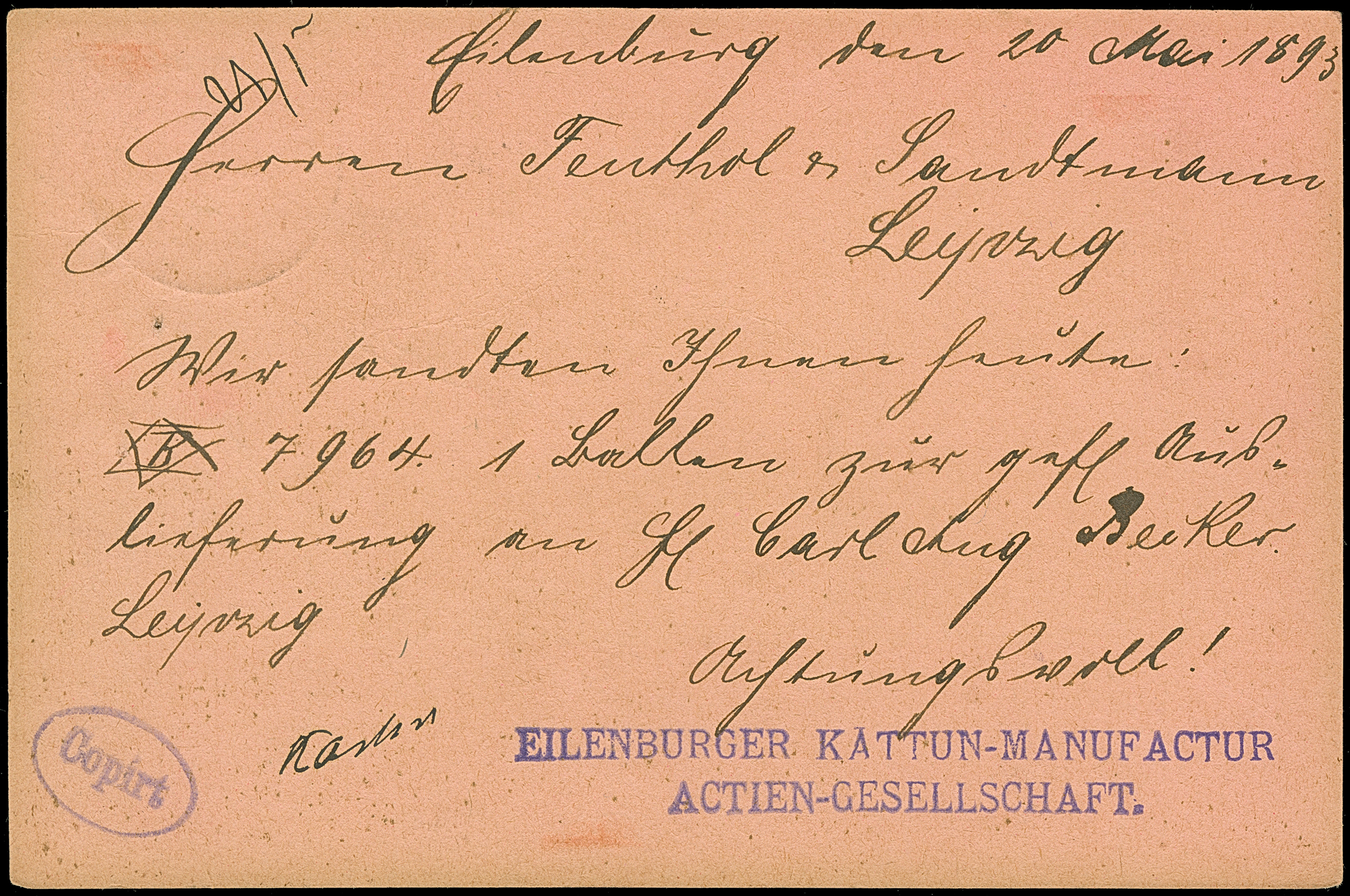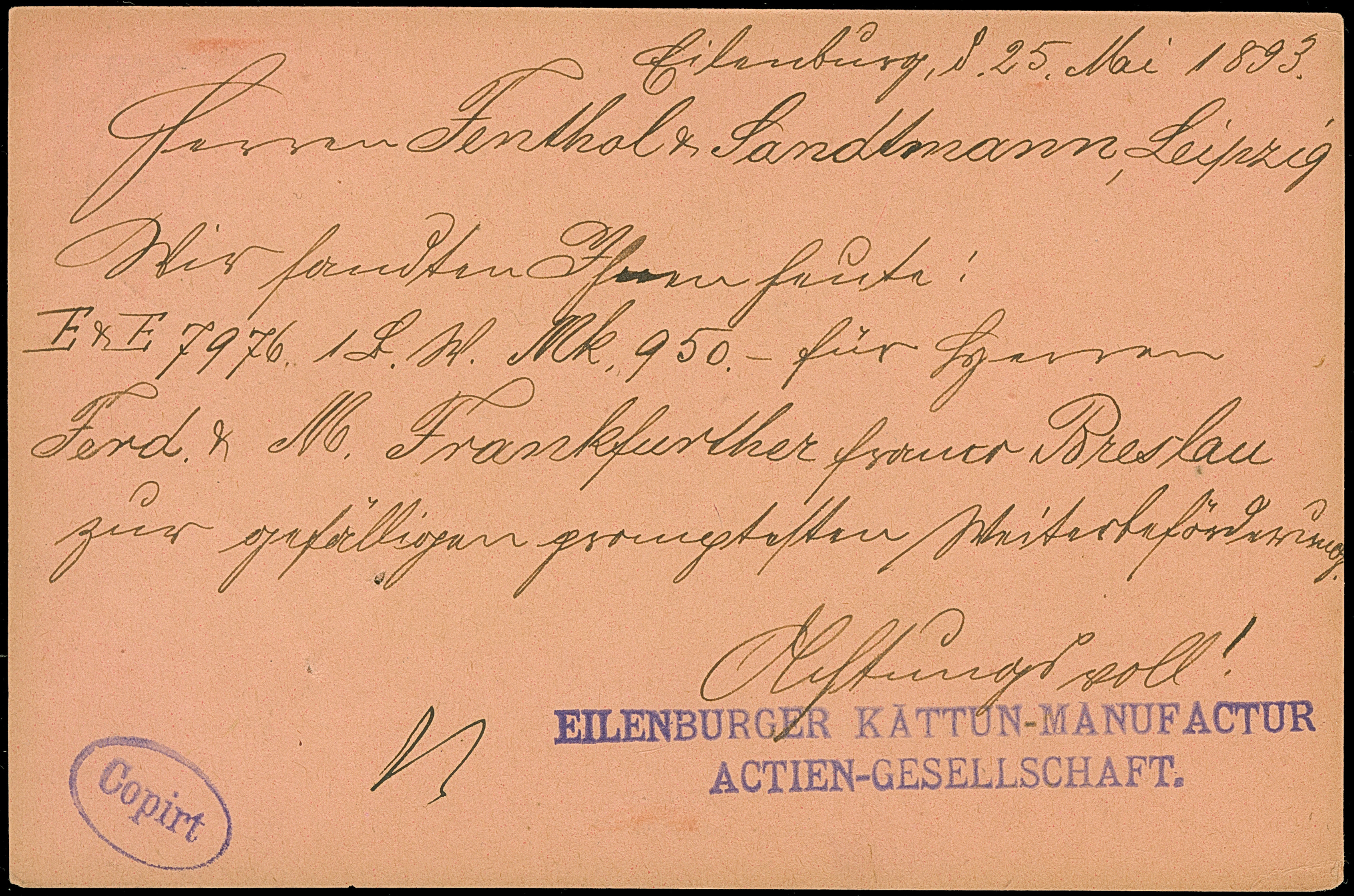 Courier: 1893, Ganzsachenkarte 3 Pfg. mit Stempel “EILENBURG LPZ.-COURIER 26.V.93” und viel Text nach Leipzig mit vorderseitigem Ankunftsstempel, in einwandfreier Erhaltung