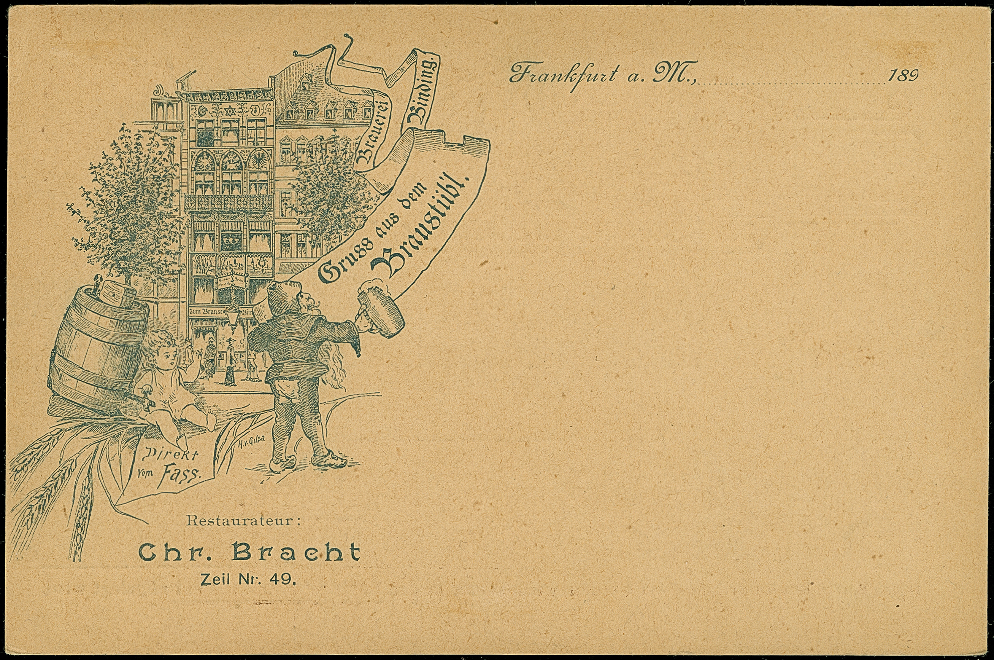 Privat-Brief-Verkehr: 1893, Ganzsachenkarte 2 Pfg. braun mit rückseitigem Bildzudruck “Gruss aus dem Braustübl” mit Abbildung “Faß mit Baum, Kind und Zwerg mit Bierkrug", ungebraucht, leichte Falzspuren