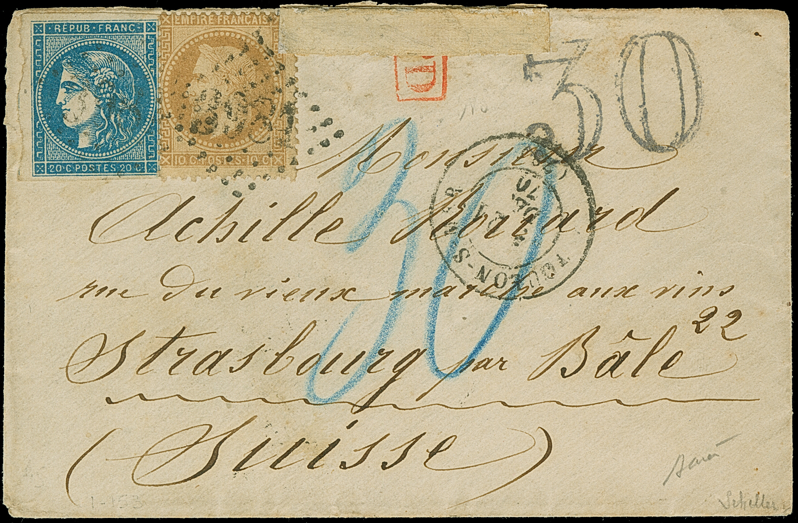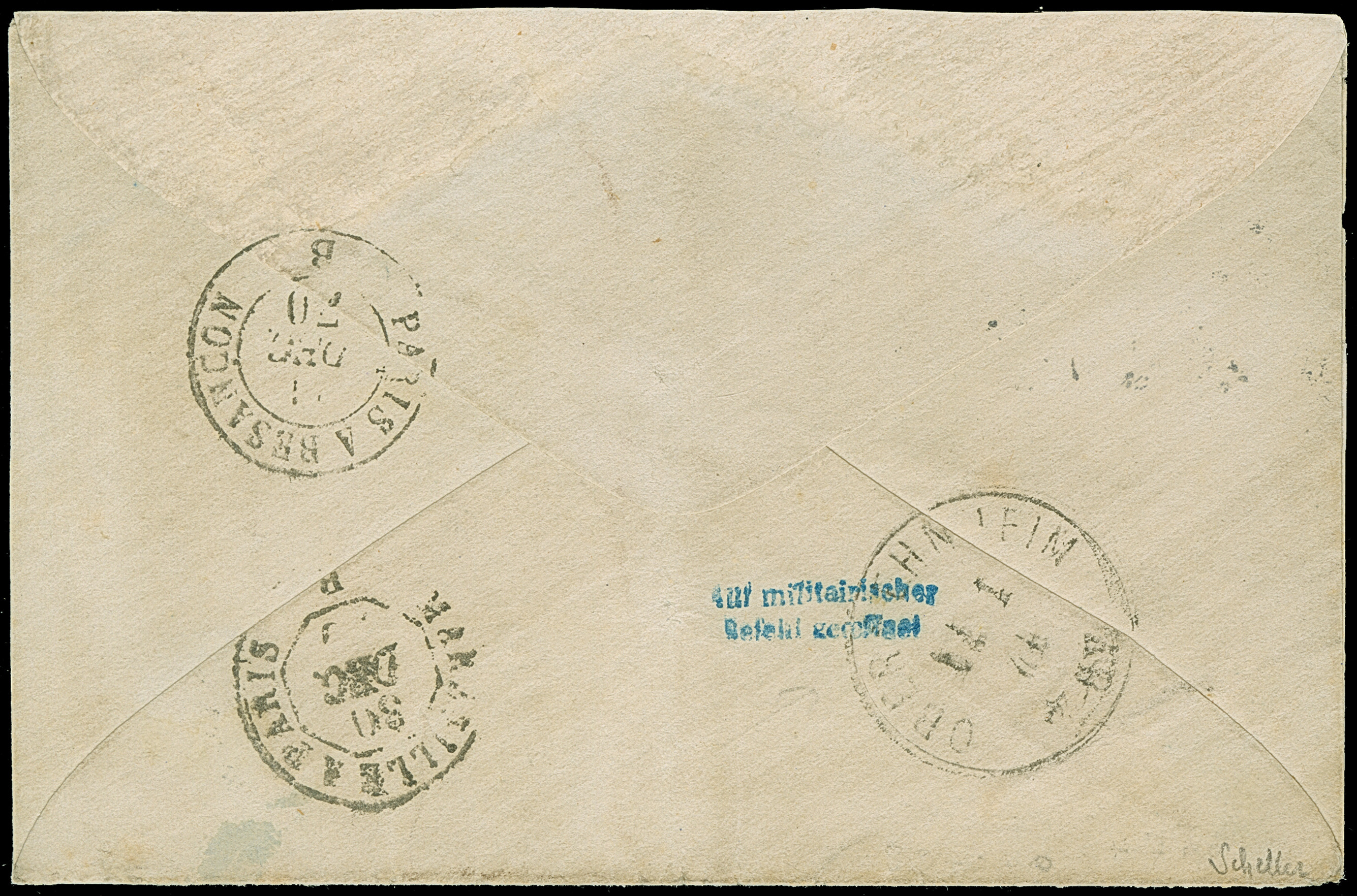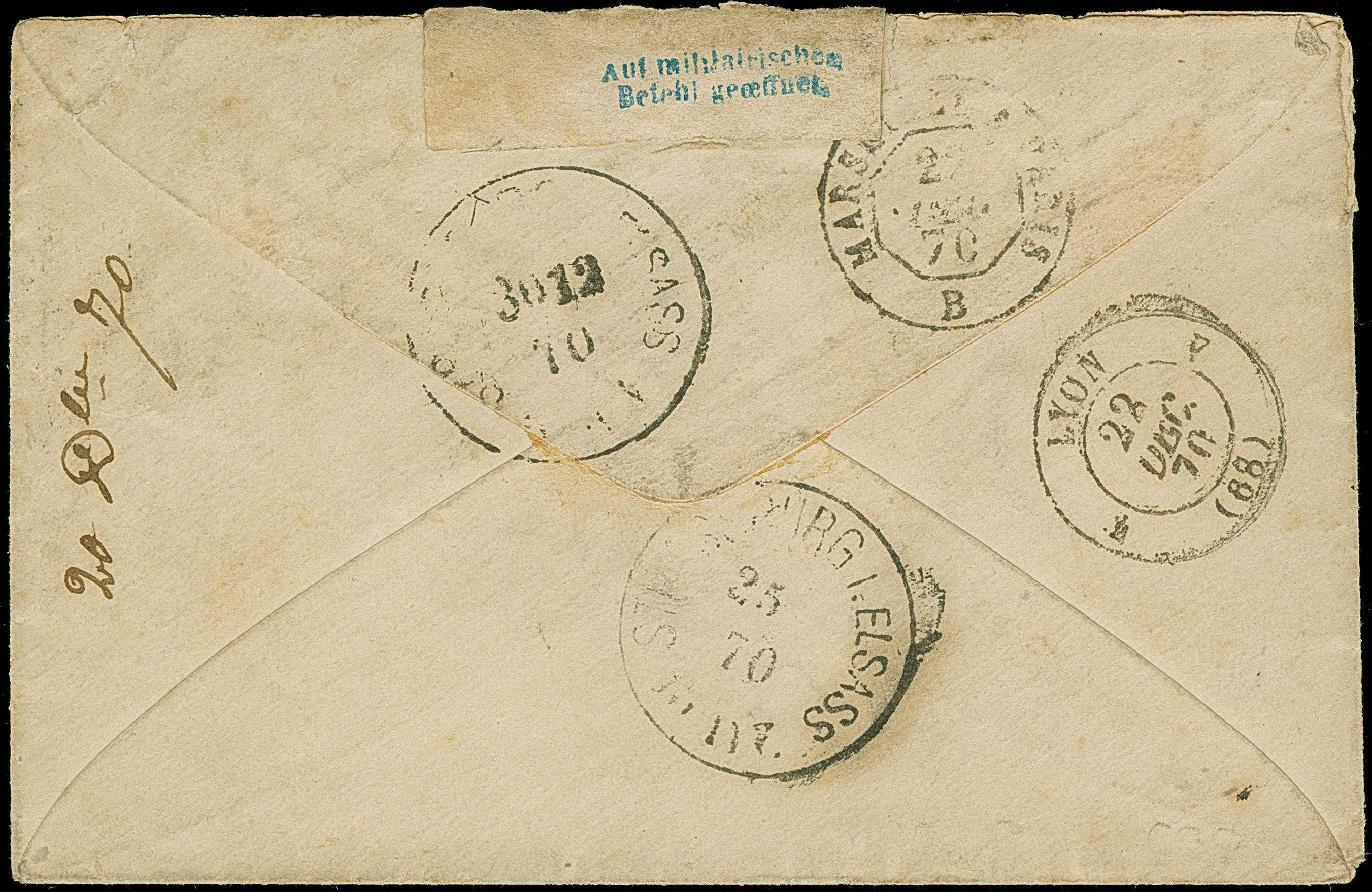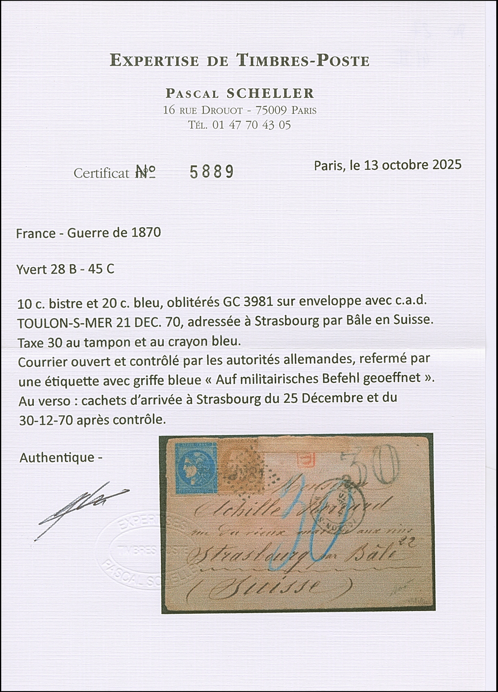 “AUF MILITÄRISCHEN BEFEHL GEOEFNET”, blue two-line handstamp on small label (cut upon arrival) to envelope to Strasbourg with Napoleon 10 c. yellow-brown and Bordeaux 20 c. blue tied by GC “3981” with cds. “TOULON-S-MER 21 DEC 70”, endorsed “par Bale (Suisse)”, red “PD”, German blue crayon “30” and postage due “30”, reverse transit and arrival cds “STRASSBURG ELSASS 25 12 70”, fine. The attractive convergence of a rare military censor mark and an interesting route, signed Baudot and Scheller with the latter´s certificate (2025)