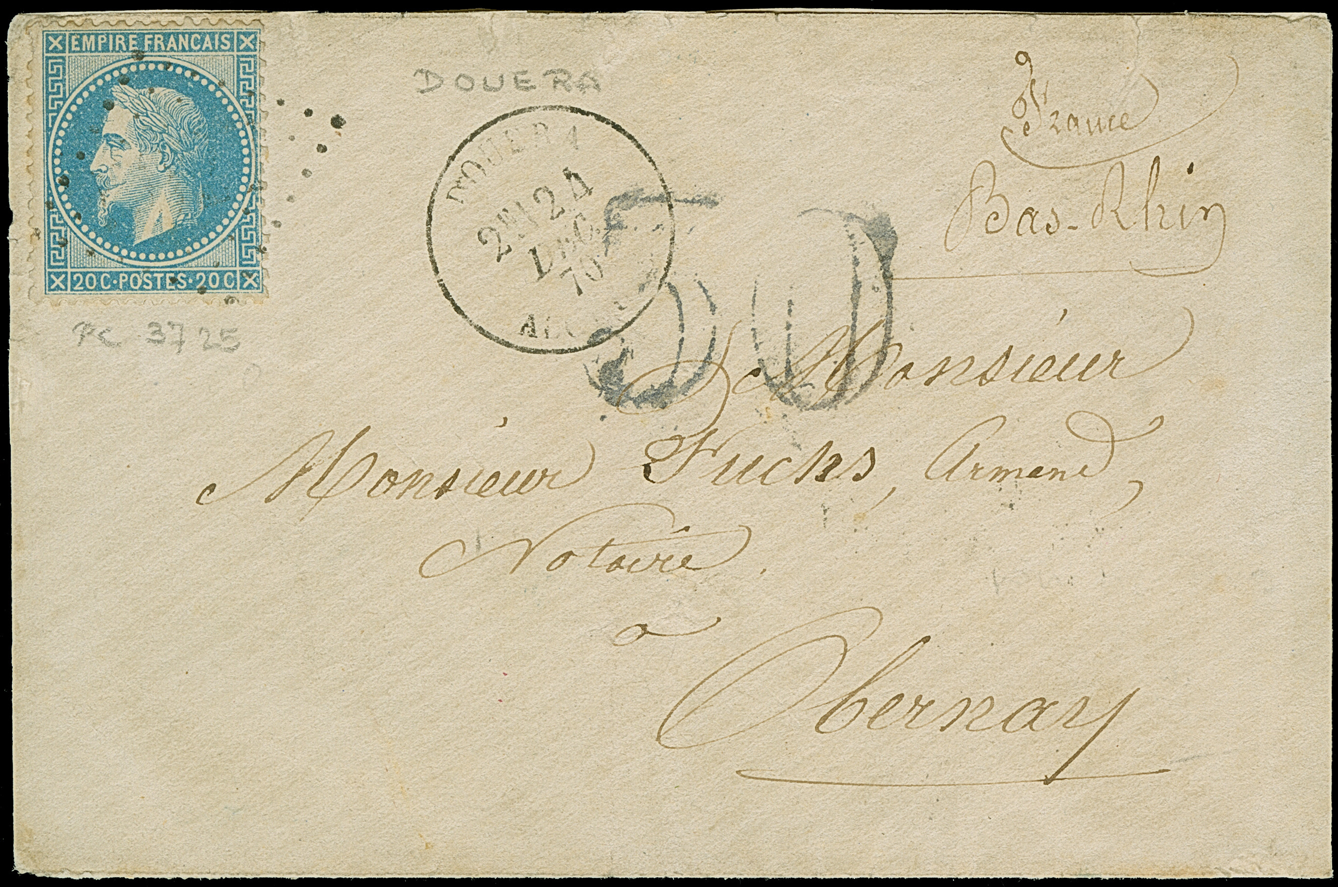 “AUF MILITÄRISCHEN BEFEHL GEOEFNET”, superb blue two-line military censor handstamp to reverse of an envelope from “DOUERA 24 DEC. 70”, French Algeria, to Obernay with 20 c. Napoleon blue, German postage due “30” and arrival cds. “OBEREHNHEIM 11 1 71”, fine and rare cover with a delightful origin, signed Scheller