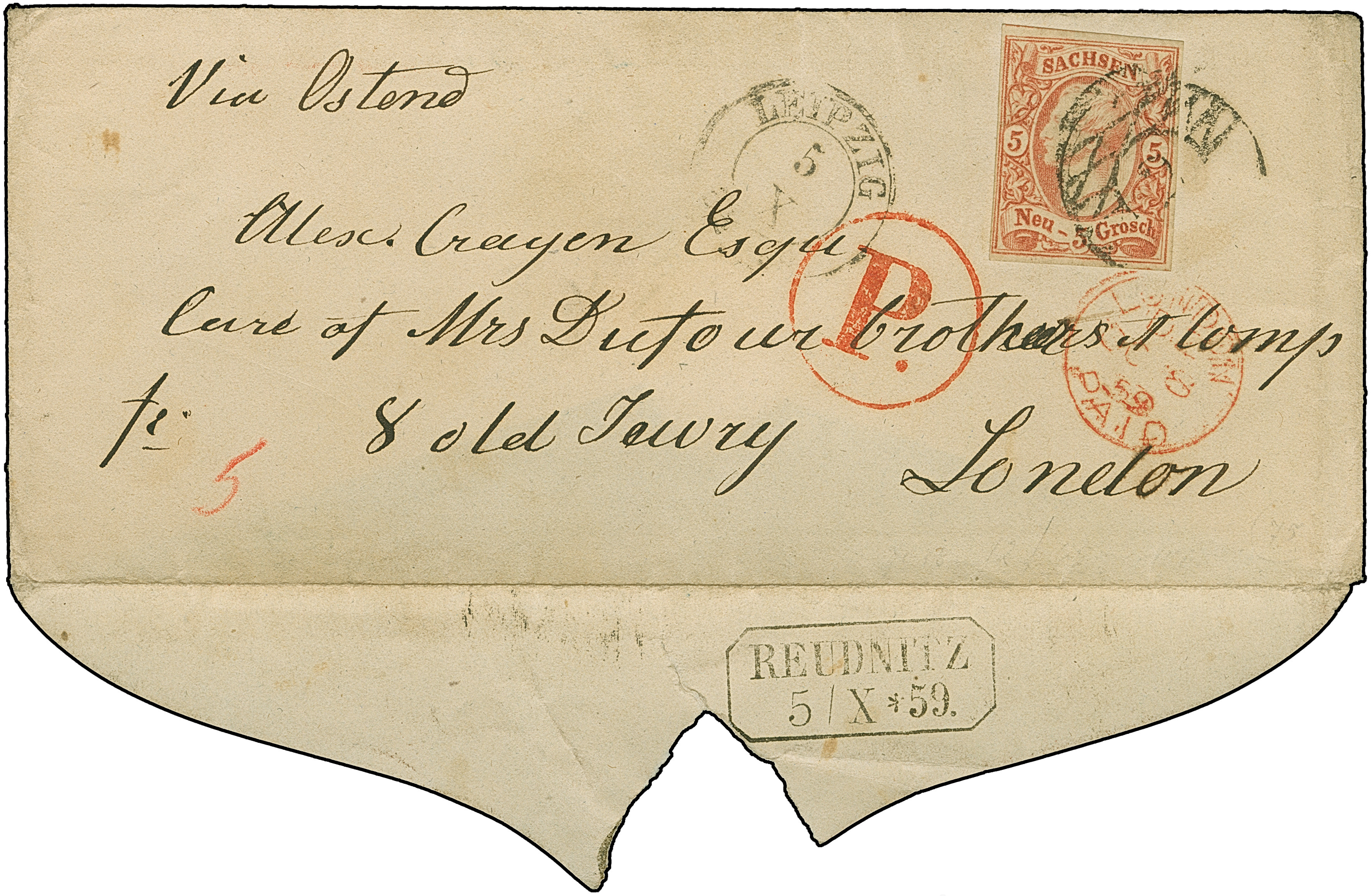 "REUDNITZ 5/X 59", der Ra2 der Briefsammlung, sauber rückseitig abgeschlagen auf Briefkuvert mit Johann 5 Ngr. ziegelrot, voll-bis breitrandig, mit Nr. "2" und nebengesetztem DKr. "LEIPZIG 5 X 59" nach London, mit vorderseitigen Ankunftsstempel. Es sind nur etwa ein Dutzend Belege dieser nur 2 Jahre existierenden Briefsammlung registriert; auf Auslandsbrief ganz außergewöhnlich.