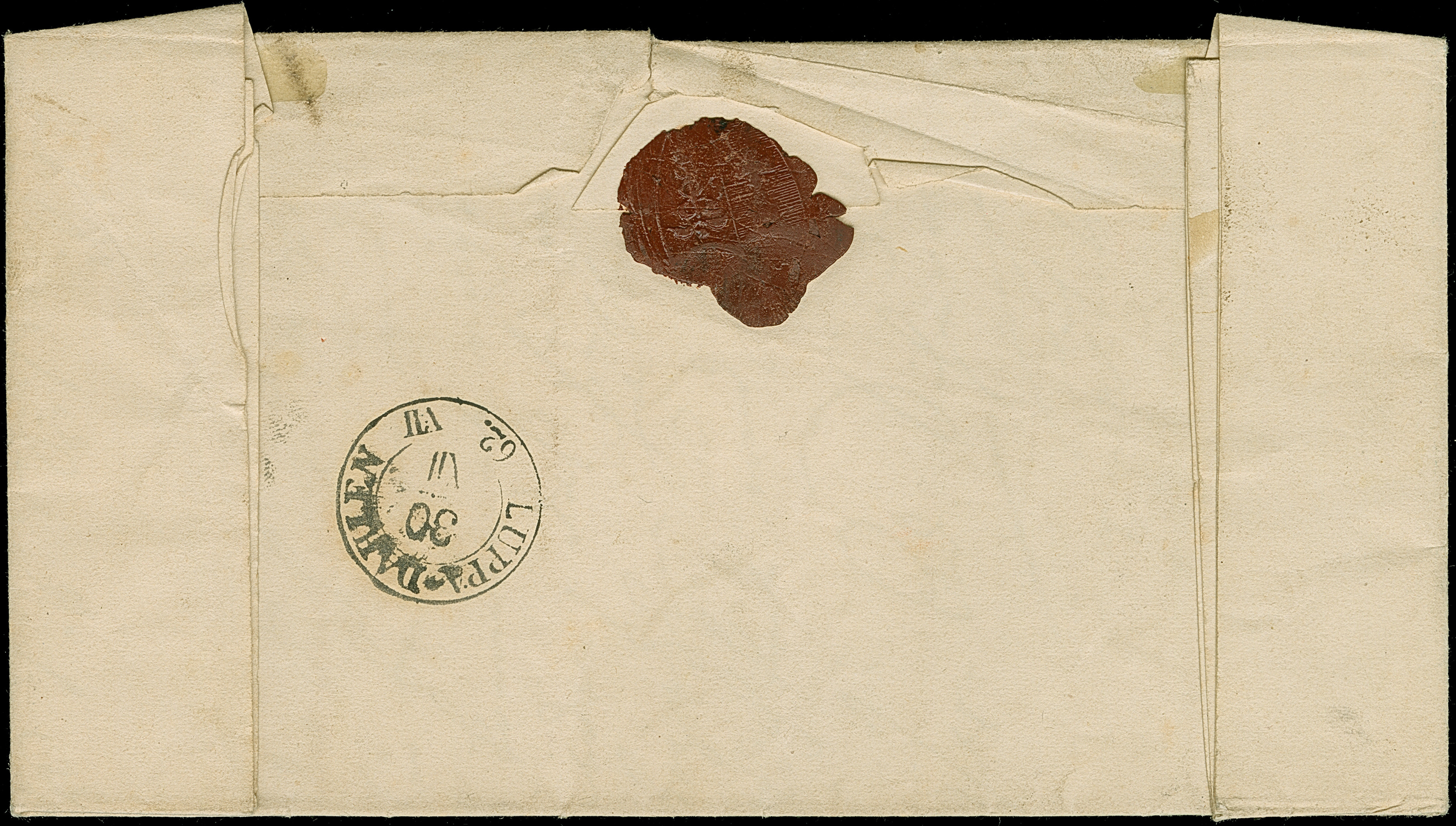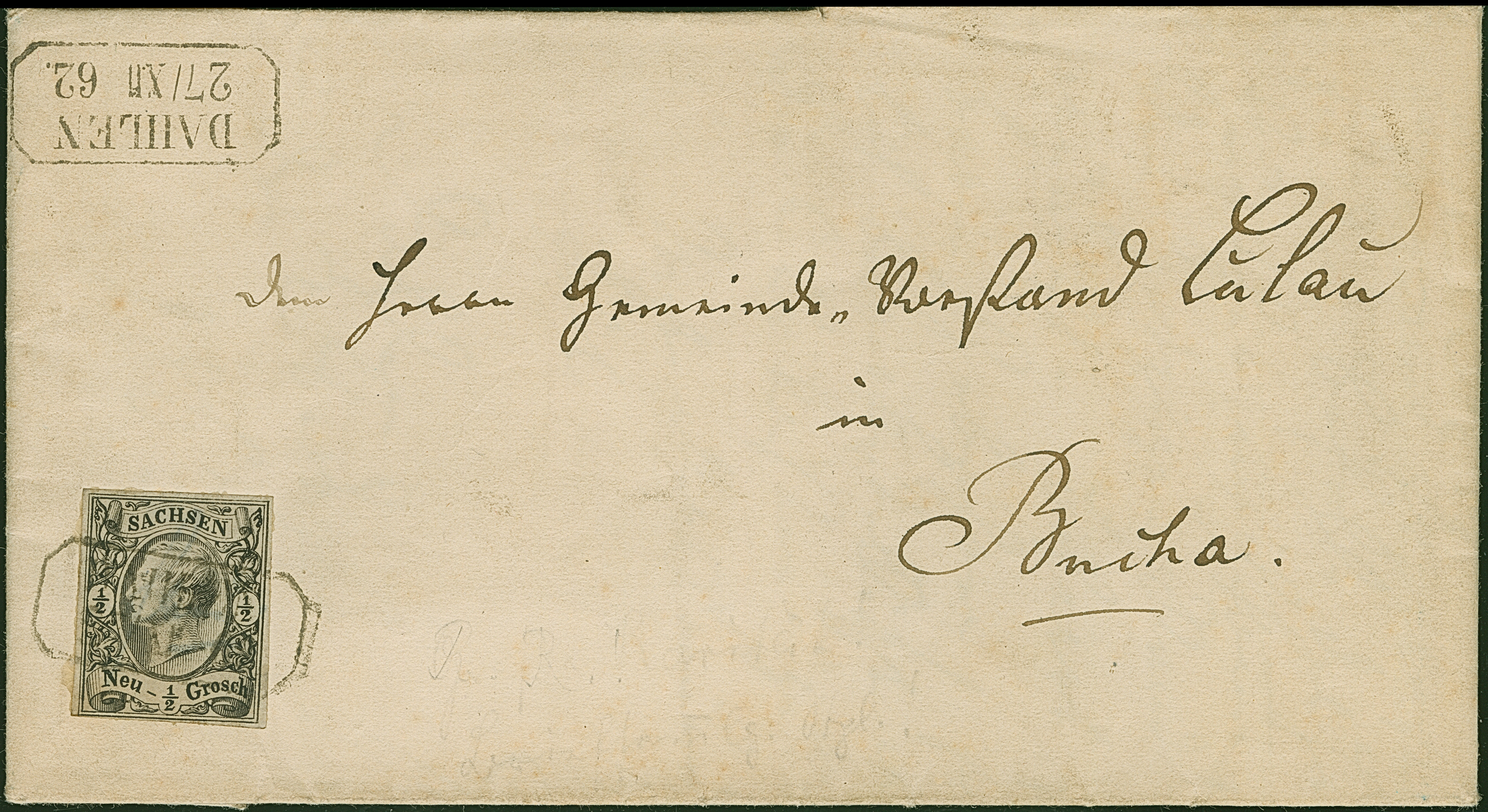 "DAHLEN 27/XII 62", der Ra2 der Briefsammlung, sauber auf- und nebengesetzt auf Johann ½ Ngr., voll- bis breitrandig, auf komplettem Faltbrief in das benachbarte Bucha. Eine äußerst seltene Entwertung; PROFI hat keinen weiteren Beleg registriert.