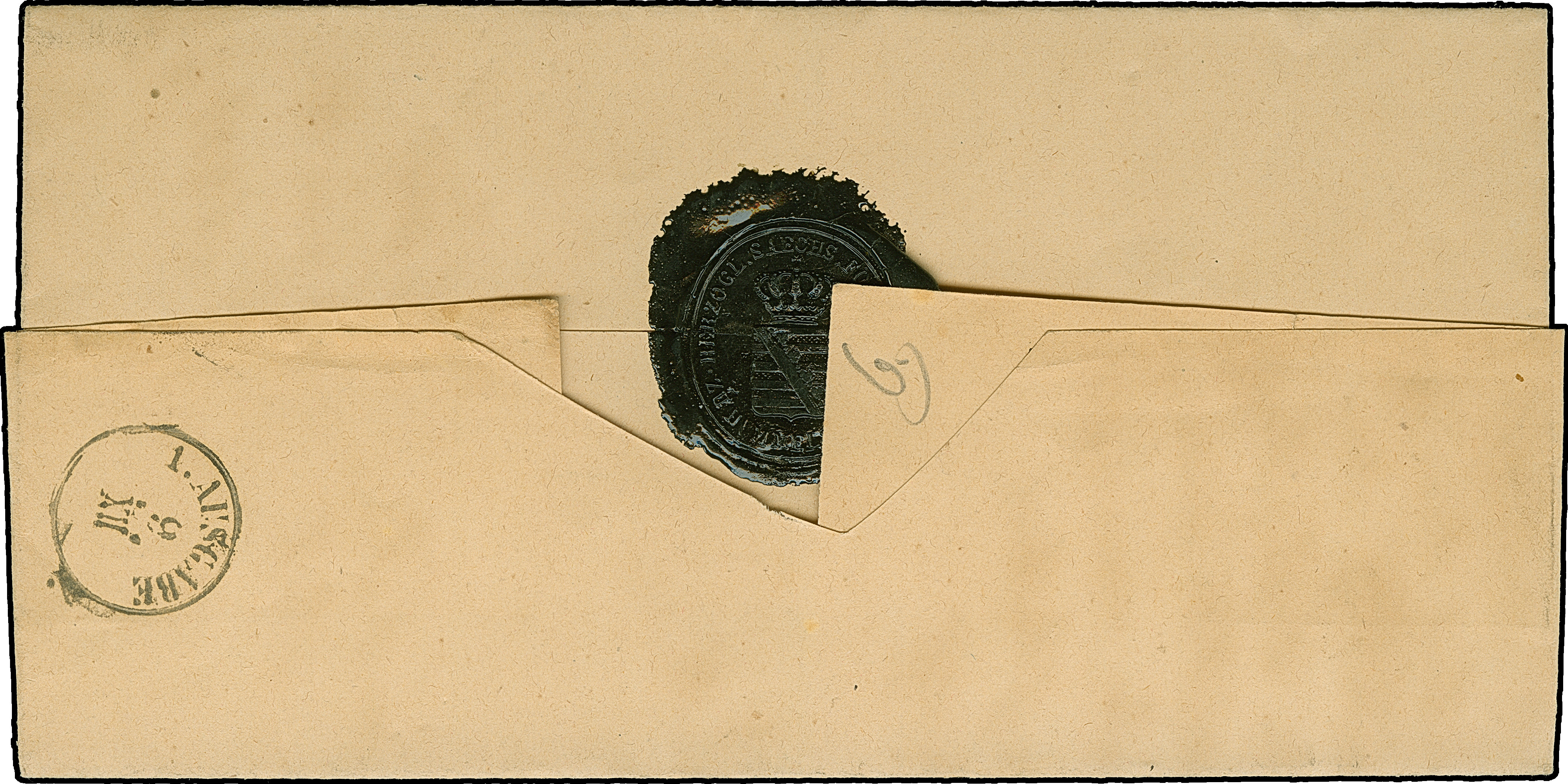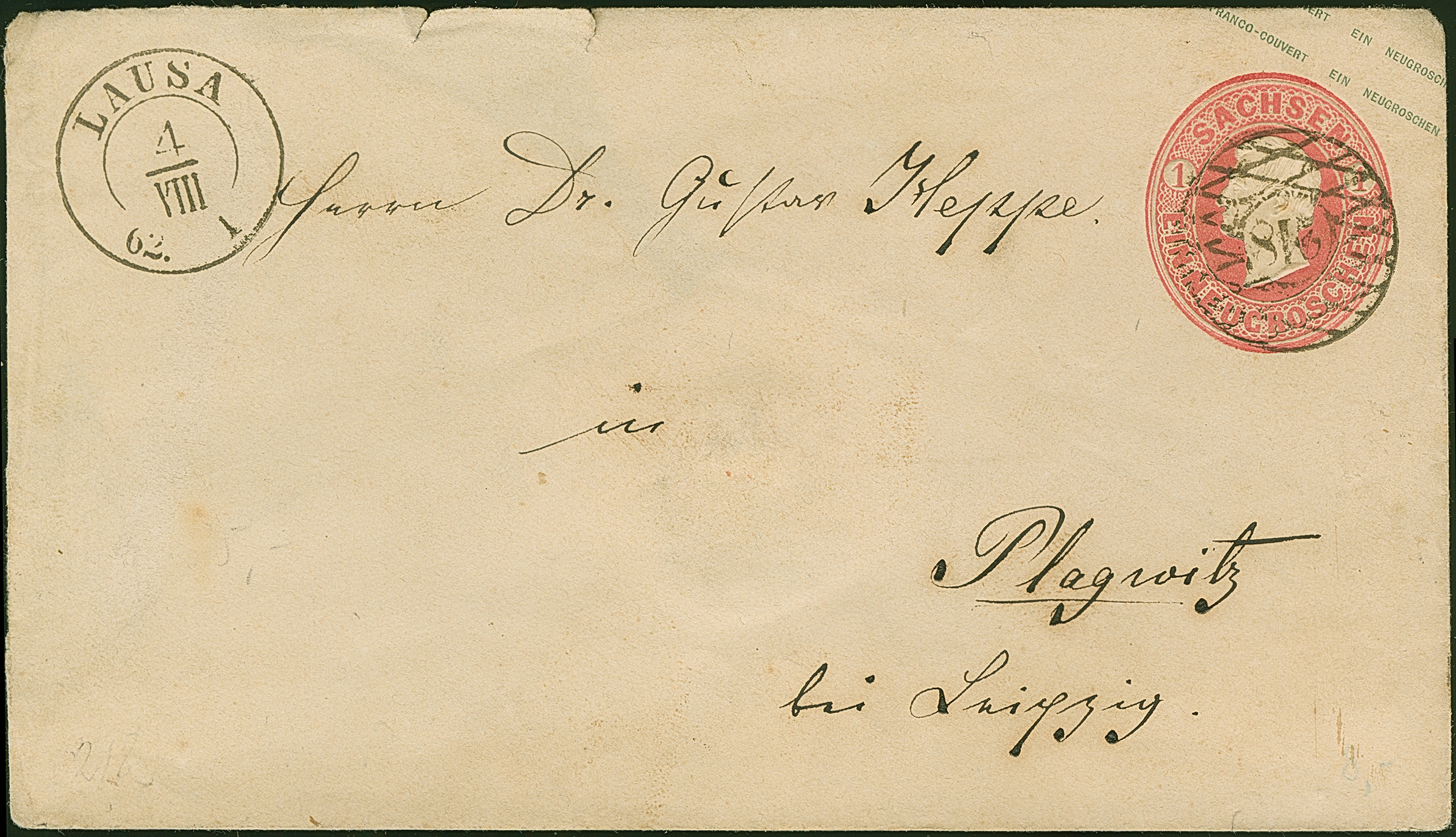 "218" klar auf Umschlag Johann 1 Ngr. rosa, mit sauber nebengesetztem DKr. "LAUSA 4/VIII 62" nach Plagwitz. Das Kuvert rauh geöffnet, dadurch oben 2 kleine Einrisse und kleines Teil rückseitig fehlend. Ein insgesamt attraktives Belegstück des seltenen Stempels.