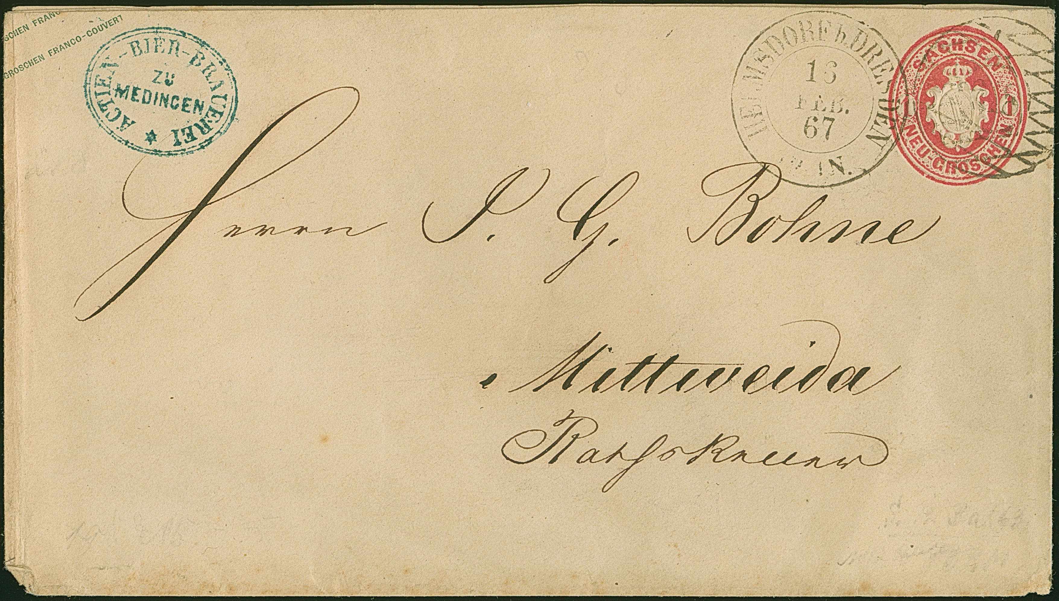 "218" auf Umschlag Wappen 1 Ngr. rosa, mit sauber nebengesetztem DKr. "HERMSDORF b. DRESDEN 16 FEB. 67" nach Mittweida. Geringe Beförderungspuren.