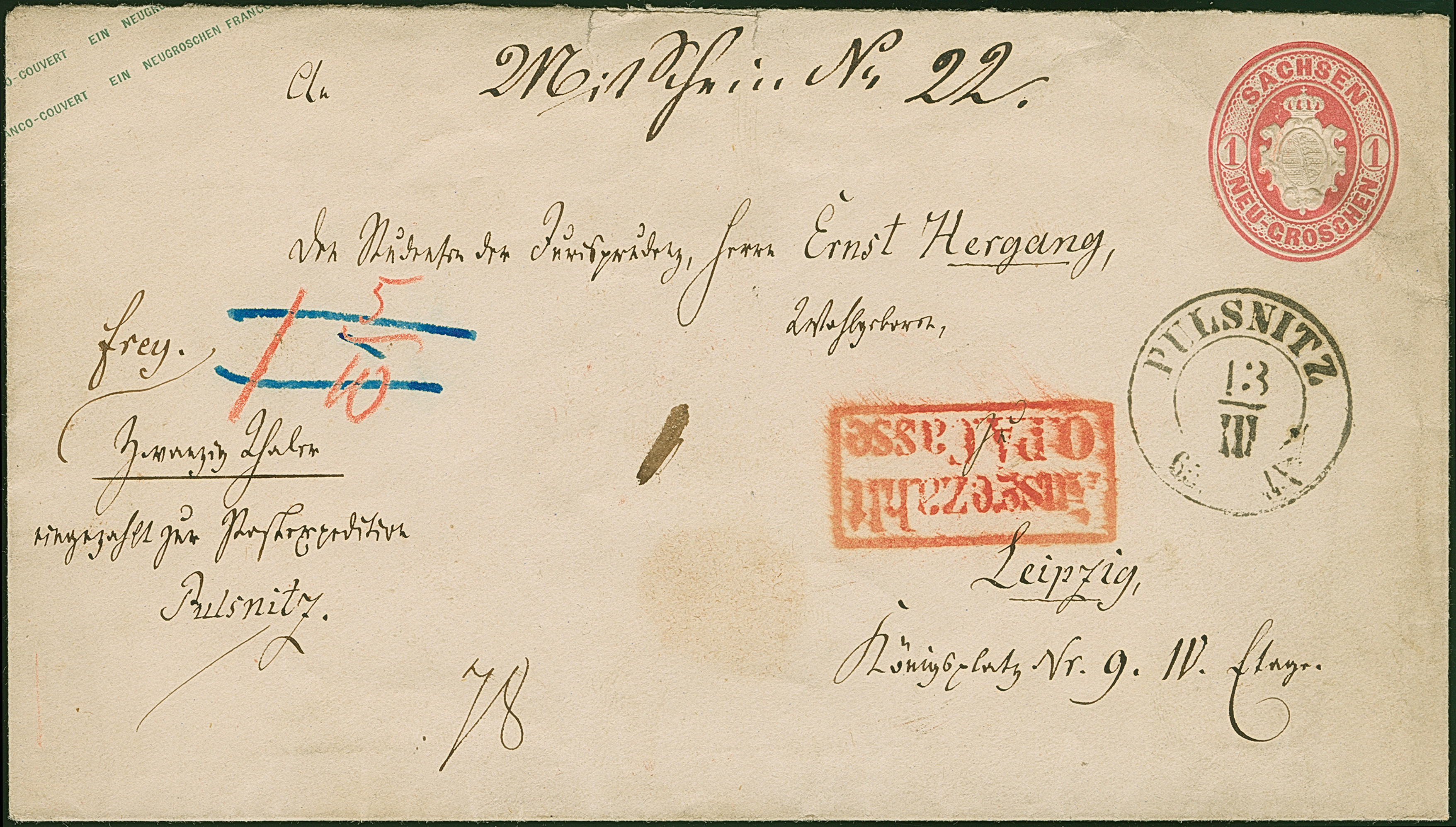 Umschlag 1 Ngr. mit nebengesetztem DKr. "PULSNITZ 13/III 65" und handschriftlichem Vermerk "20 Thaler eingezahlt zur Postexpedition Pulsnitz", nach Leipzig, mit vorderseitigen roten "Ausgezahlt O.P.A. Casse". Ein seltener Postanweisung-Vorläufer.