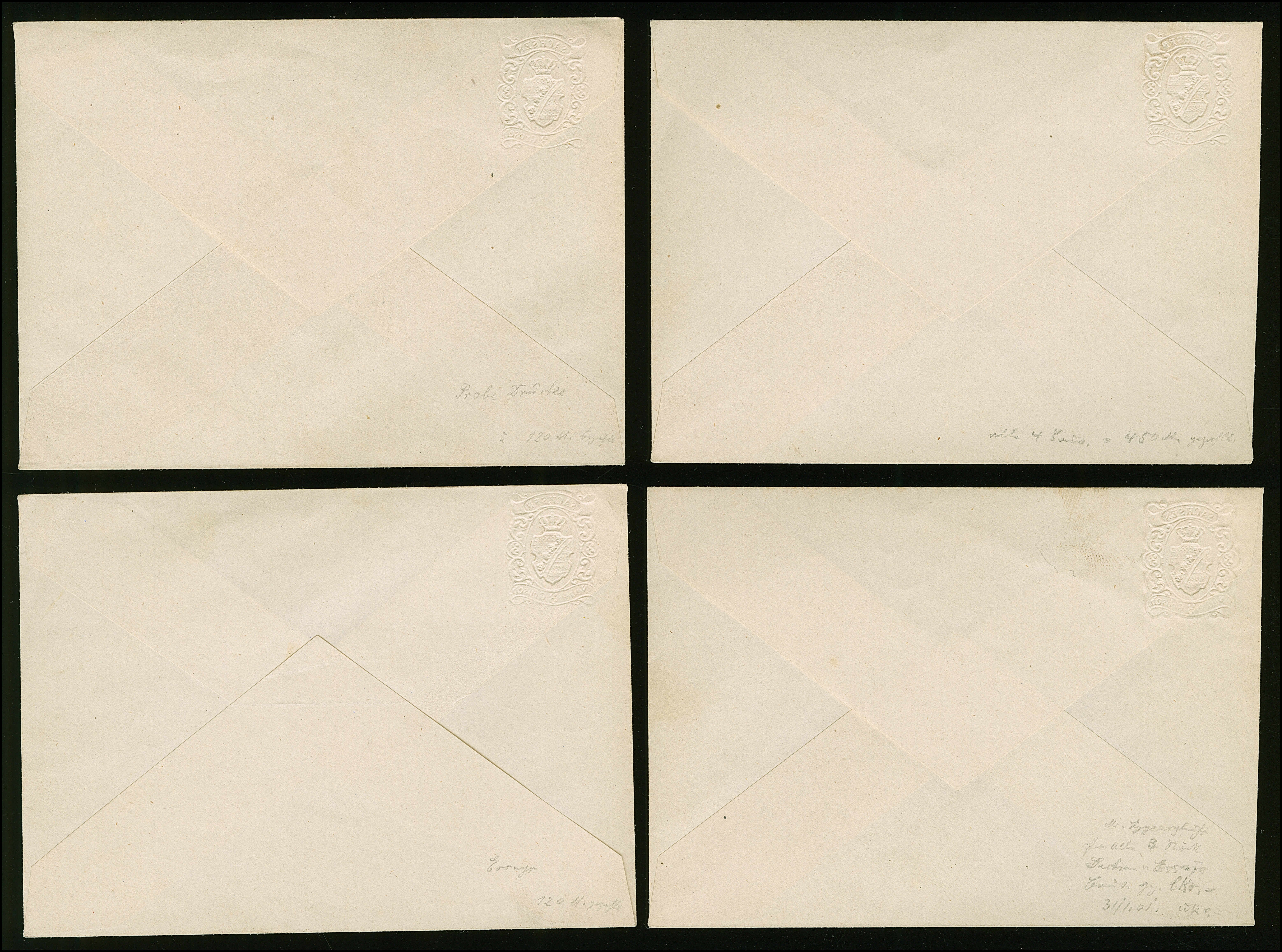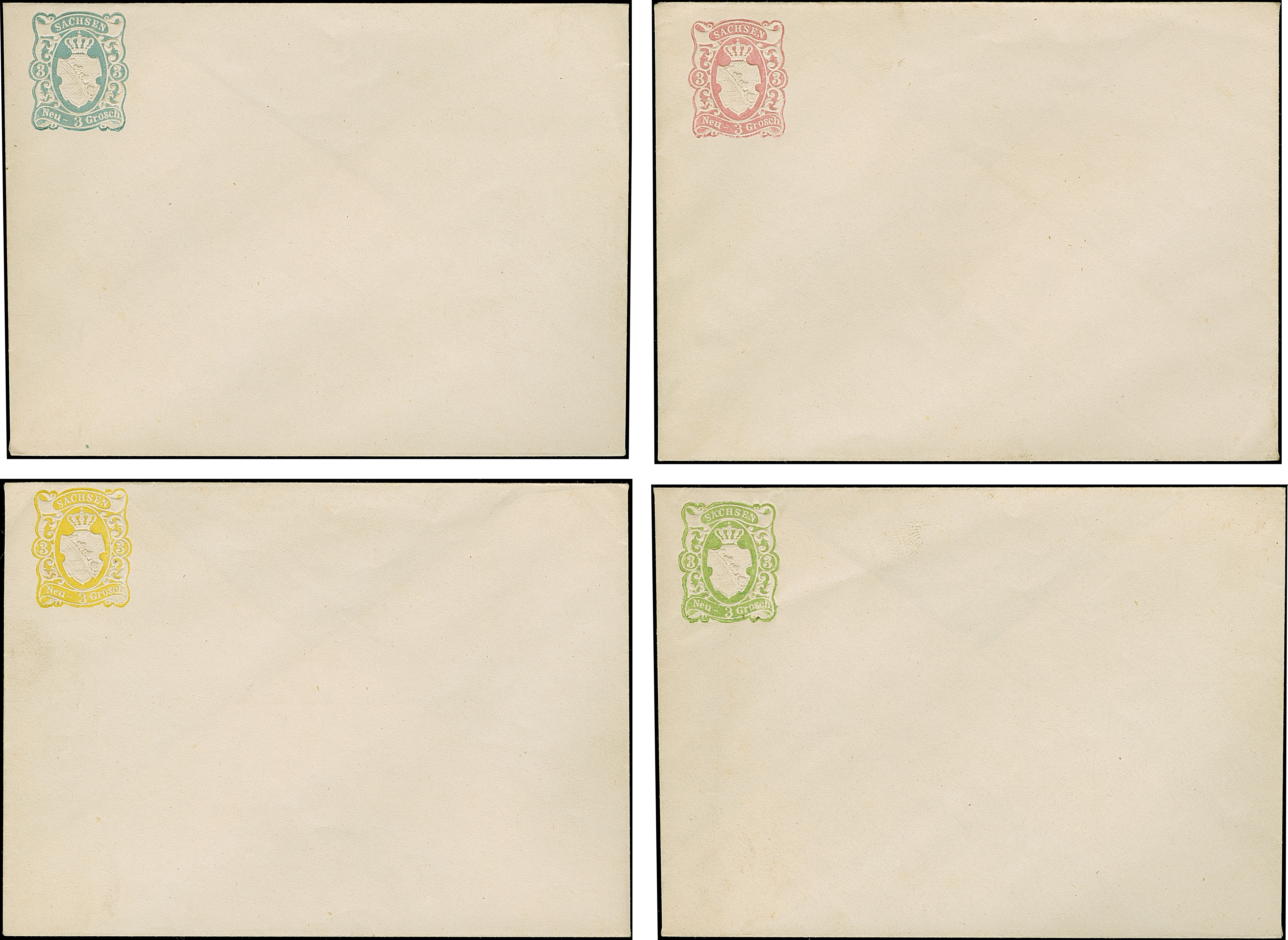 3 Ngr.-Essay-Umschläge der Fa. Bartsch & Dankert in Leipzig in den Farben rotviolett, blaugrau, hellgrün und gelb, die kpl. Serie ungebraucht in sehr schöner Erhaltung. Äußerst selten; PROFI hat nur zwei weitere komplette Sätze dieser Essais registriert.