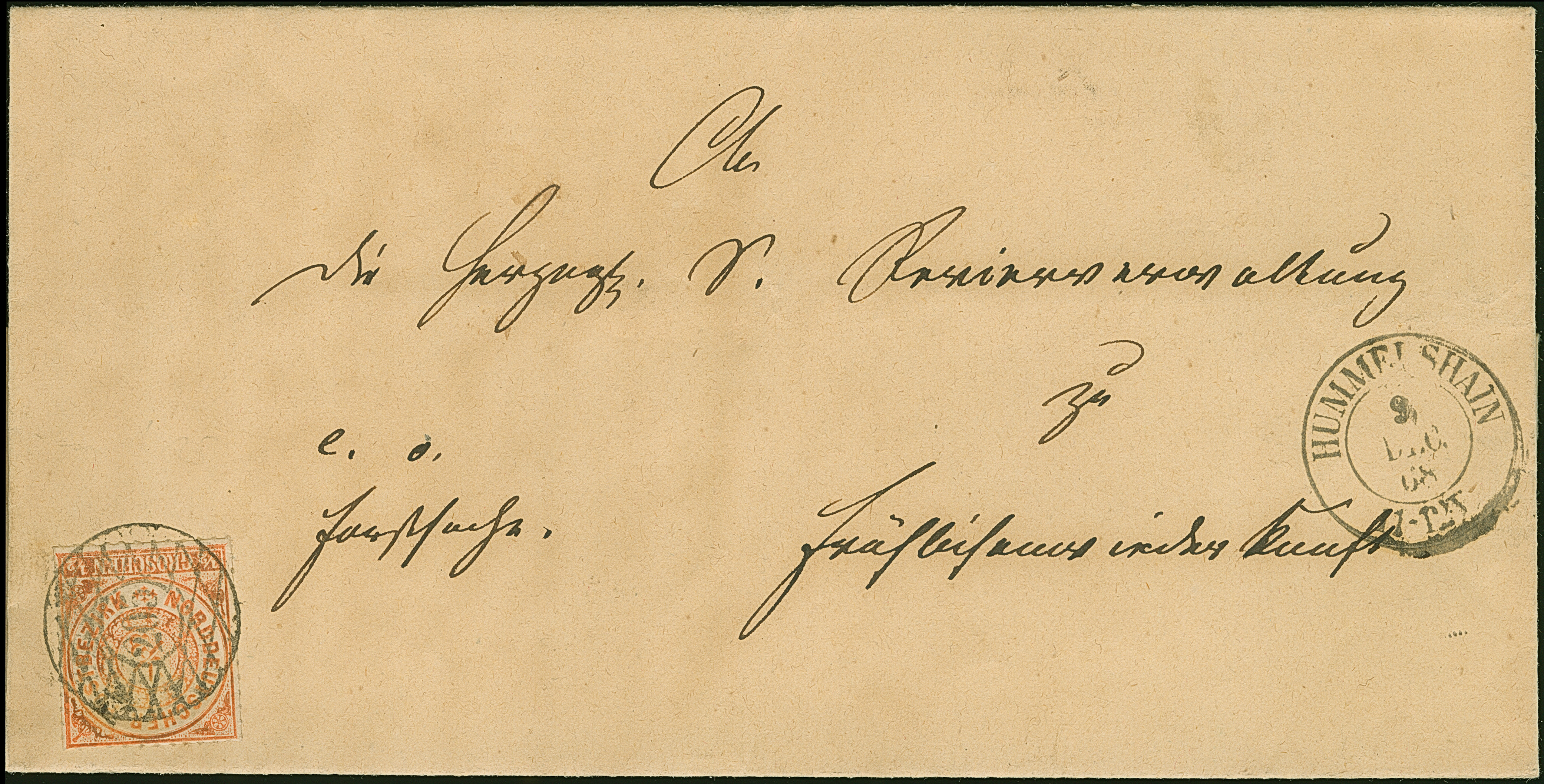 "205" sauber nachverwendet auf NDP 1868, ½ Gr. orange auf Briefhülle mit sauber nebengesetztem DKr. "HUMMELSHAIN 2 DEC. 68"