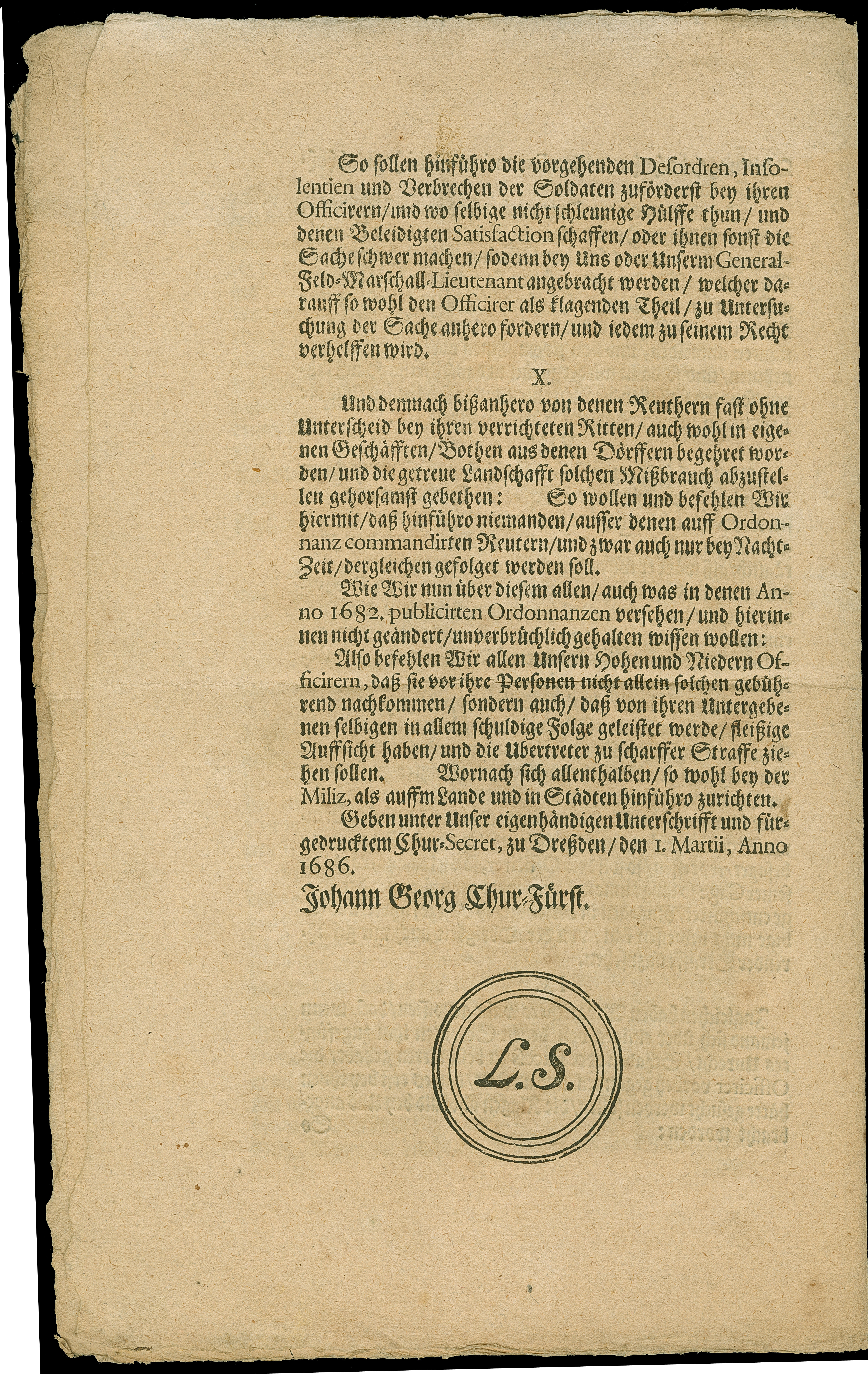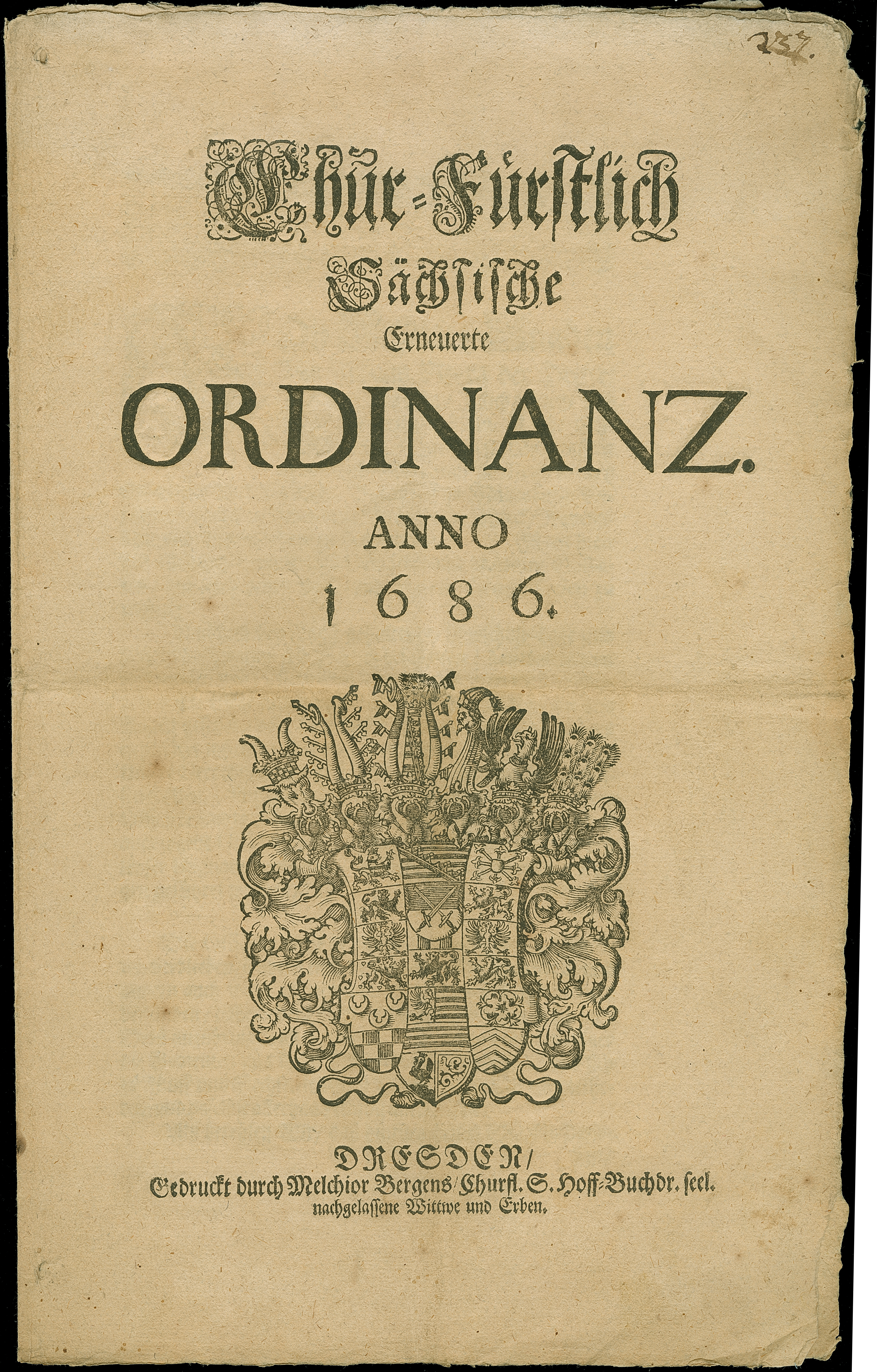 1686, 'Kur-Fürstlich Sächsische Erneuerte Ordinanz. ANNO 1686', 8 S., gedruckt durch Melchior Bergens, Dresden, leicht gefaltet