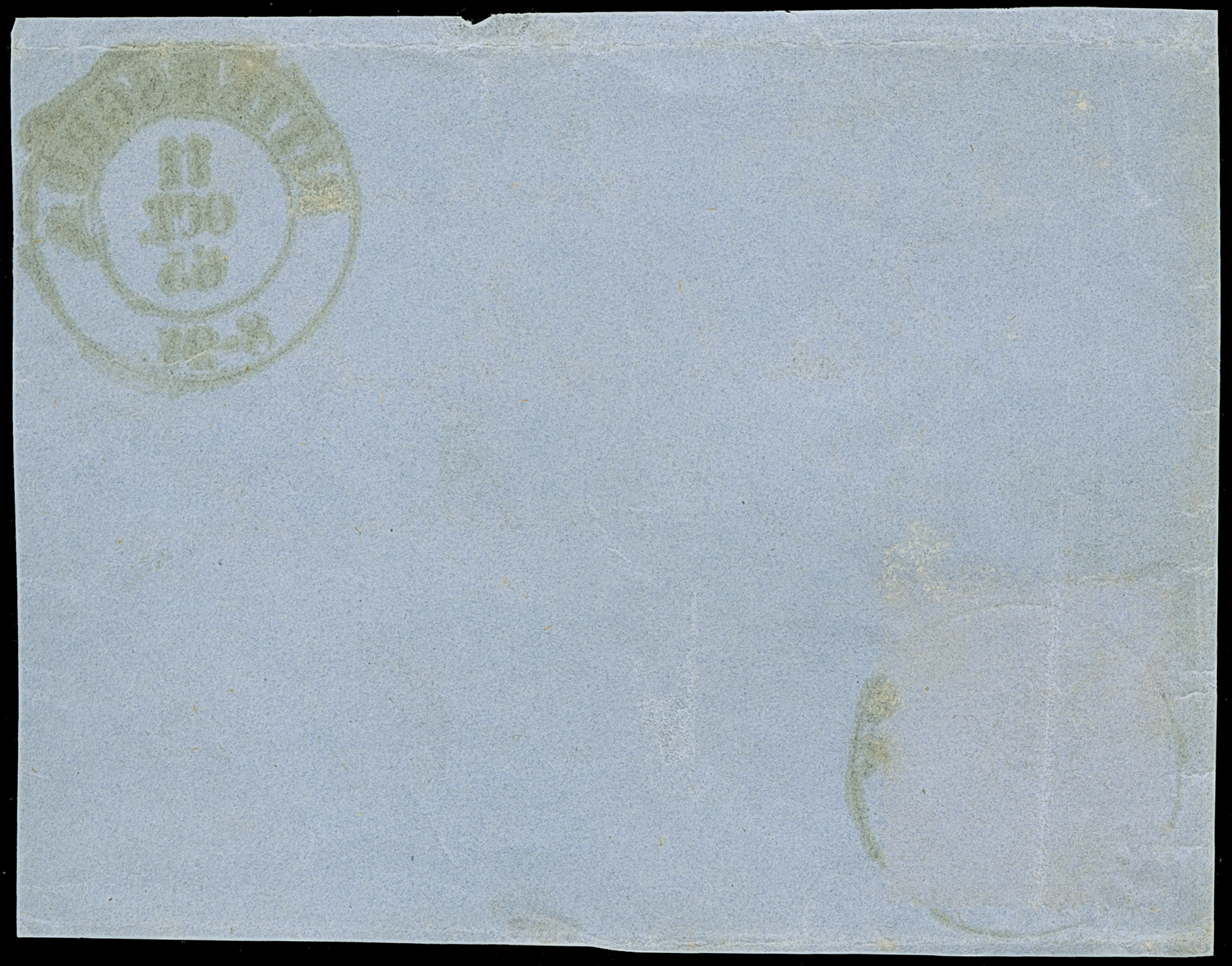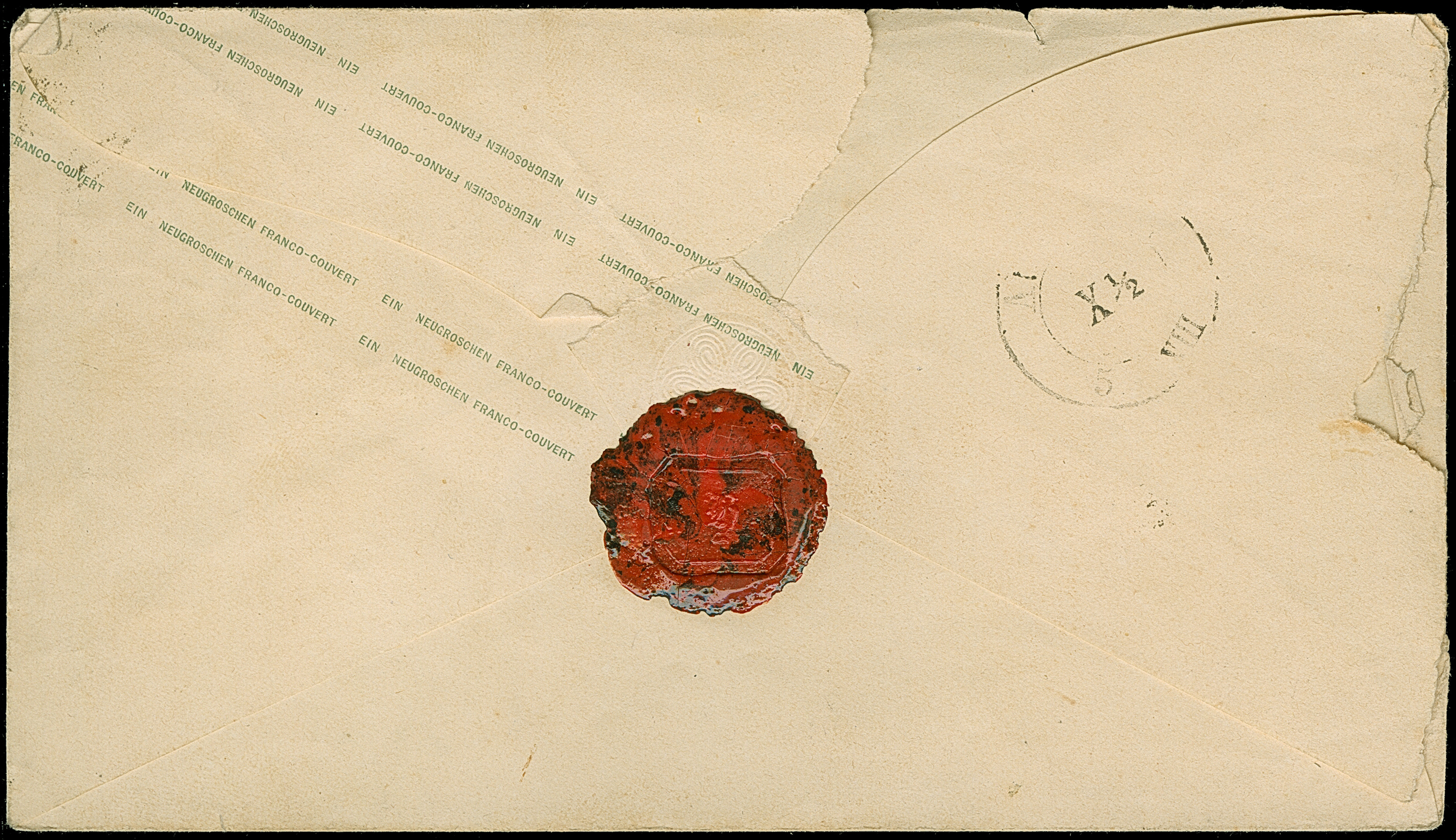 1 Ngr. auf mattgraurot, breitrandig und farbfrisch, mit Vollgitterstempel und nebengesetztem DKr. "LEIPZIG 11 NOV. " (1852) auf Insinuationsdokument nach Lauchstädt in Preußen. Es sind nur wenige Insinuations-Dokumente mit der Friedrich August- Ausgabe registriert.
